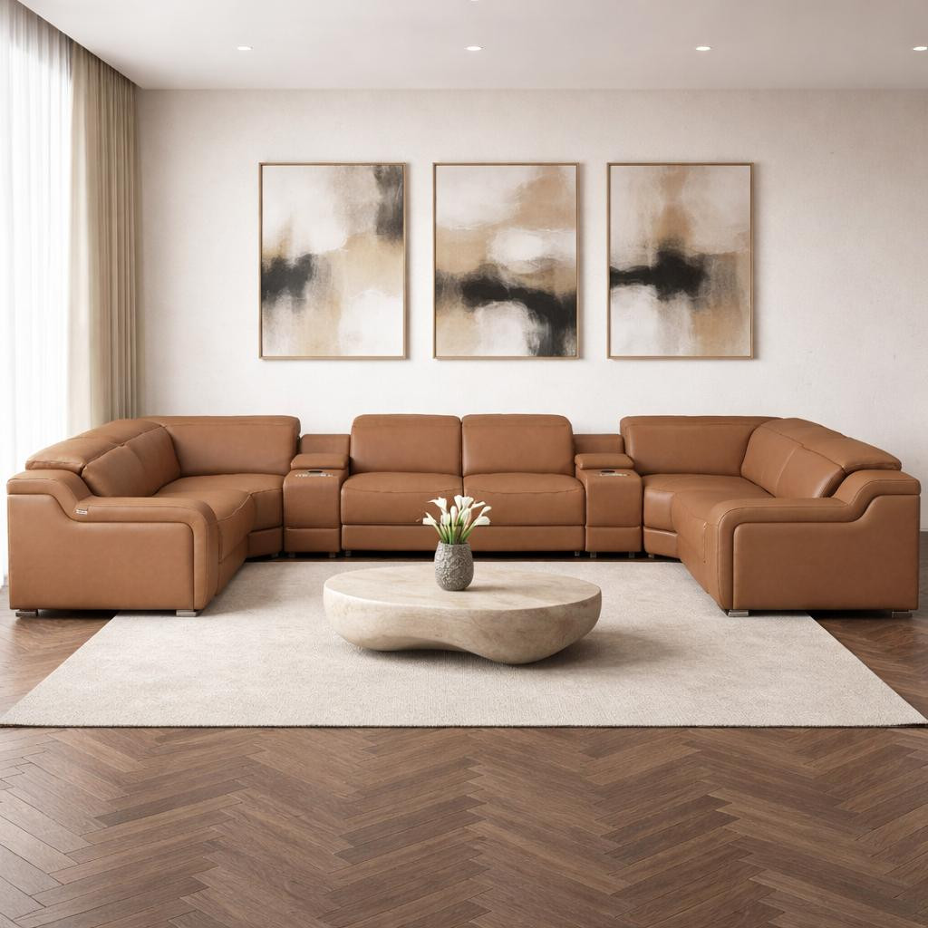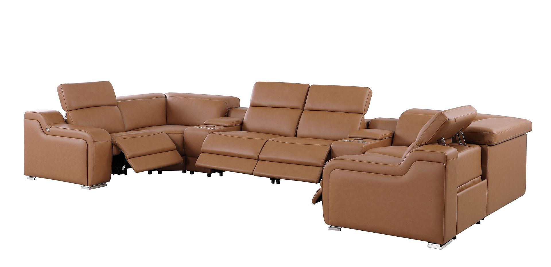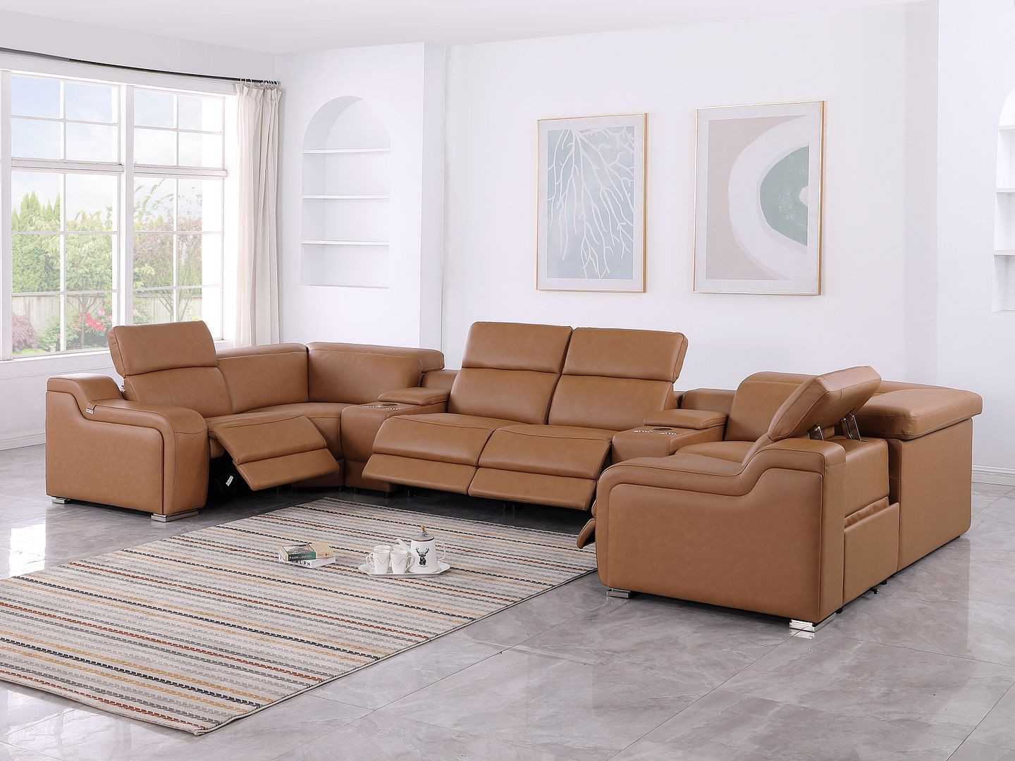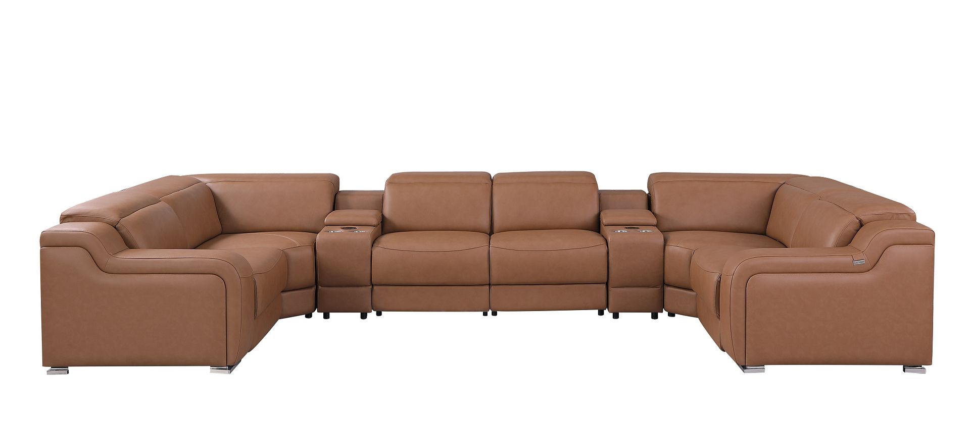 The chestnut italian leather power reclining u shaped eight piece corner sectional with console is spacious design meticulously crafted with extraordinary cushion comfort and ultimate durability so everyone in your home can have the best seat in the house. The high-end premium leather used makes your lounging luxuriously comfortable and adds an elegant appeal to your space. Solid colors give you lots of decorative options and are easy to work into your decor scheme. Square arms offer a comfy place to rest. Power - push button recline allows you to truly rest, lounge and even sleep comfortably. Silver metal legs effortlessly elevate the room and add a touch of contemporary design. A great showpiece for your room, this sectional is a must have. 39-inch h x 174-inch w x 85-inch d.