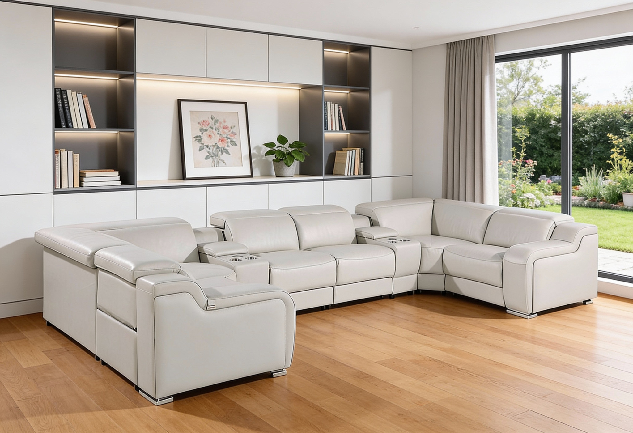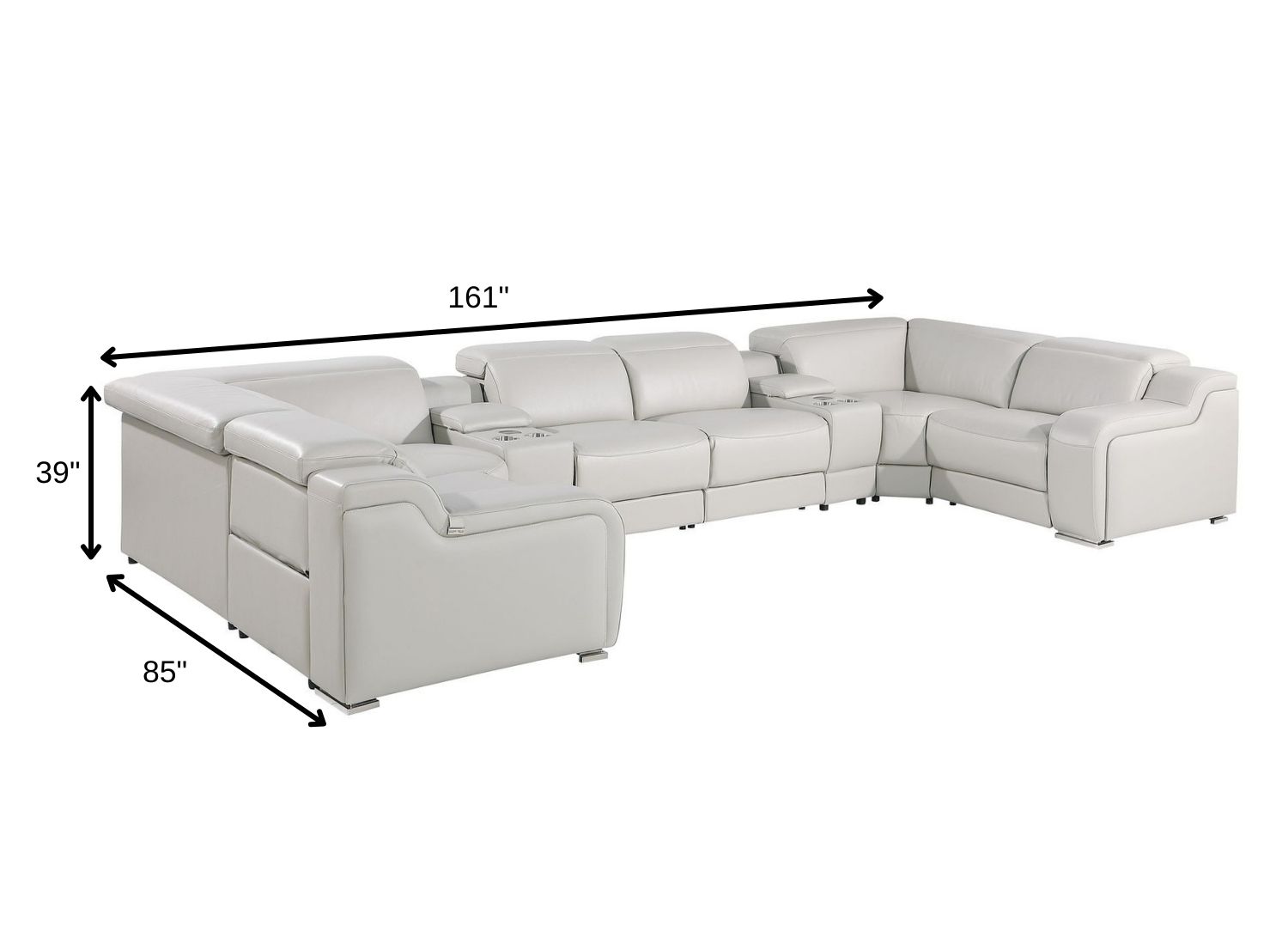 An interior designer's dream, this buttery soft high-grade leather light gray italian leather power reclining u shaped eight piece corner sectional with console will bring just the right touch to your space. The premium leather used makes your lounging luxuriously comfortable and adds an elegant appeal to your space. Solid colors give you lots of decorative options and are easy to work into your decor scheme. Square arms offer a comfy place to rest. Power - push button recline allows you to truly rest, lounge and even sleep comfortably. Silver metal legs effortlessly elevate the room and add a touch of contemporary design. Great for everyday lounging and for entertaining, sectionals are an ideal way to seat multiple people. 39.00-inch h x 161.00-inch w x 85.00-inch d.