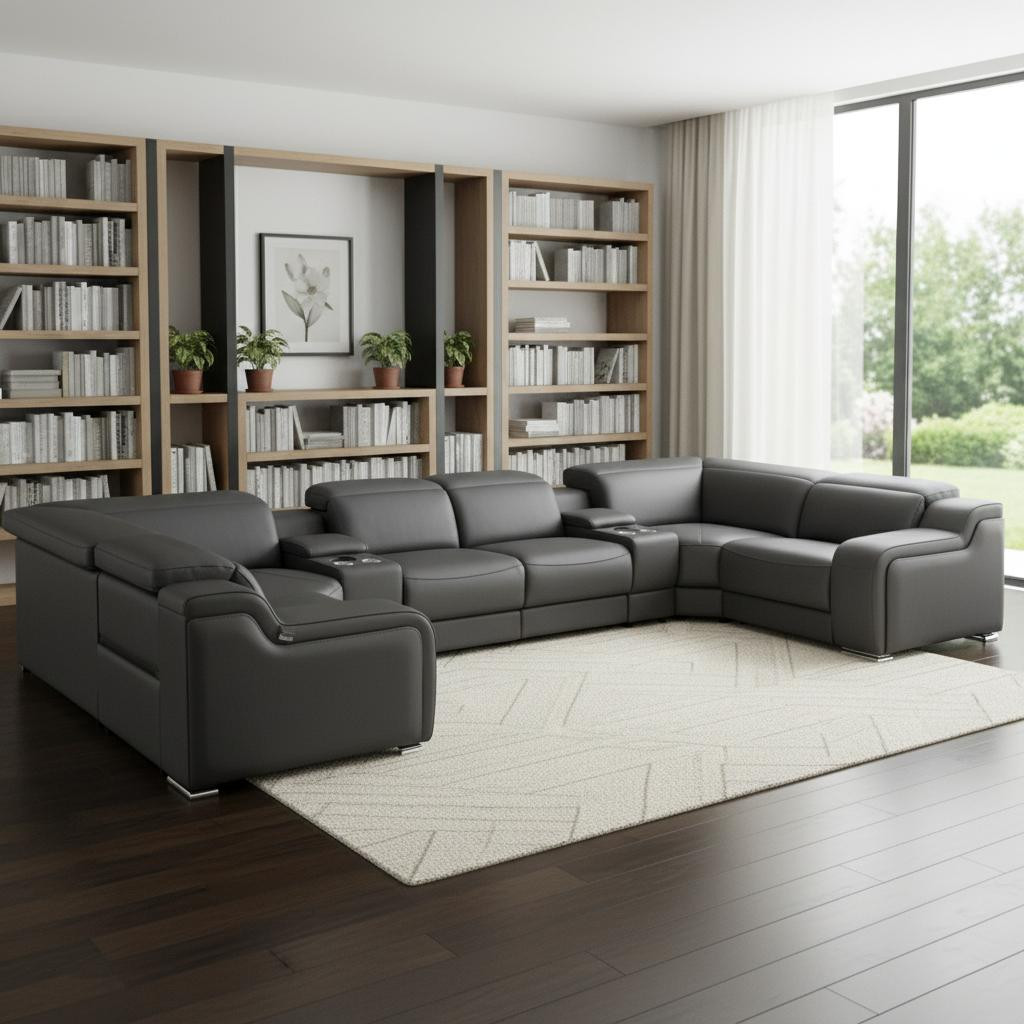 An interior designer's dream, this buttery soft high-grade leather dark gray Italian leather power reclining u shaped eight piece corner sectional with console will bring just the right touch to your space. The premium leather used makes your lounging luxuriously comfortable and adds an elegant appeal to your space. Solid colors give you lots of decorative options and are easy to work into your decor scheme. Square arms offer a comfy place to rest. Power - push button recline allows you to truly rest, lounge and even sleep comfortably. Silver metal legs effortlessly elevate the room and add a touch of contemporary design. Great for everyday lounging and for entertaining, sectionals are an ideal way to seat multiple people. 39.00-inch h x 161.00-inch w x 85.00-inch d.