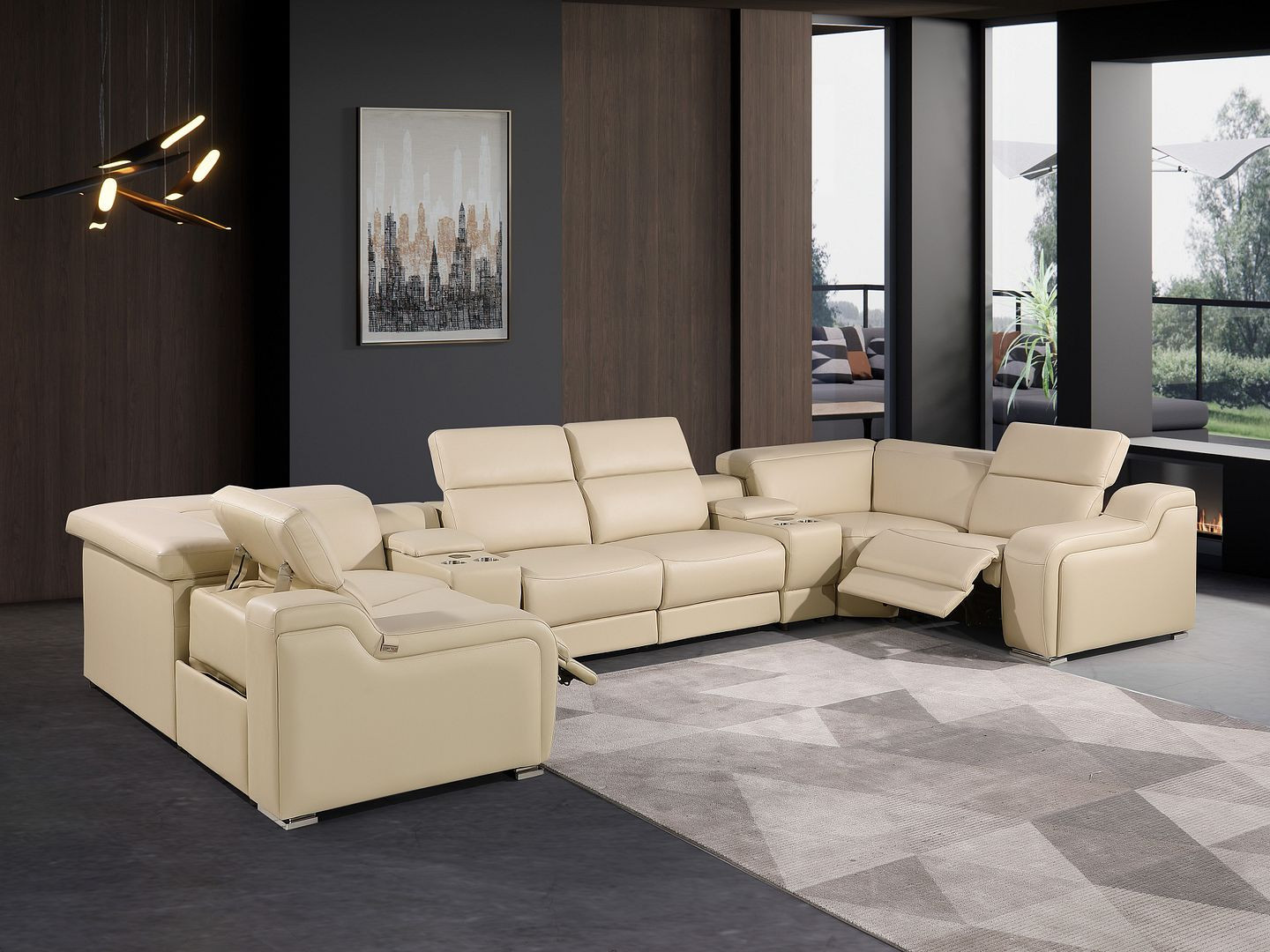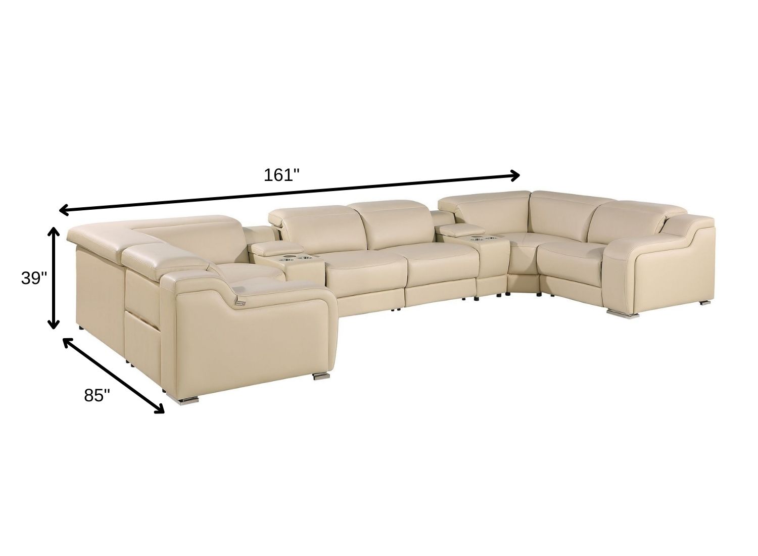 An interior designer's dream, this buttery soft high-grade leather beige Italian leather power reclining u shaped eight piece corner sectional with console will bring just the right touch to your space. The premium leather used makes your lounging luxuriously comfortable and adds an elegant appeal to your space. Solid colors give you lots of decorative options and are easy to work into your decor scheme. Square arms offer a comfy place to rest. Power - push button recline allows you to truly rest, lounge and even sleep comfortably. Silver metal legs effortlessly elevate the room and add a touch of contemporary design. Great for everyday lounging and for entertaining, sectionals are an ideal way to seat multiple people. 39.00-inch h x 161.00-inch w x 85.00-inch d.