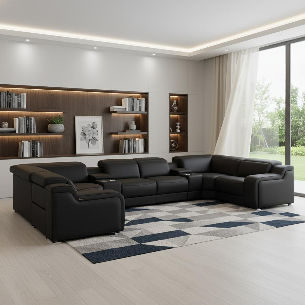 black italian leather power reclining, italian leather power reclining shaped, leather power reclining shaped piece, shaped piece corner sectional console, reclining shaped piece corner sectional |