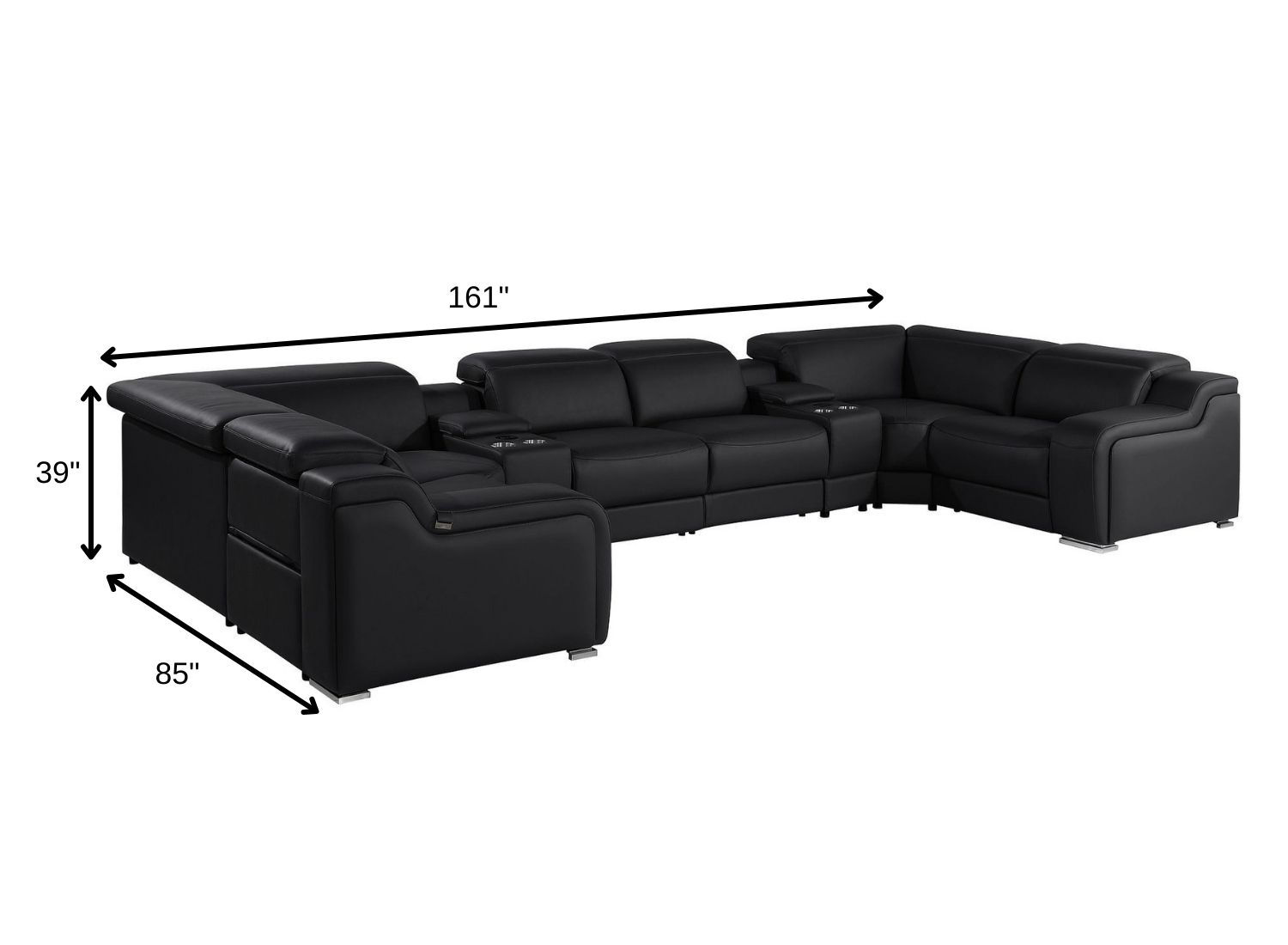 Made of the highest quality, supple leather, this black italian leather power reclining u shaped eight piece corner sectional with console will be the star of your space. The high-grade premium leather used makes your lounging luxuriously comfortable and adds an elegant appeal to your space. Solid colors give you lots of decorative options and are easy to work into your decor scheme. Square arms offer a comfy place to rest. For the ultimate in relaxation, this sectional includes power - push button recline that turns it into a comfy lounge for sleeping or resting. Silver metal legs effortlessly elevate the room and add a touch of contemporary design. Great for everyday lounging and for entertaining, sectionals are an ideal way to seat multiple people. 39.00-inch h x 161.00-inch w x 85.00-inch d.