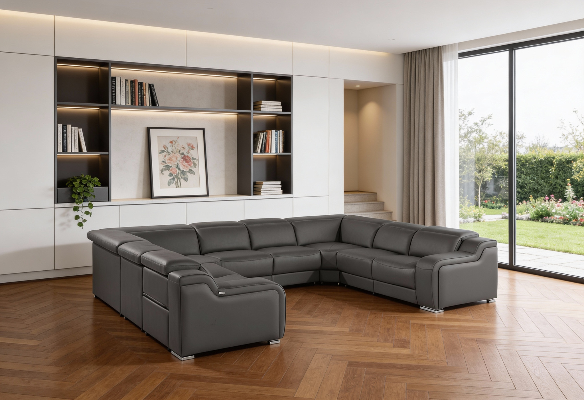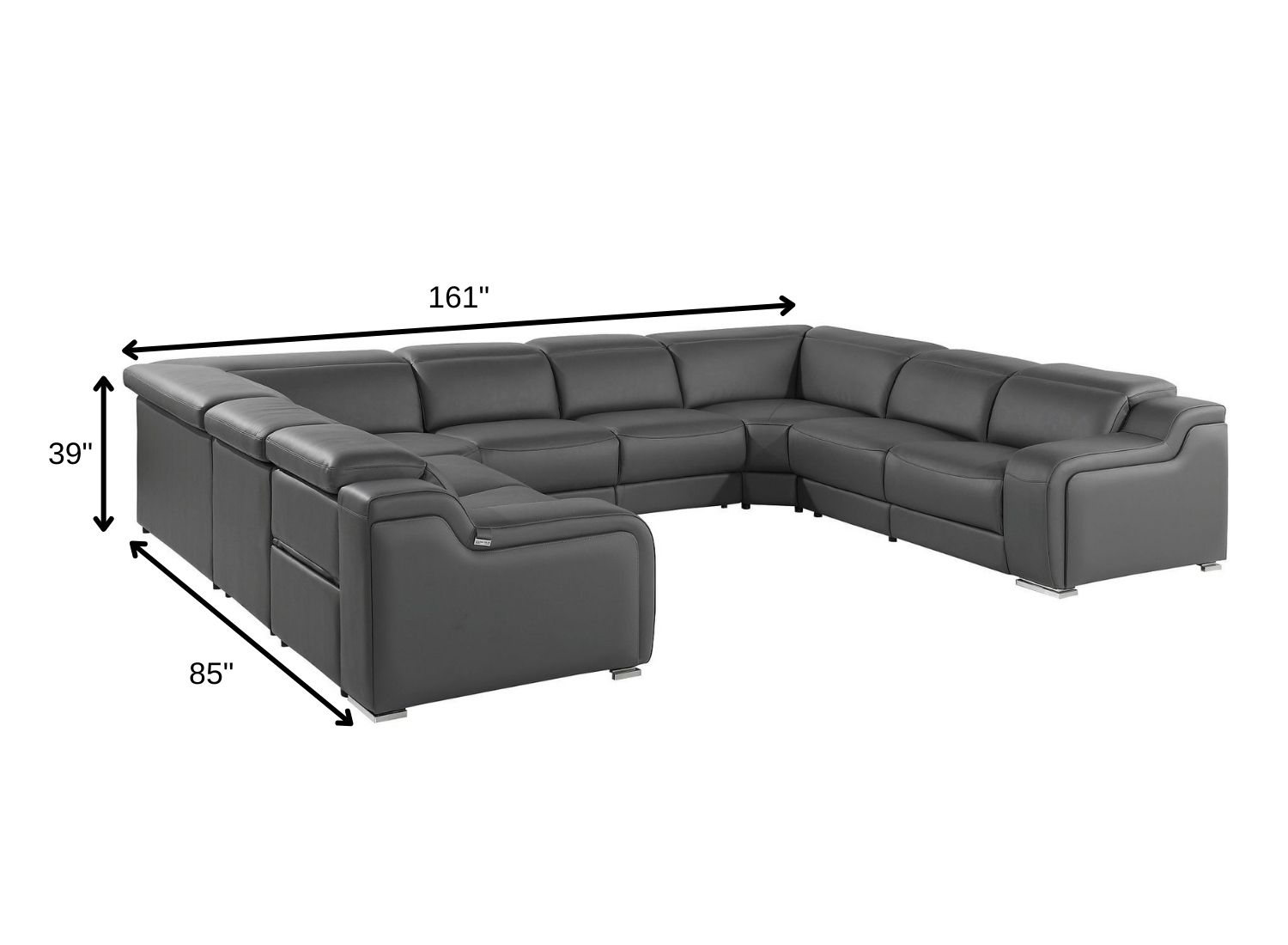 Take your relaxation to the next level with this super soft and comfortable dark gray italian leather power reclining u shaped eight piece corner sectional with console. The high-end premium leather used makes your lounging luxuriously comfortable and adds an elegant appeal to your space. Solid colors give you lots of decorative options and are easy to work into your decor scheme. Square arms offer a comfy place to rest. For the ultimate in relaxation, this sectional includes power - push button recline that turns it into a comfy lounge for sleeping or resting. Silver metal legs effortlessly elevate the room and add a touch of contemporary design. Great for everyday lounging and for entertaining, sectionals are an ideal way to seat multiple people. 39.00-inch h x 161.00-inch w x 85.00-inch d.