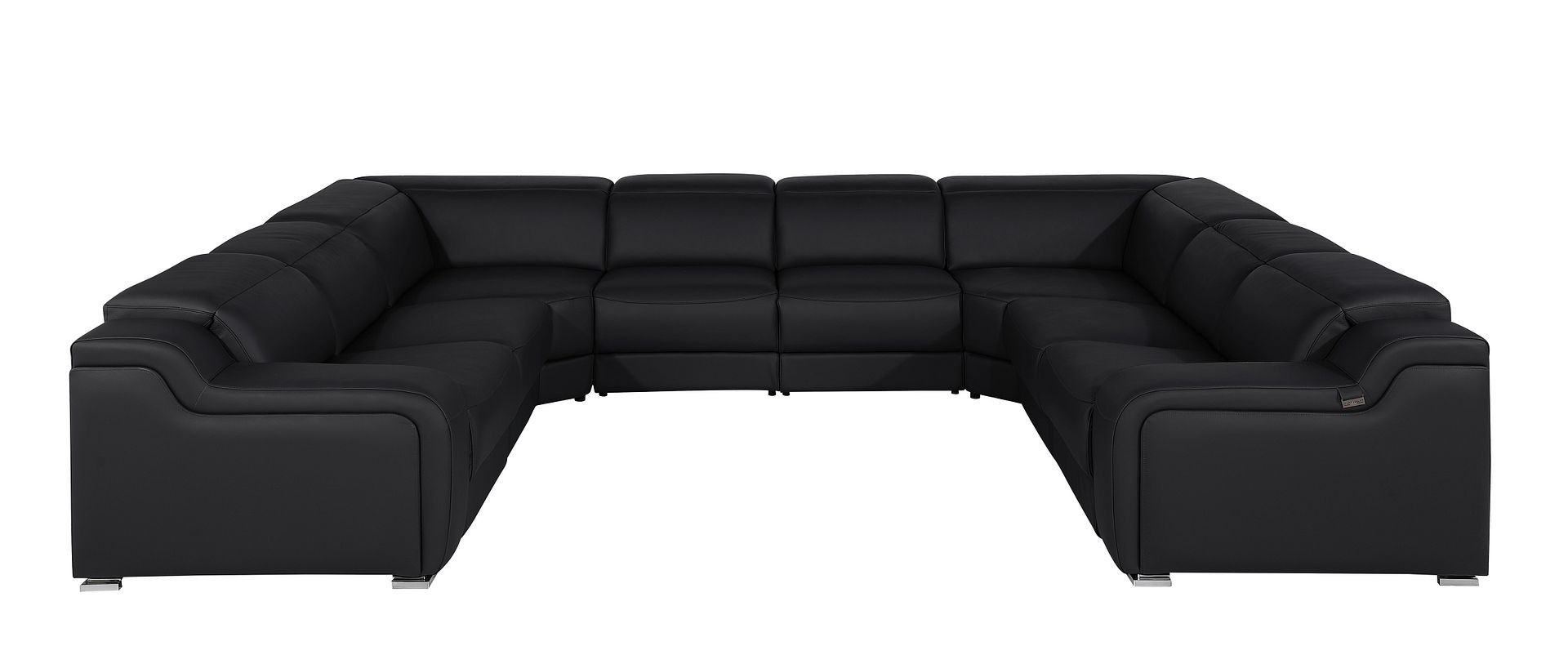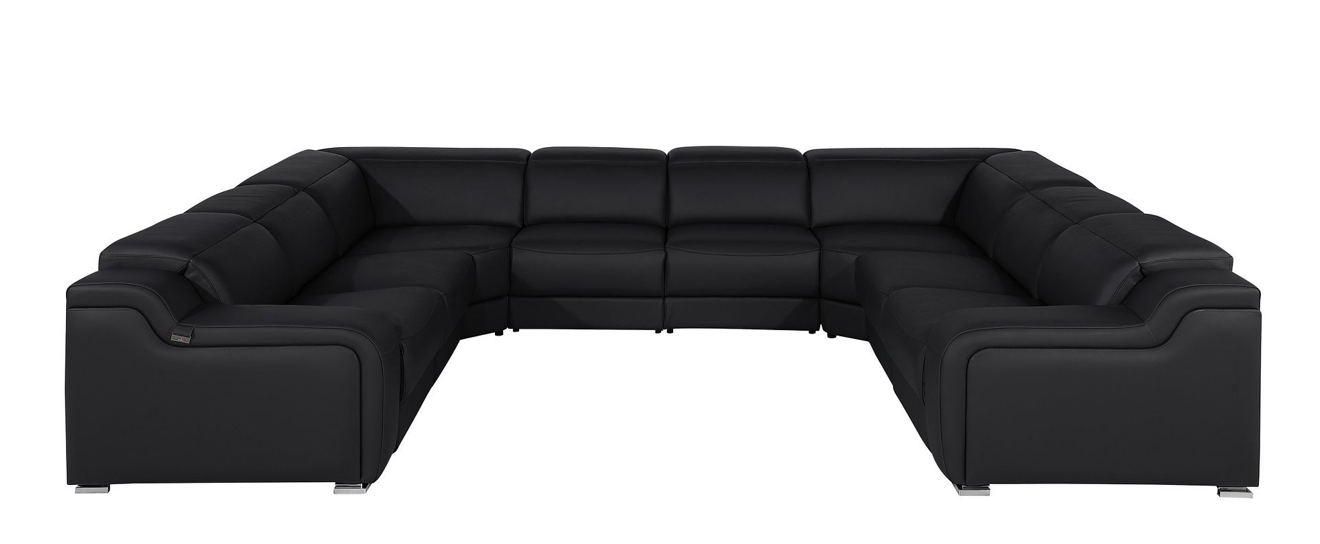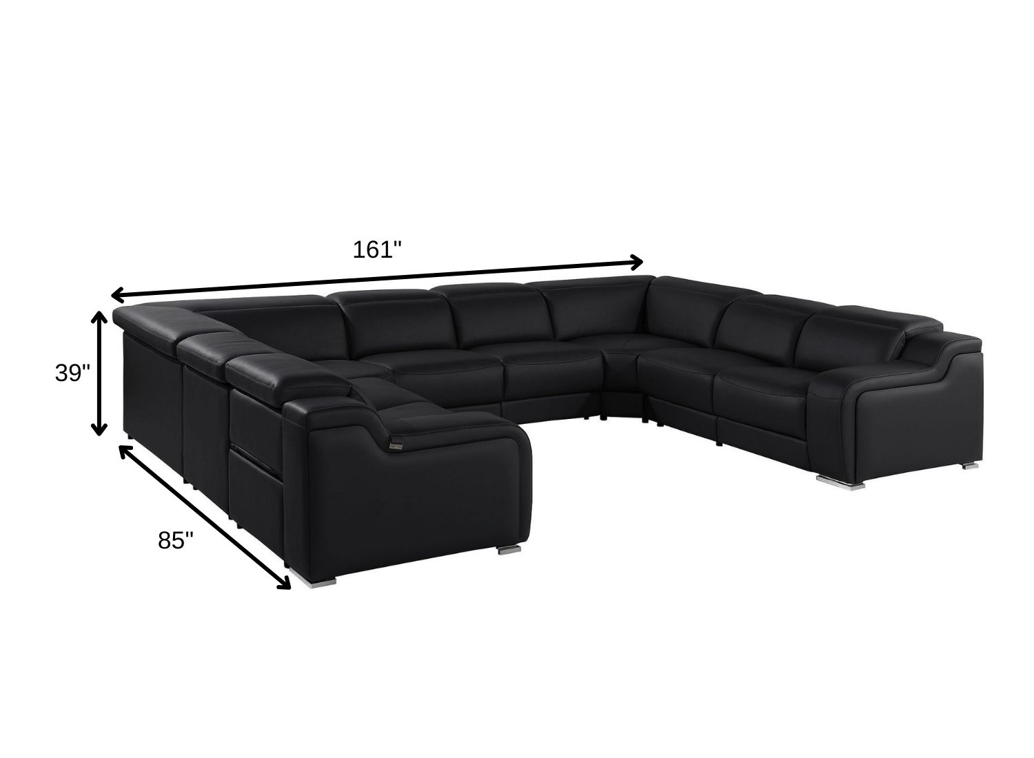 Superior construction from fabulously soft and high-grade leather gives this black italian leather power reclining u shaped eight piece corner sectional with console a leg up on the competition. The premium leather used makes your lounging luxuriously comfortable and adds an elegant appeal to your space. Solid colors give you lots of decorative options and are easy to work into your decor scheme. Square arms offer a comfy place to rest. For the ultimate in relaxation, this sectional includes power - push button recline that turns it into a comfy lounge for sleeping or resting. Silver metal legs effortlessly elevate the room and add a touch of contemporary design. A great showpiece for your room, this sectional is a must have. 39.00-inch h x 161.00-inch w x 85.00-inch d.