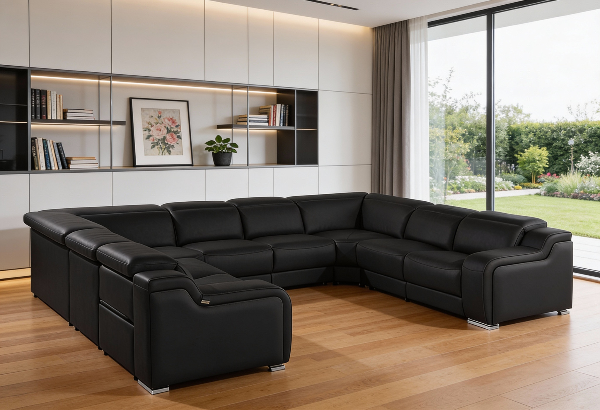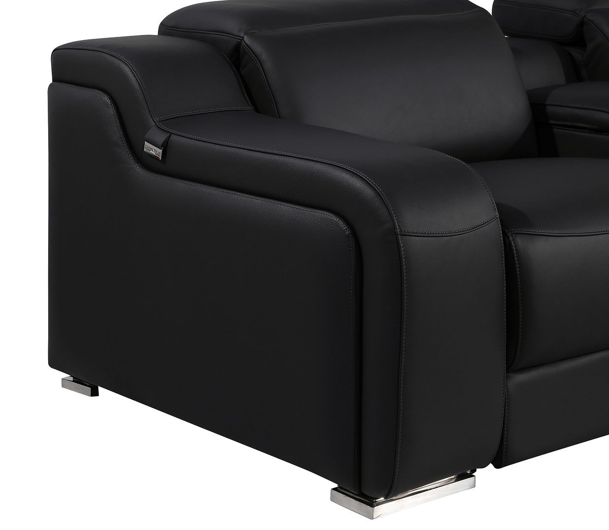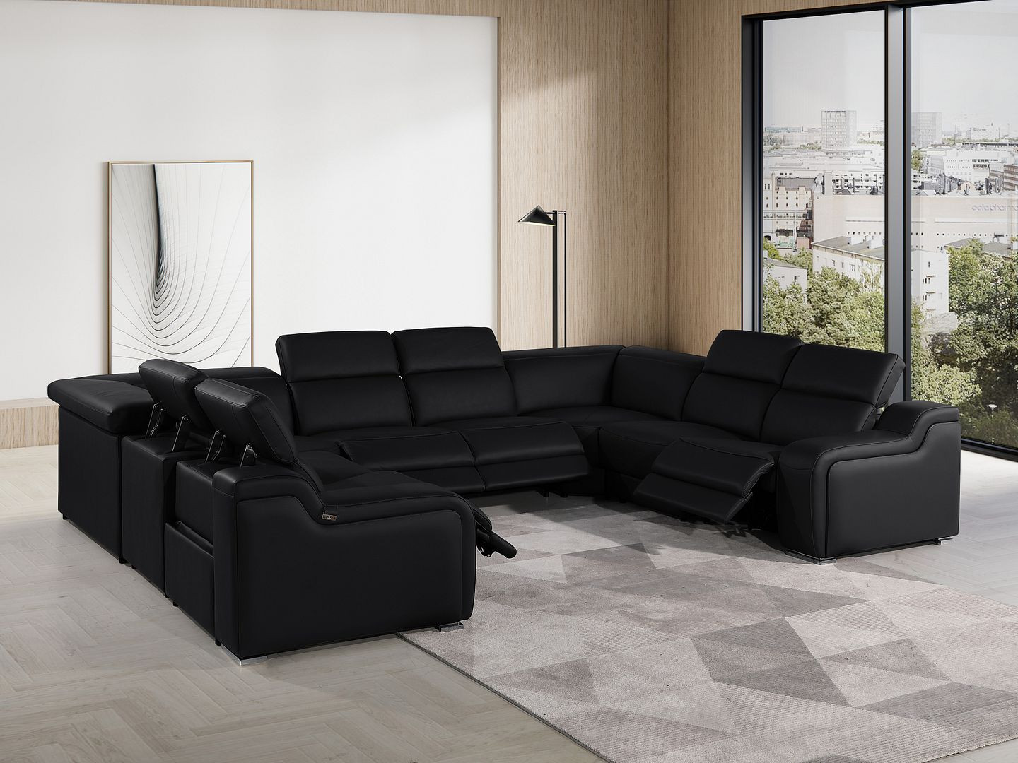 Superior construction from fabulously soft and high-grade leather gives this black italian leather power reclining u shaped eight piece corner sectional with console a leg up on the competition. The premium leather used makes your lounging luxuriously comfortable and adds an elegant appeal to your space. Solid colors give you lots of decorative options and are easy to work into your decor scheme. Square arms offer a comfy place to rest. For the ultimate in relaxation, this sectional includes power - push button recline that turns it into a comfy lounge for sleeping or resting. Silver metal legs effortlessly elevate the room and add a touch of contemporary design. A great showpiece for your room, this sectional is a must have. 39.00-inch h x 161.00-inch w x 85.00-inch d.