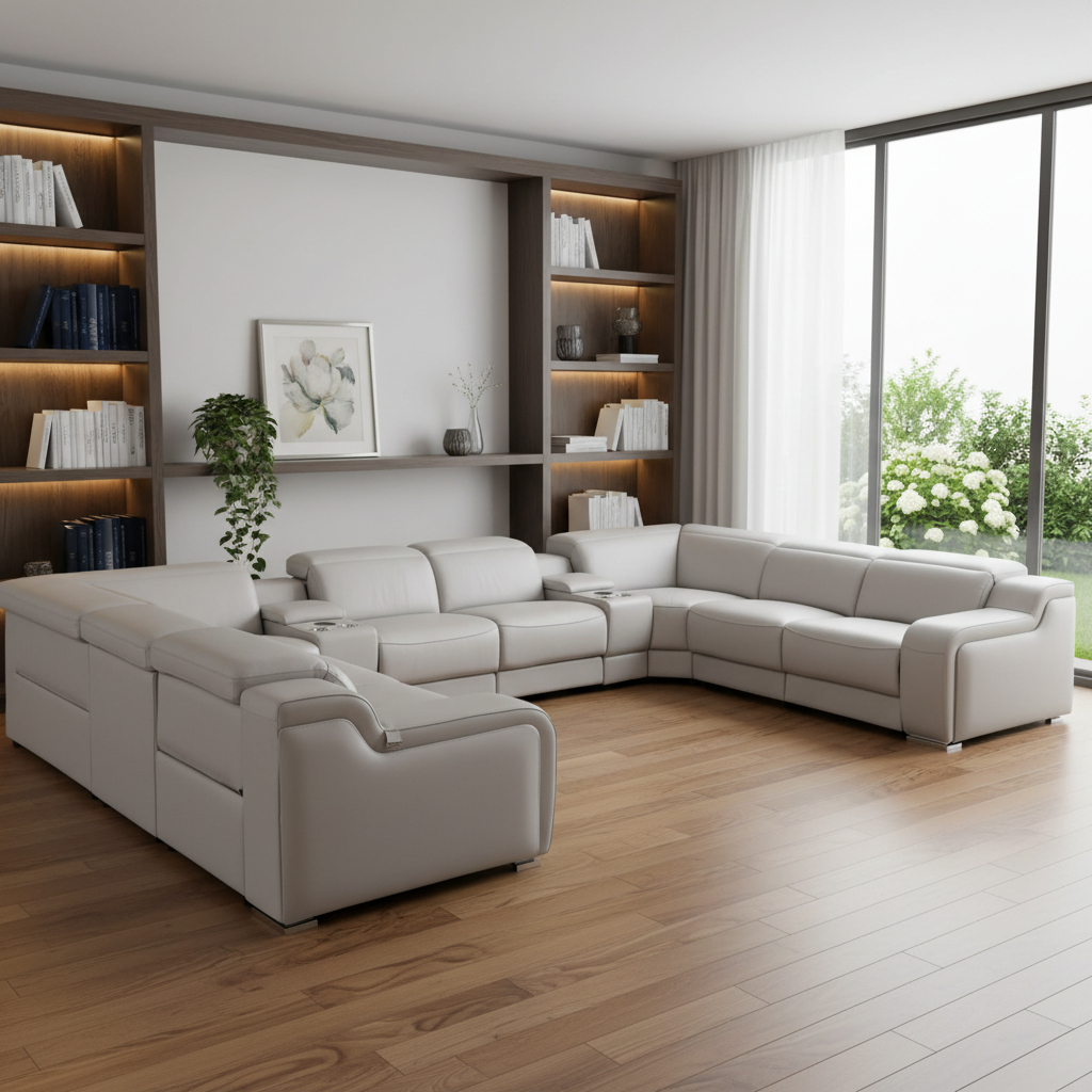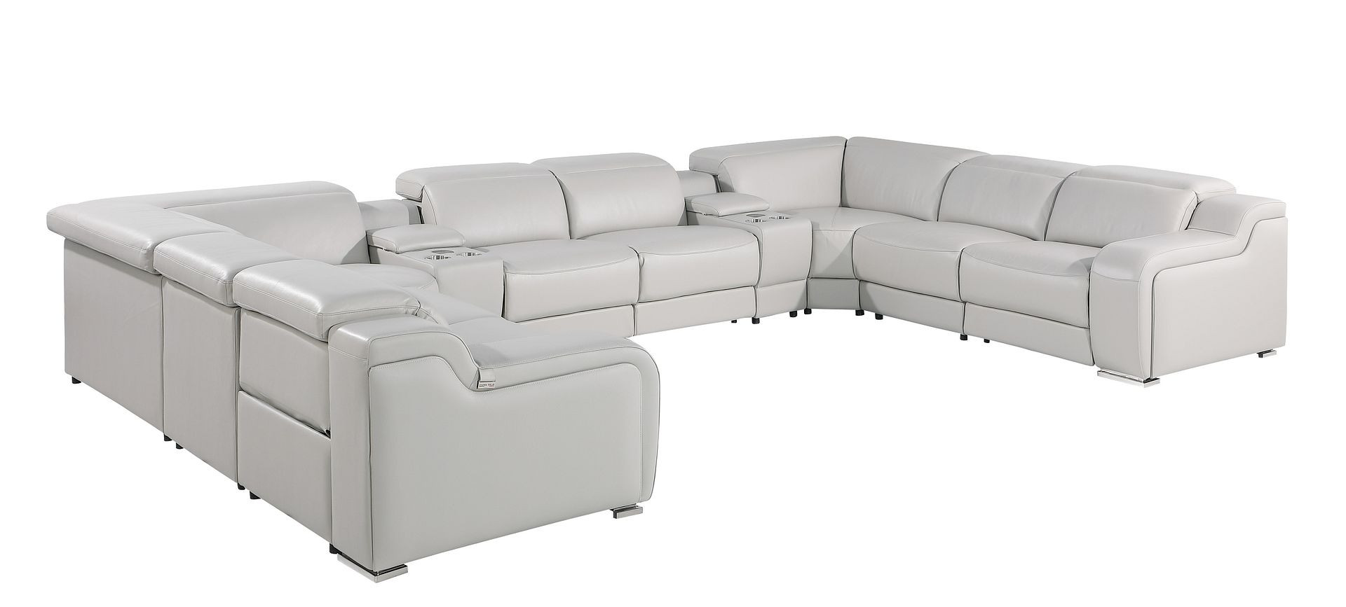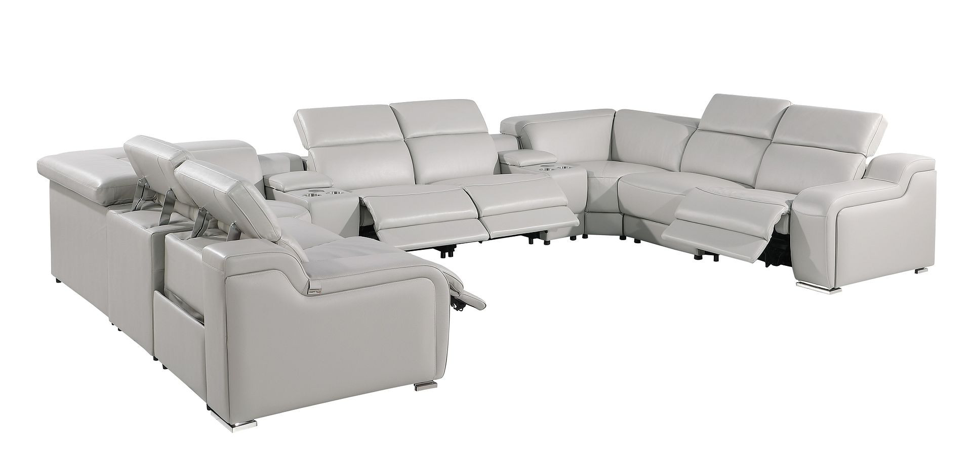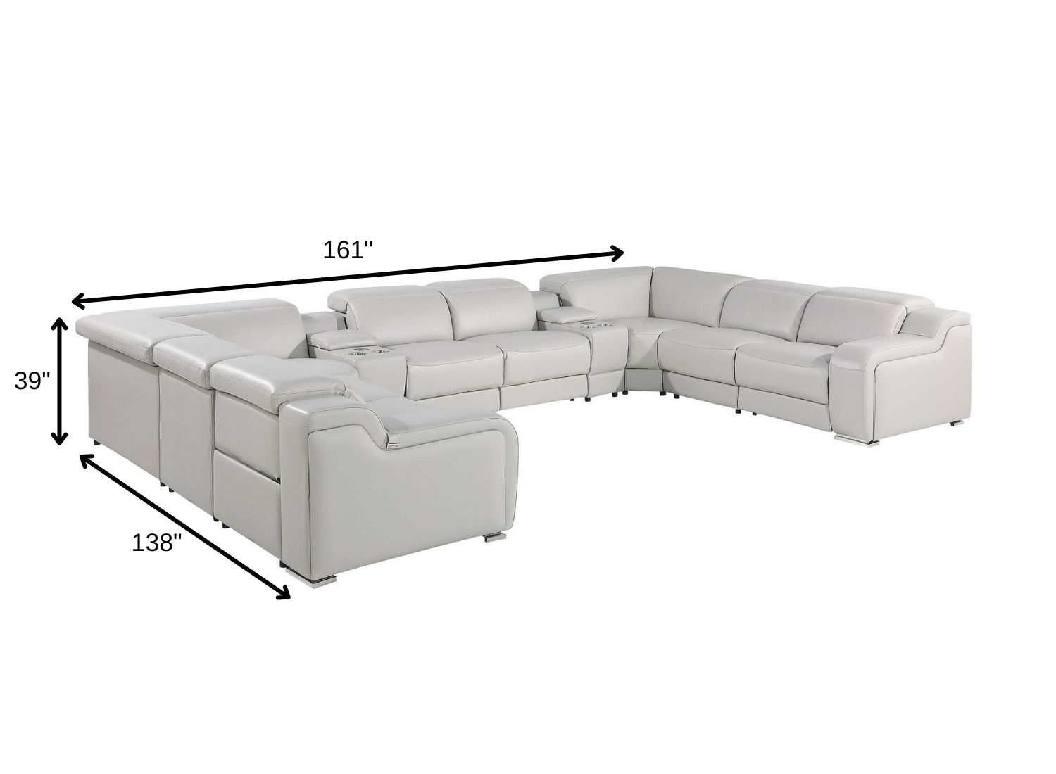 Made of the highest quality, supple leather, this light gray italian leather power reclining u shaped ten piece corner sectional with console will be the star of your space. The high-grade premium leather used makes your lounging luxuriously comfortable and adds an elegant appeal to your space. Solid colors give you lots of decorative options and are easy to work into your decor scheme. Square arms offer a comfy place to rest. For the ultimate in relaxation, this sectional includes power - push button recline that turns it into a comfy lounge for sleeping or resting. Silver metal legs effortlessly elevate the room and add a touch of contemporary design. A great showpiece for your room, this sectional is a must have. 39.00-inch h x 161.00-inch w x 138.00-inch d.