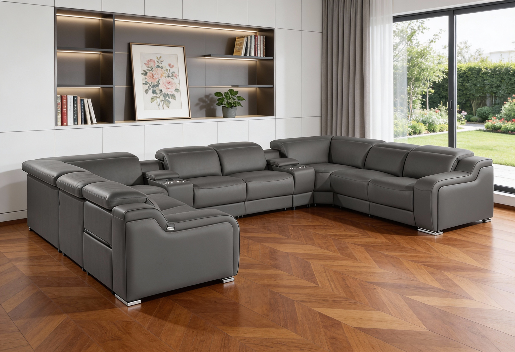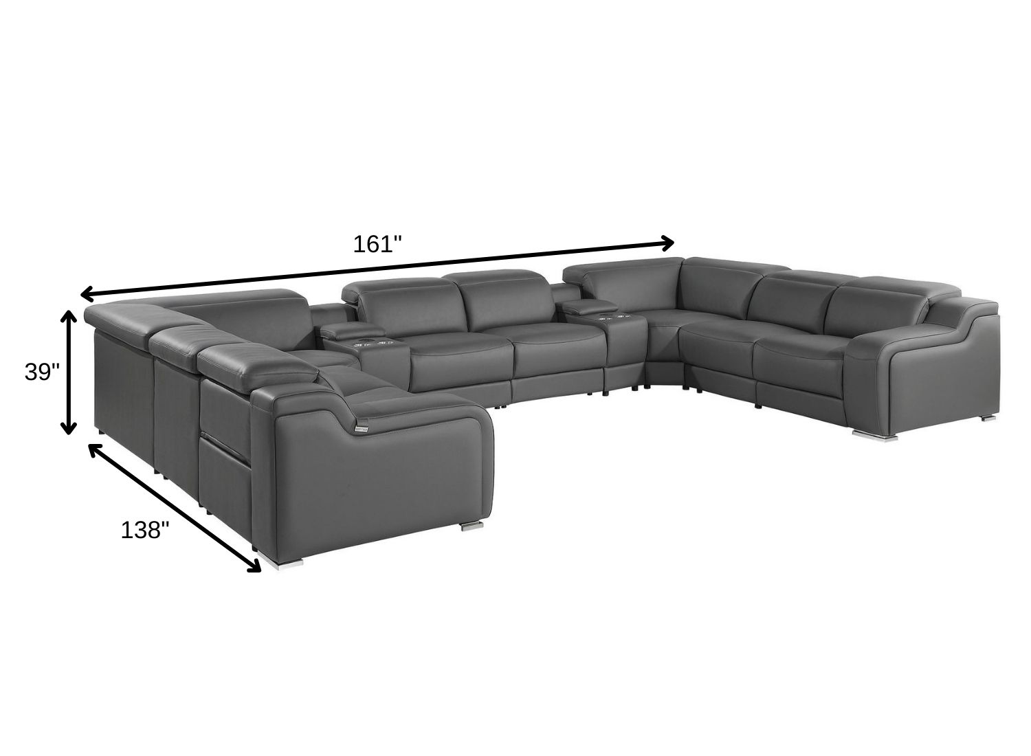 Take your relaxation to the next level with this super soft and comfortable dark gray italian leather power reclining u shaped ten piece corner sectional with console. The high-end premium leather used makes your lounging luxuriously comfortable and adds an elegant appeal to your space. Solid colors give you lots of decorative options and are easy to work into your decor scheme. Square arms offer a comfy place to rest. For the ultimate in relaxation, this sectional includes power - push button recline that turns it into a comfy lounge for sleeping or resting. Silver metal legs effortlessly elevate the room and add a touch of contemporary design. A great showpiece for your room, this sectional is a must have. 39.00-inch h x 161.00-inch w x 138.00-inch d.