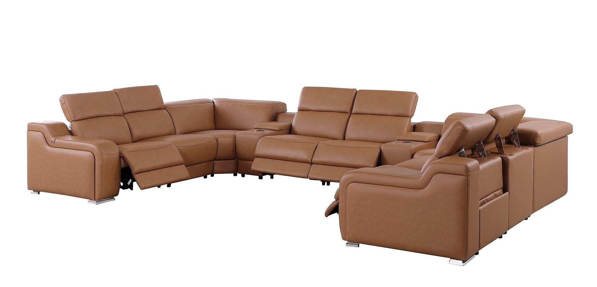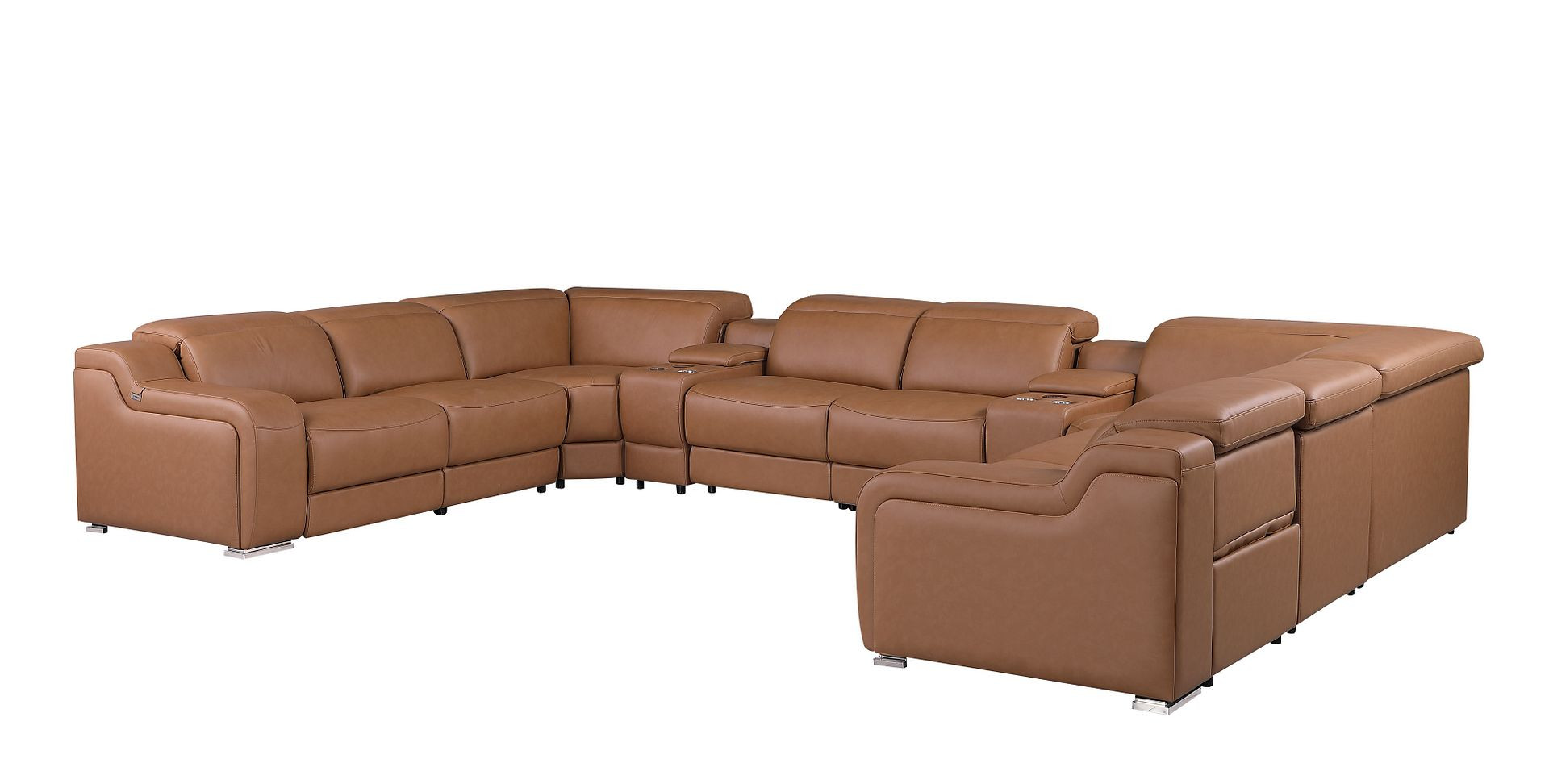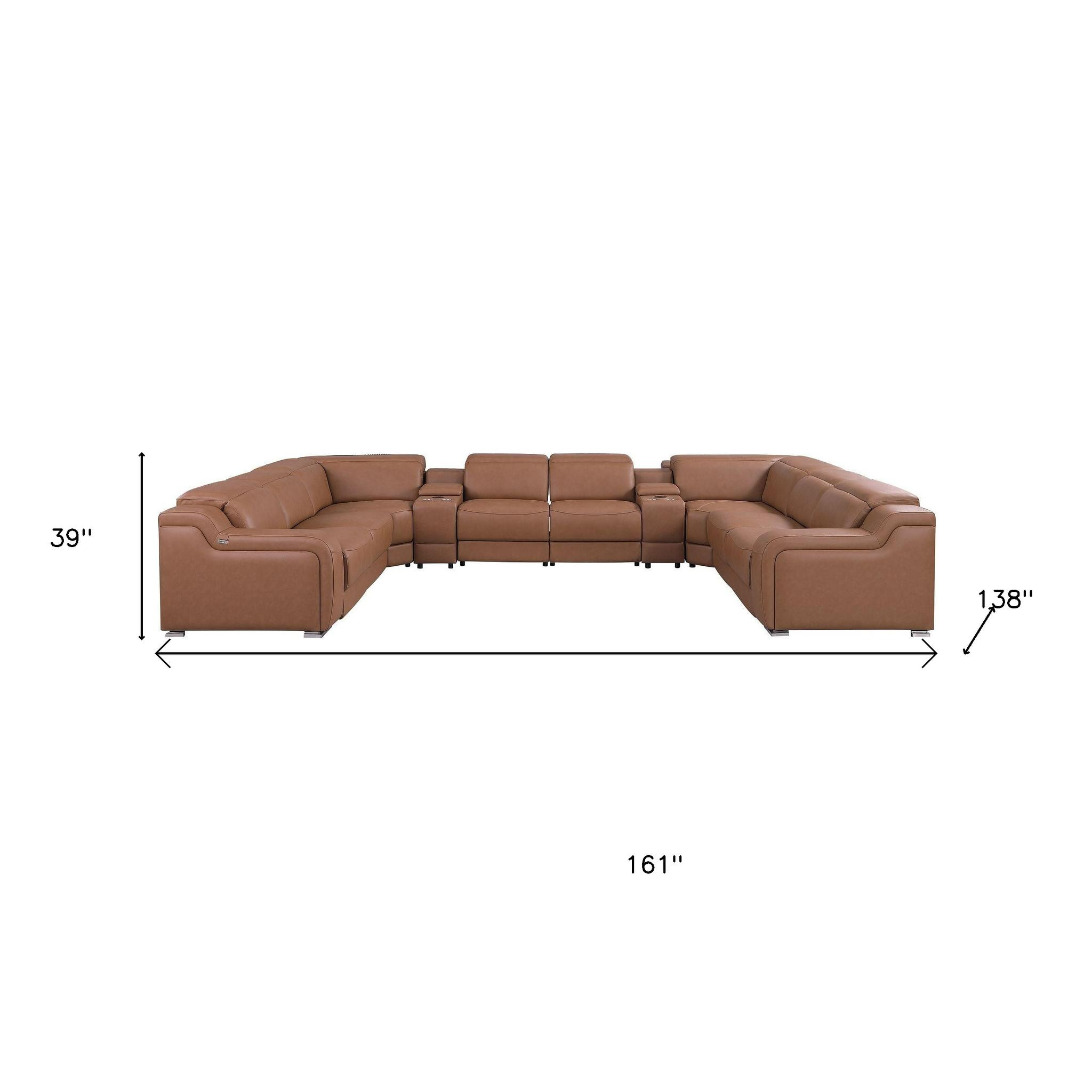 An interior designer's dream, this buttery soft high-grade leather chestnut italian leather power reclining u shaped ten piece corner sectional with console will bring just the right touch to your space. The premium leather used makes your lounging luxuriously comfortable and adds an elegant appeal to your space. Solid colors give you lots of decorative options and are easy to work into your decor scheme. Square arms offer a comfy place to rest. Power - push button recline allows you to truly rest, lounge and even sleep comfortably. Silver metal legs effortlessly elevate the room and add a touch of contemporary design. Great for everyday lounging and for entertaining, sectionals are an ideal way to seat multiple people. 39-inch h x 161-inch w x 138-inch d.