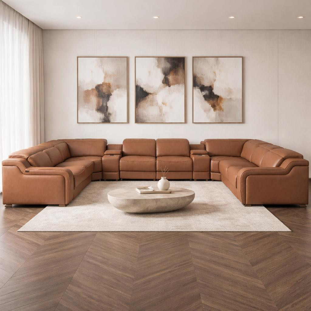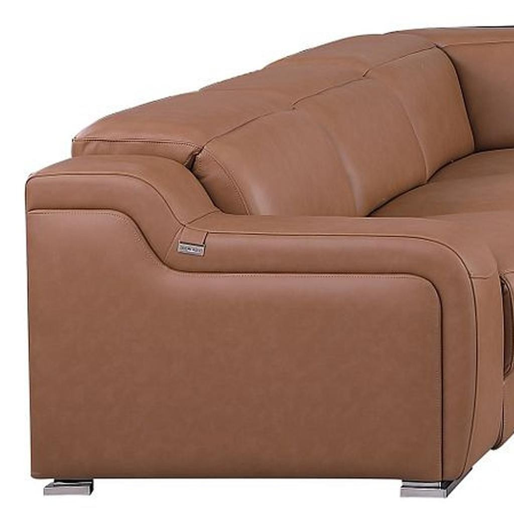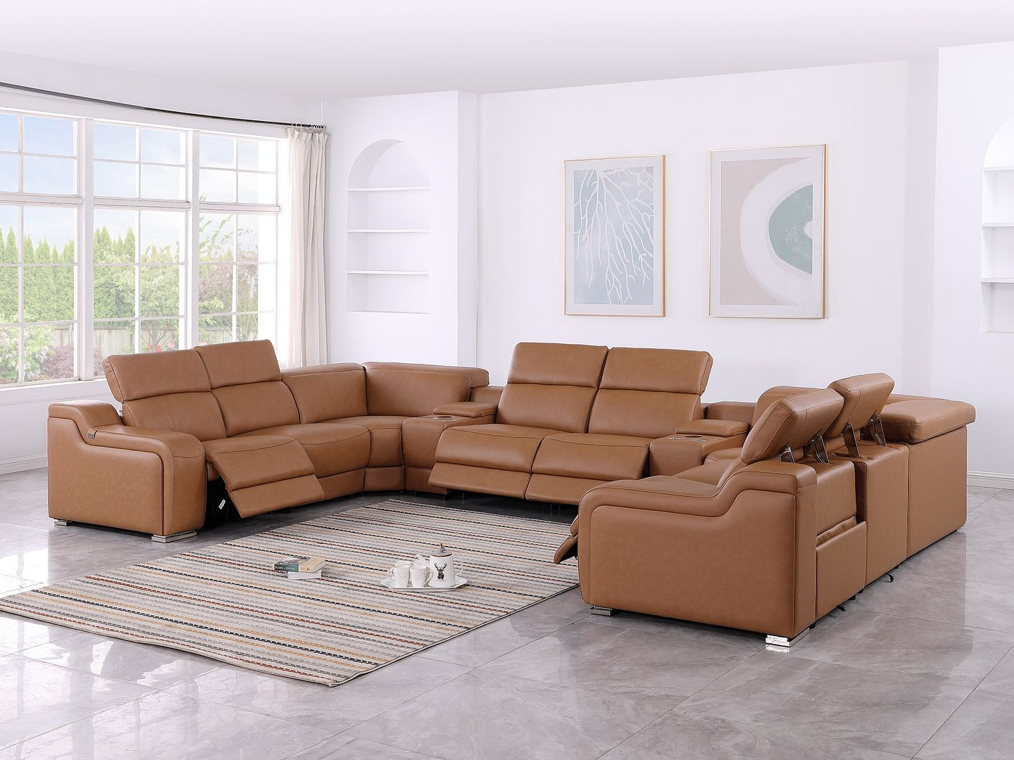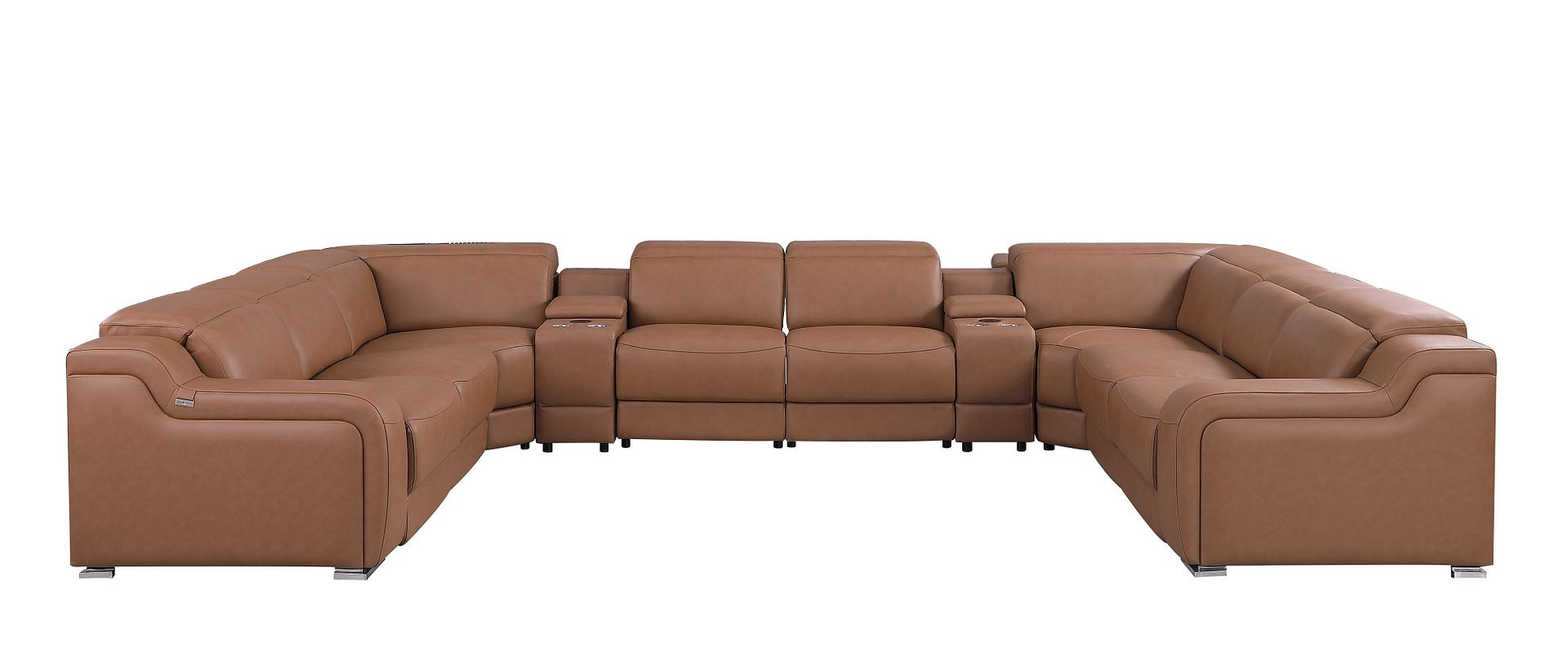 An interior designer's dream, this buttery soft high-grade leather chestnut italian leather power reclining u shaped ten piece corner sectional with console will bring just the right touch to your space. The premium leather used makes your lounging luxuriously comfortable and adds an elegant appeal to your space. Solid colors give you lots of decorative options and are easy to work into your decor scheme. Square arms offer a comfy place to rest. Power - push button recline allows you to truly rest, lounge and even sleep comfortably. Silver metal legs effortlessly elevate the room and add a touch of contemporary design. Great for everyday lounging and for entertaining, sectionals are an ideal way to seat multiple people. 39-inch h x 161-inch w x 138-inch d.