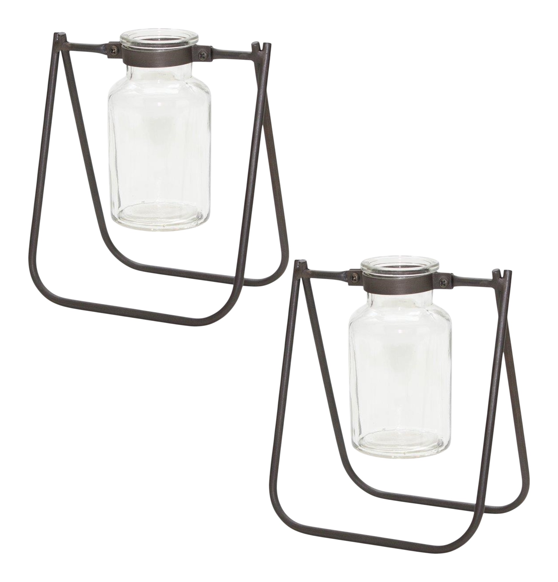 With or without flowers, this set of two clear and brown glass and metal round table vases makes a great gift or decorative accent for your space. Featuring a unique glass jar design that is suspended by a metal wire stand. Crafted from a blend of sturdy glass and sleek metal, these vases are both elegant and durable. Their clear and brown tones create a harmonious contrast, allowing your floral arrangements to shine. Perfect for coffee tables, dining areas, or as a centerpiece, this versatile set can enhance any room's ambiance effortlessly. 6.75-inch h x 6.00-inch w x 4.00-inch d.