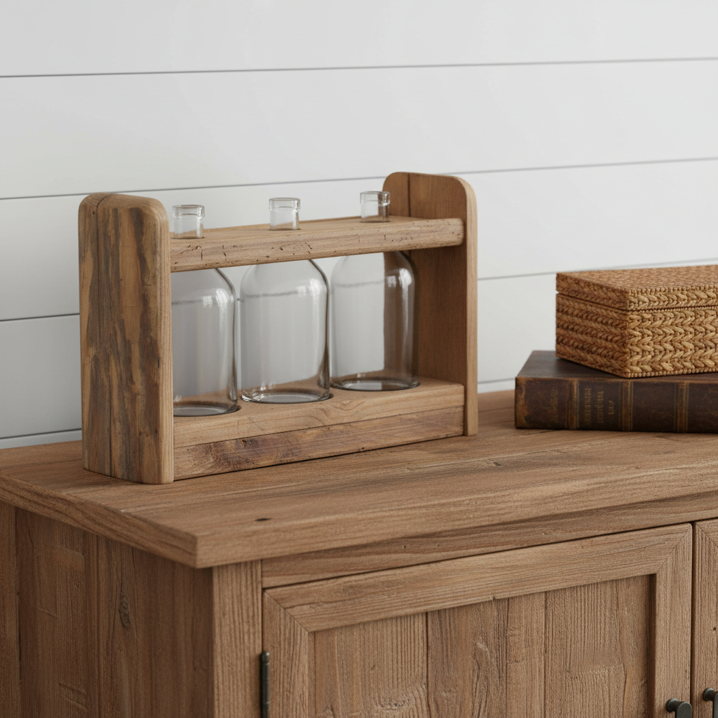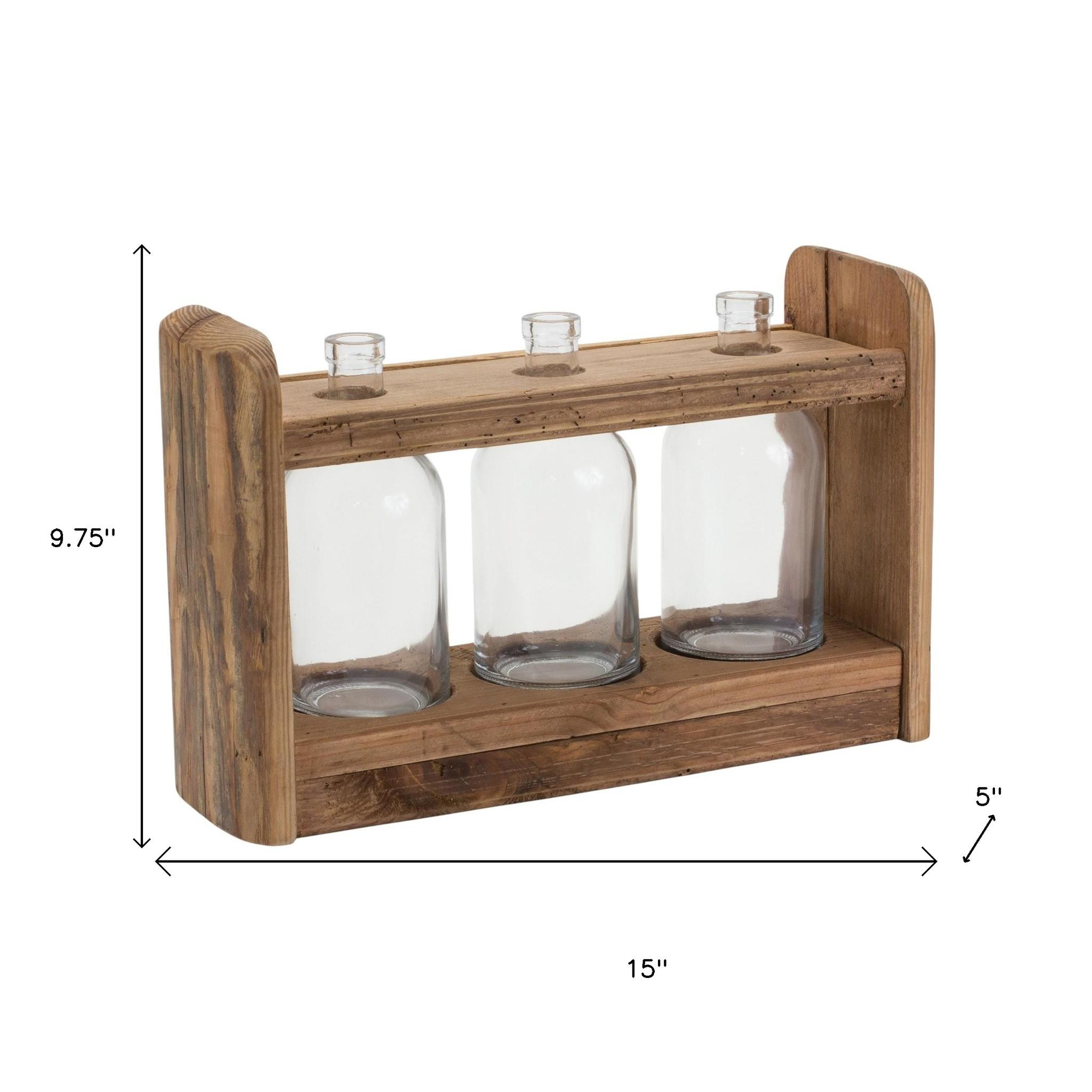 With or without flowers, this 10-inch clear and brown glass and wood three bottle table vase makes a great gift or decorative accent for your space. The elegant rectangle shape adds a contemporary flair to any decor style. Crafted from a combination of durable glass and solid wood, this vase exemplifies quality and aesthetic appeal. The purposeful rub through distressing enhances its character, giving each piece a unique charm. Perfect for showcasing your favorite blooms or as a standalone piece, it effortlessly elevates the ambiance of any room in your home. 9.75-inch h x 15.00-inch w x 5.00-inch d.