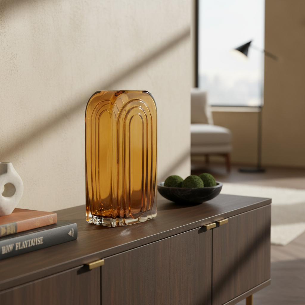 With or without flowers, this 10-inch amber glass table vase makes a great gift or decorative accent for your space. Its elegant design effortlessly complements a variety of decor styles, adding a touch of sophistication to any room. The rich and translucent amber hue brings warmth and character, enhancing the beauty of your floral arrangements. Crafted from high-quality glass, this vase is both durable and stunning, ensuring it remains a cherished piece for years to come. Perfect for tabletops, shelves, or as a centerpiece, it invites creativity in how you showcase your favorite blooms or decorative elements. 9.75-inch h x 5.50-inch w x 3.25-inch d.