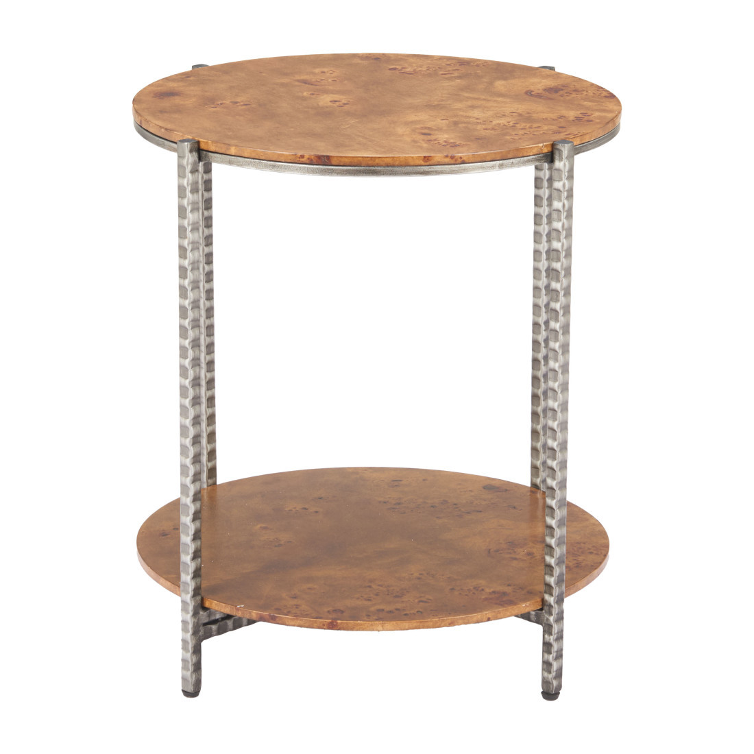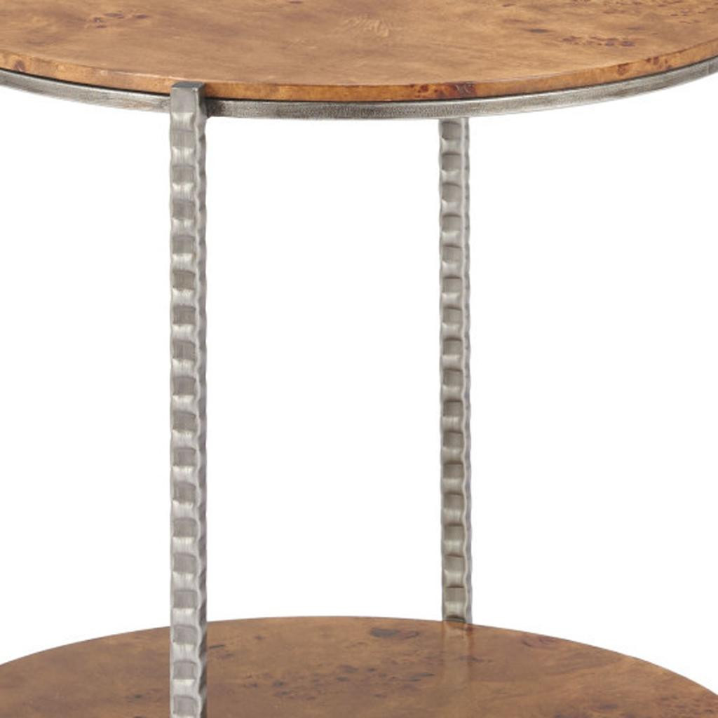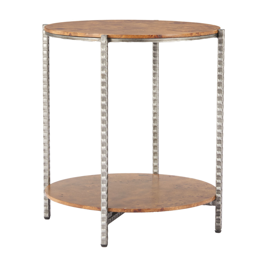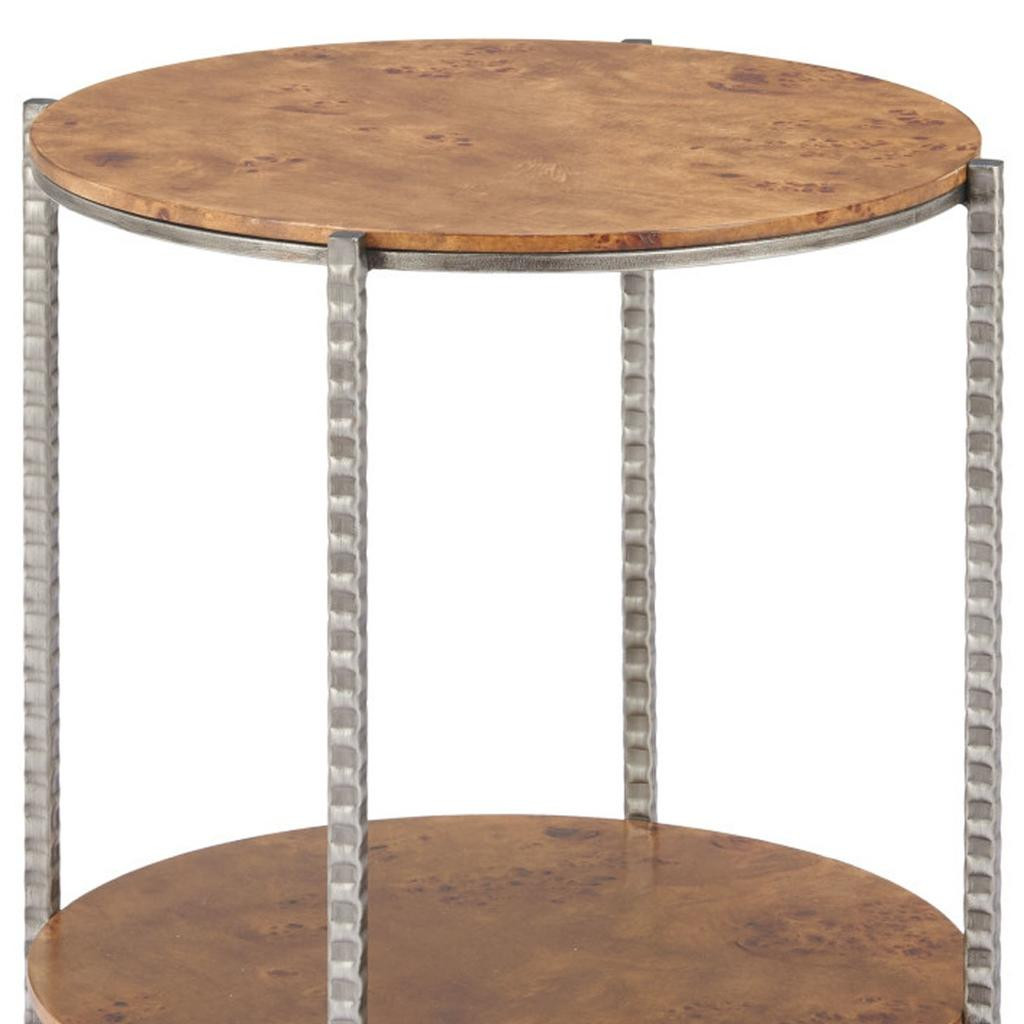 Distinctive in style the 22-inch natural and silver wood and steel round end table with shelf radiates a versatile charm. The natural manufactured wood top of this table is a nice contrast to the high quality, silver colored hammered and rustic steel of the base. Help to keep your space organized with the included single shelf. A great accent on either side of the sofa or bed, this adorable end or side table is just what you need. This versatile table is a great accent for most any room. 22-inch h x 20-inch w x 20-inch d.