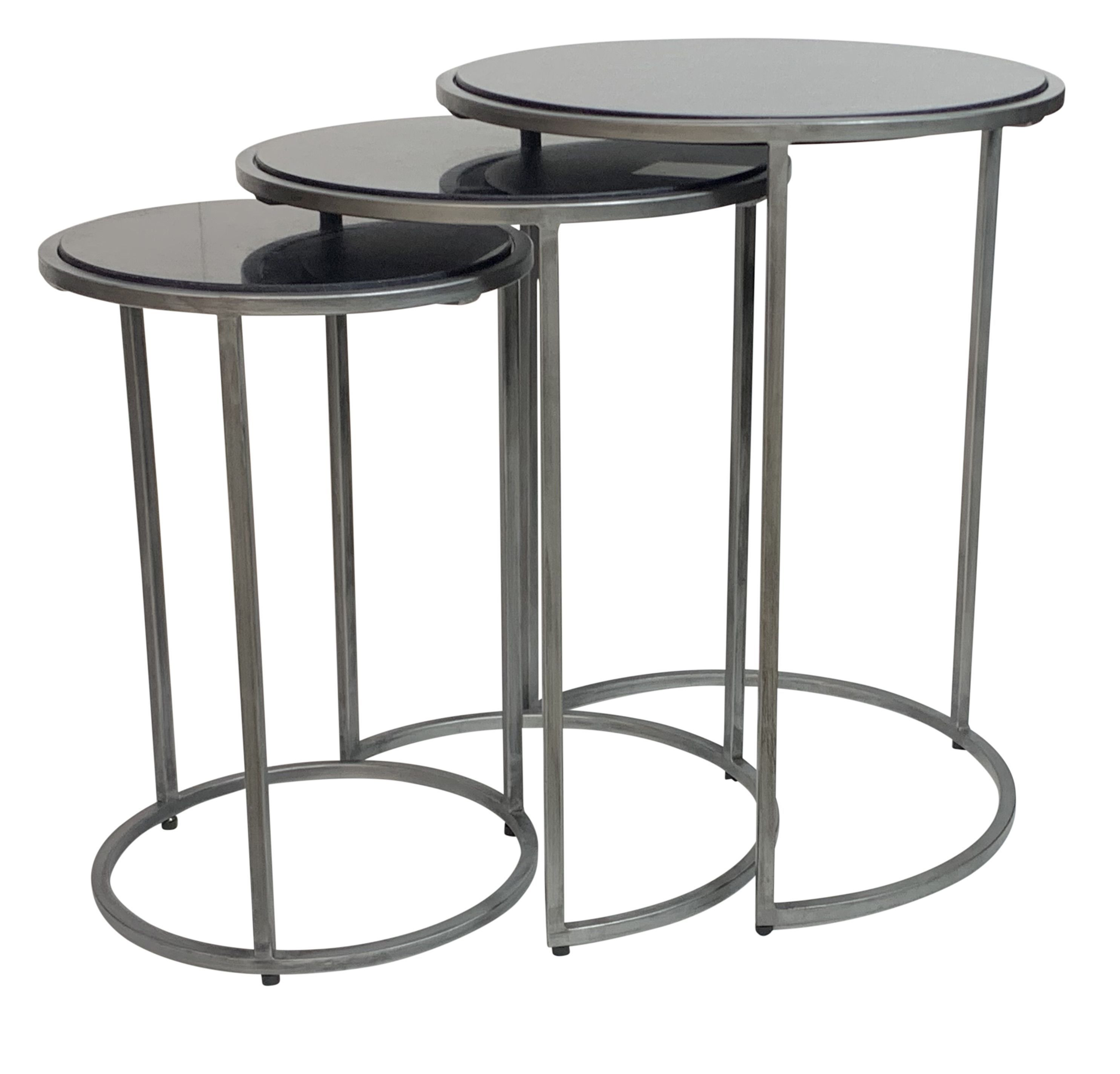 Optimize your space with the set of three black and gray marble and iron round frame nested tables that nest into each other easily and fashionably when not in use. The black marble top of this table is a nice contrast to the high quality, gray iron of the base. An ideal location for placing your snacks and drinks, and a place to keep your lamp, frames, or other accessories. You can match it with other pieces to get the ideal look for your place. 22-inch h x 17.5-inch w x 17.5-inch d.