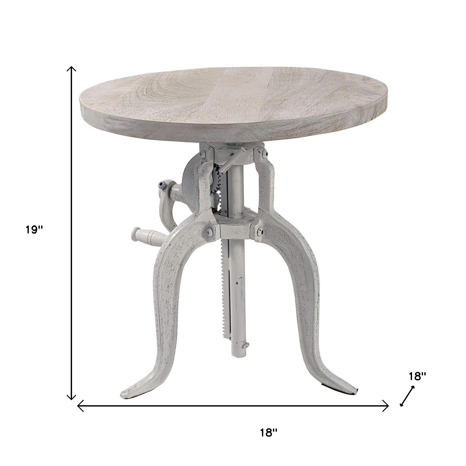 Show off your exquisite taste with this 19-inch white solid wood and iron height adjustable round end table. A sleek white monotone color gives this iron and solid wood table a fresh and updated look. Side tables are a great way to flank your sofa, use as an accent next to your favorite chair, or can even be used bedside. You can also use it as an entryway table to hold your keys. 19-inch h x 18-inch w x 18-inch d.