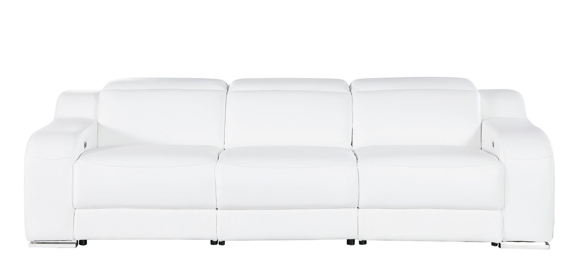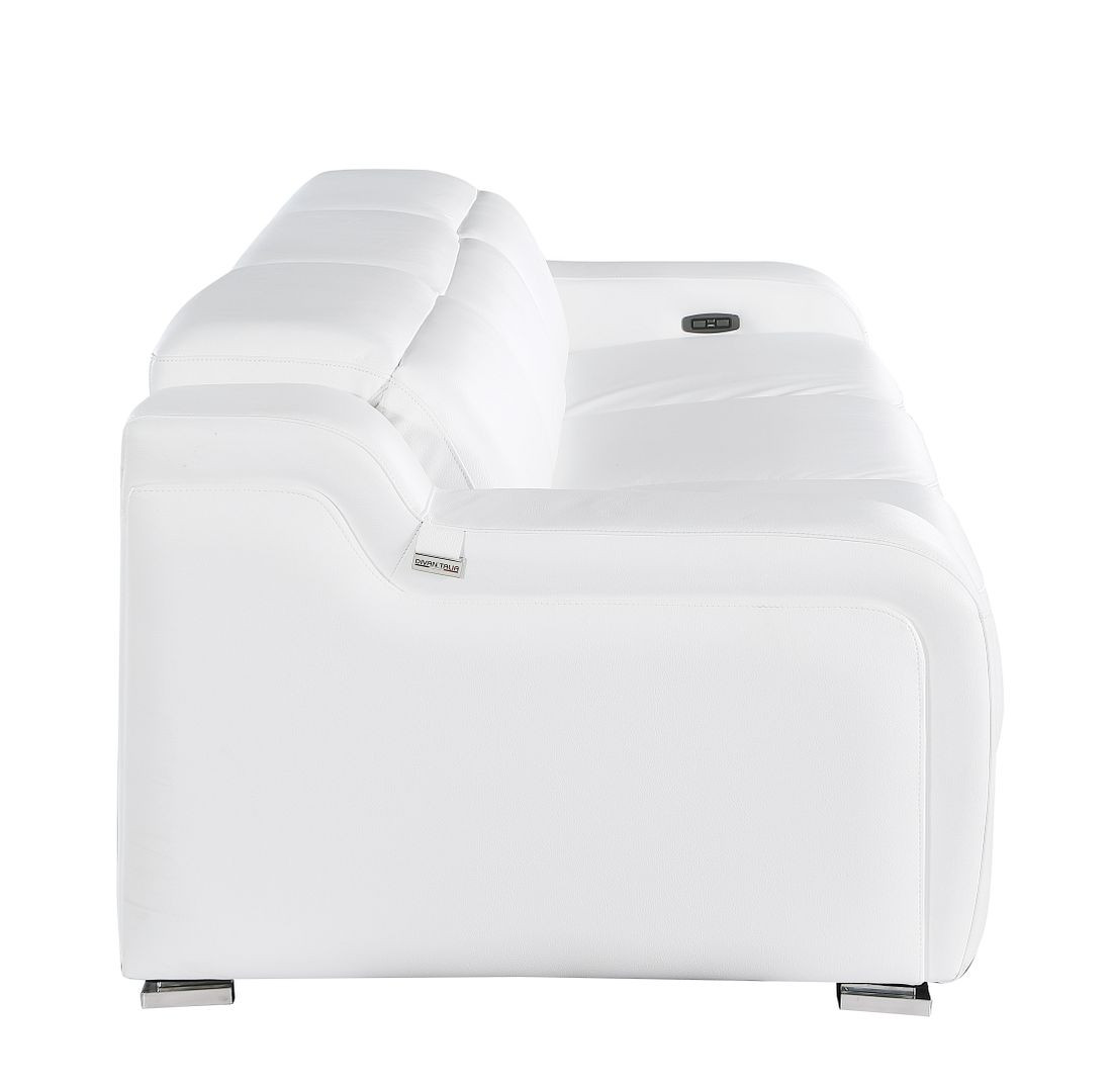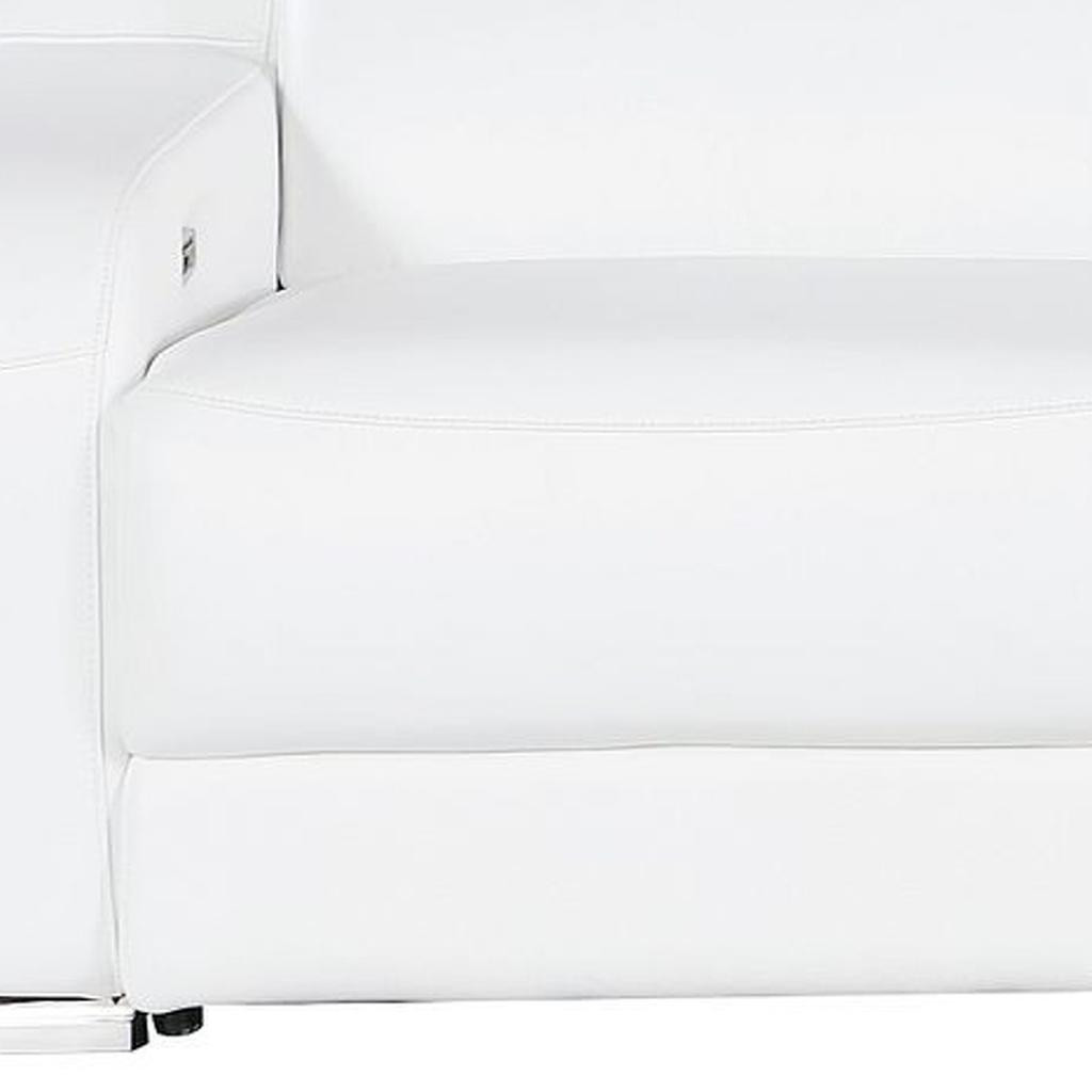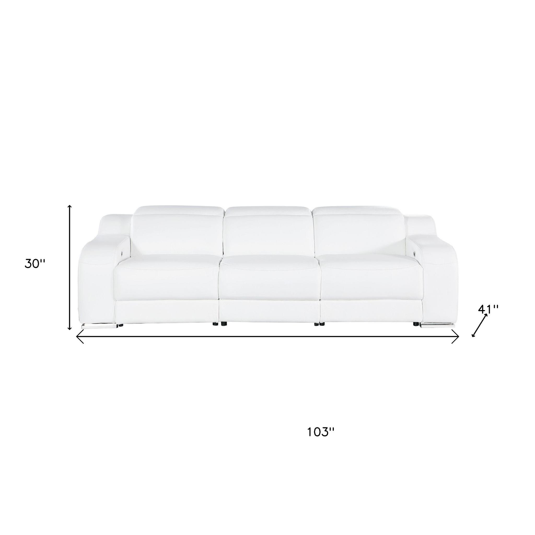 Made of the highest quality, supple leather, this 103-inch white italian leather reclining usb sofa will be the star of your space. The high grade premium leather used makes your lounging luxuriously comfortable and adds an elegant appeal to your space. Solid colors give you lots of decorative options and are easy to work into your decor scheme. Pocket spring construction gives this piece strong support and makes it comfortable to sit even for long periods of time. Rolled arms offer a comfy place to rest. Silver stainless steel legs effortlessly elevate the room and add a touch of contemporary design. A great showpiece for your room, this sofa is a must have. 39.00-inch h x 103.00-inch w x 41.00-inch d.