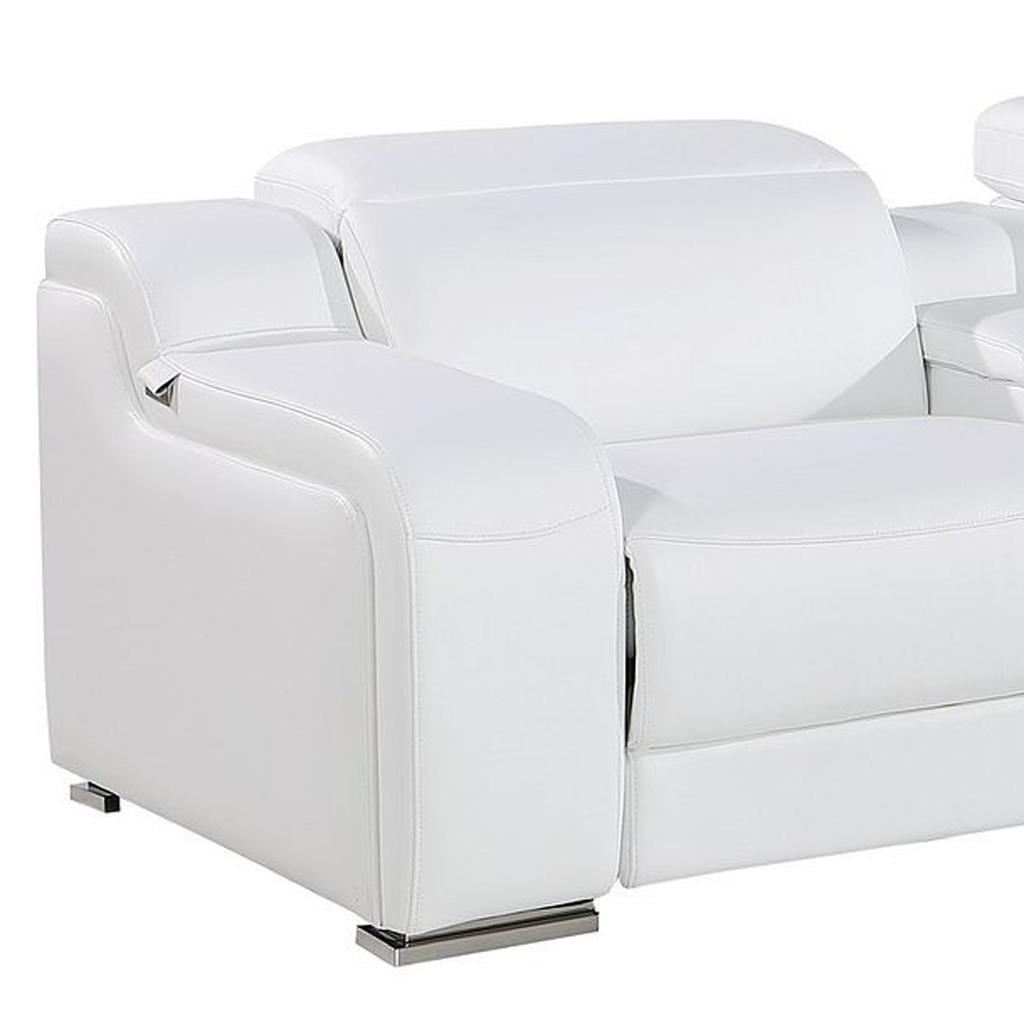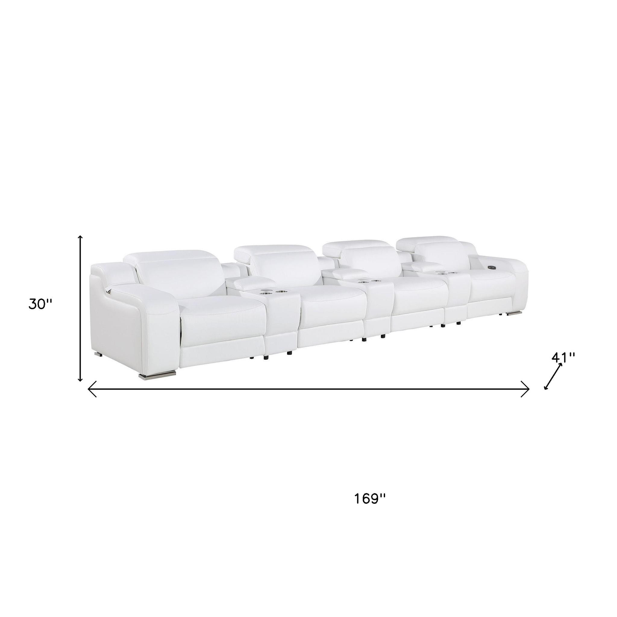 Made of the highest quality, supple leather, this 169-inch white italian leather reclining usb sofa will be the star of your space. The high grade premium leather used makes your lounging luxuriously comfortable and adds an elegant appeal to your space. Solid colors give you lots of decorative options and are easy to work into your decor scheme. Pocket spring construction gives this piece strong support and makes it comfortable to sit even for long periods of time. Rolled arms offer a comfy place to rest. Silver stainless steel legs effortlessly elevate the room and add a touch of contemporary design. Built to last, this sofa will be a great centerpiece for your room. 39.00-inch h x 169.00-inch w x 41.00-inch d.