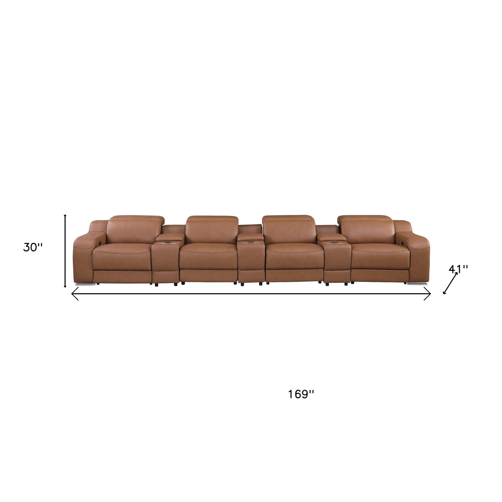 Made of the highest quality, supple leather, this 169-inch chestnut italian leather reclining usb sofa will be the star of your space. The high grade premium leather used makes your lounging luxuriously comfortable and adds an elegant appeal to your space. Pocket spring construction gives this piece strong support and makes it comfortable to sit even for long periods of time. Fixed arms offer a comfy place to rest. Silver stainless steel legs effortlessly elevate the room and add a touch of contemporary design. A great showpiece for your room, this sofa is a must have. 30.00-inch h x 169.00-inch w x 41.00-inch d.