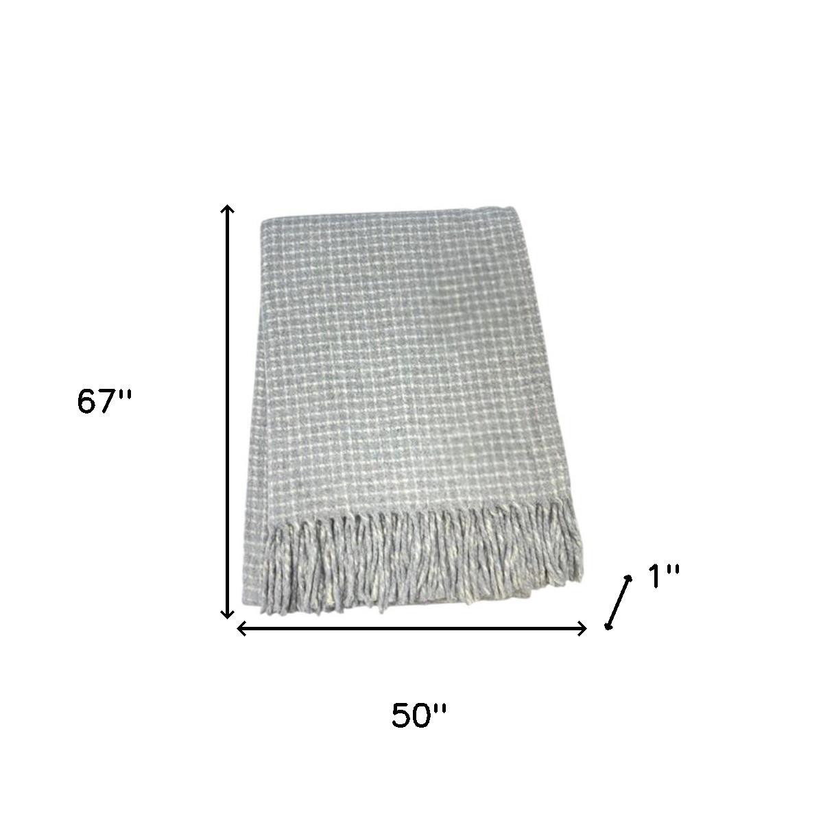 This 50-inch x 67-inch light gray and cream cotton blend woven plaid throw blanket with fringe is a stylish addition to any sofa. Features a woven plaid design that offers sumptuous softness and texture that you'll cherish for years to come. Made from cotton blend this blanket will make a great addition to any room it's added to. Layering your furnishings with a decorative throw has the ability to awaken a tired living room or elevate the design of your bedroom simply by providing elements of color and texture that weren't there before. This cozy throw blanket is sure to become your go-to couch companion. 67-inch h x 50-inch w x 1-inch d.