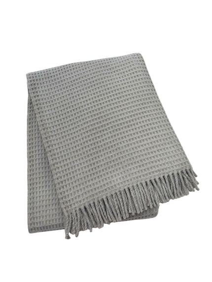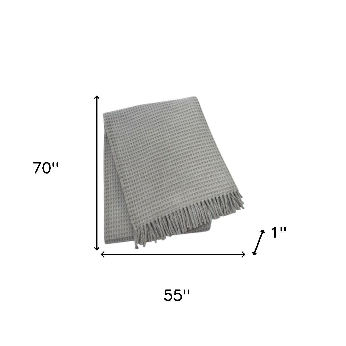 This 55-inch x 70-inch light gray cotton waffle weave throw blanket with fringe is a stylish addition to any sofa. Featuring a waffle weave, this throw blanket is a lightweight layer for all seasons. Made from acrylic and cotton this blanket will make a great addition to any room it's added to. Add extra texture to your decor and turn your room into an inviting space. Perfect for your favorite chair, bed or lounging on the couch, this blanket helps bring a warm and fashionable flair to your space. 70-inch h x 55-inch w x 1-inch d.