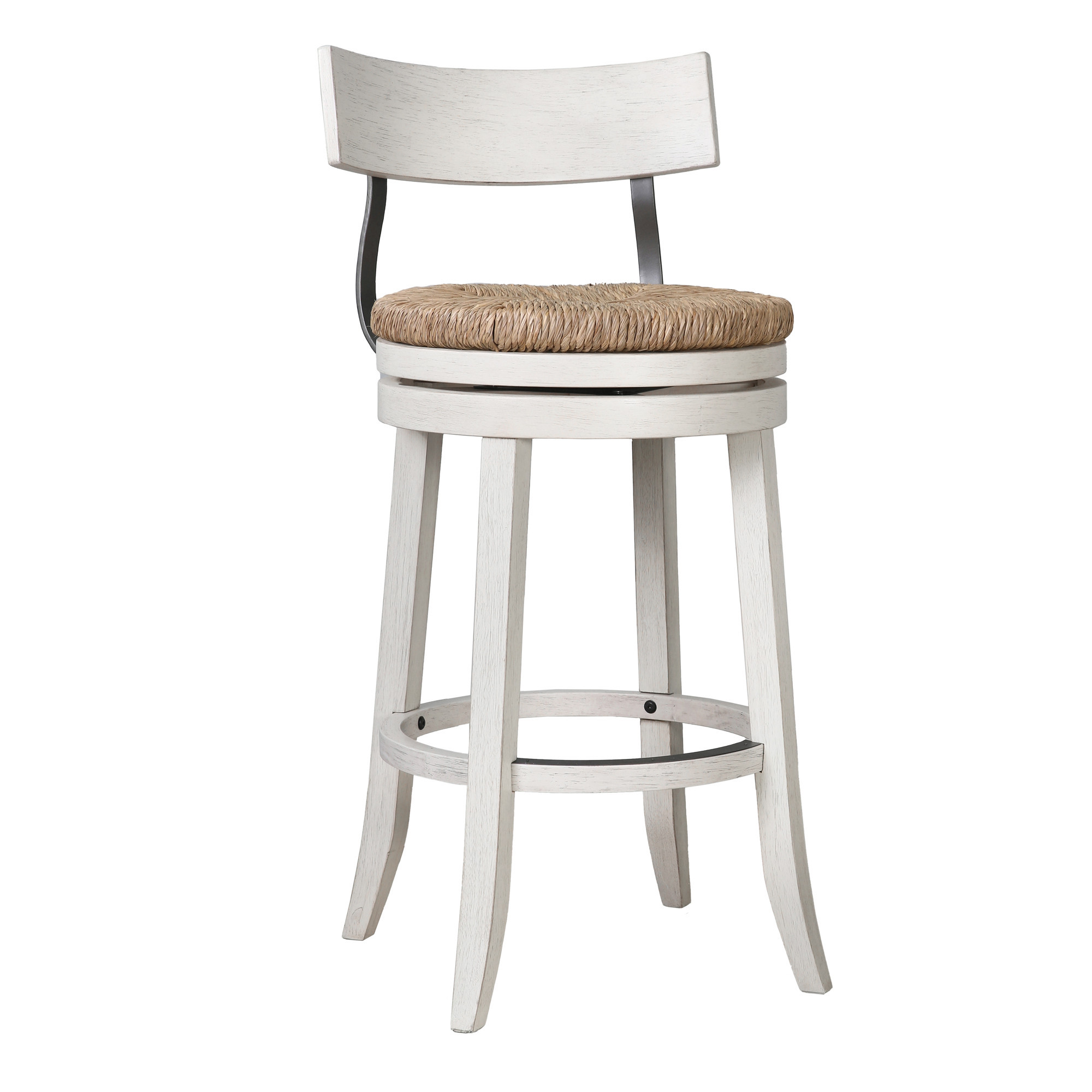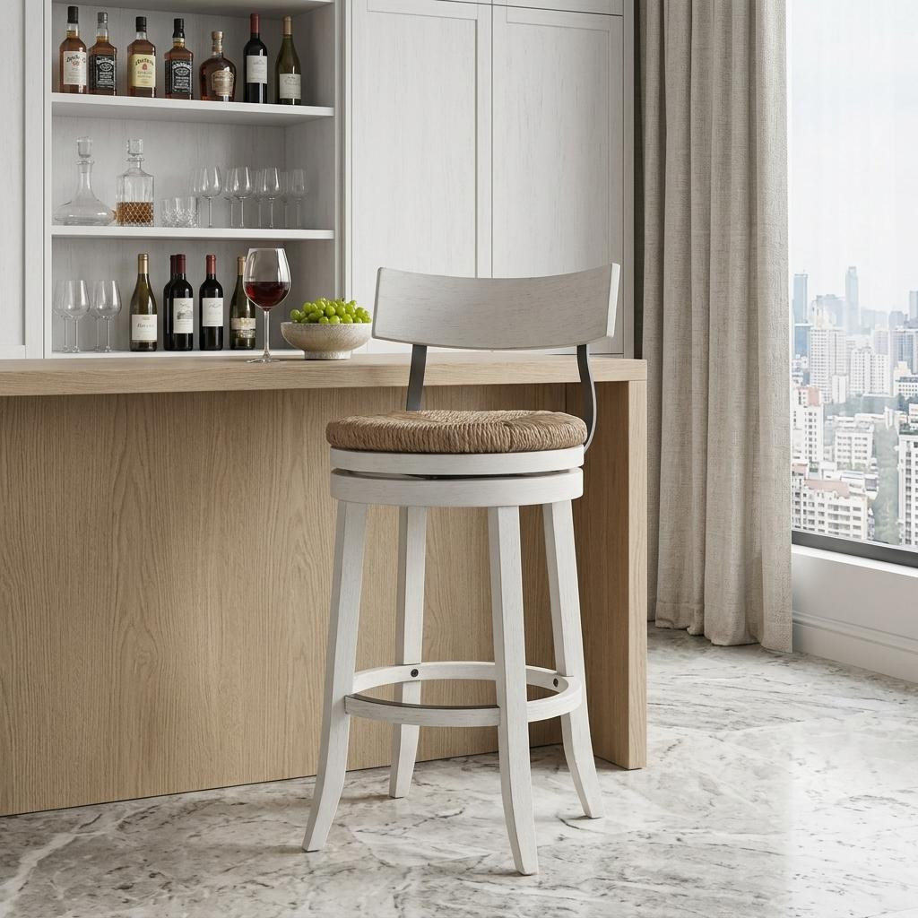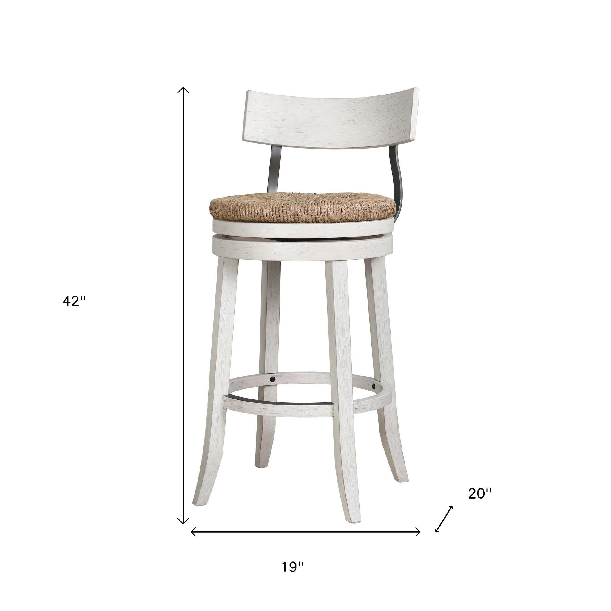 With this brown and white rattan and solid wood low back bar height swivel bar chair you can add design and extra seating to your space. The base of this stool is made from solid wood in a white color that is a nice contrast to the brown rattan seat. Designed with a footrest for comfort and convenience. The round shape of the seat combines with a low back to give this chair a comfortable and fashionable look. 42.00-inch h x 19.00-inch w x 20.00-inch d.