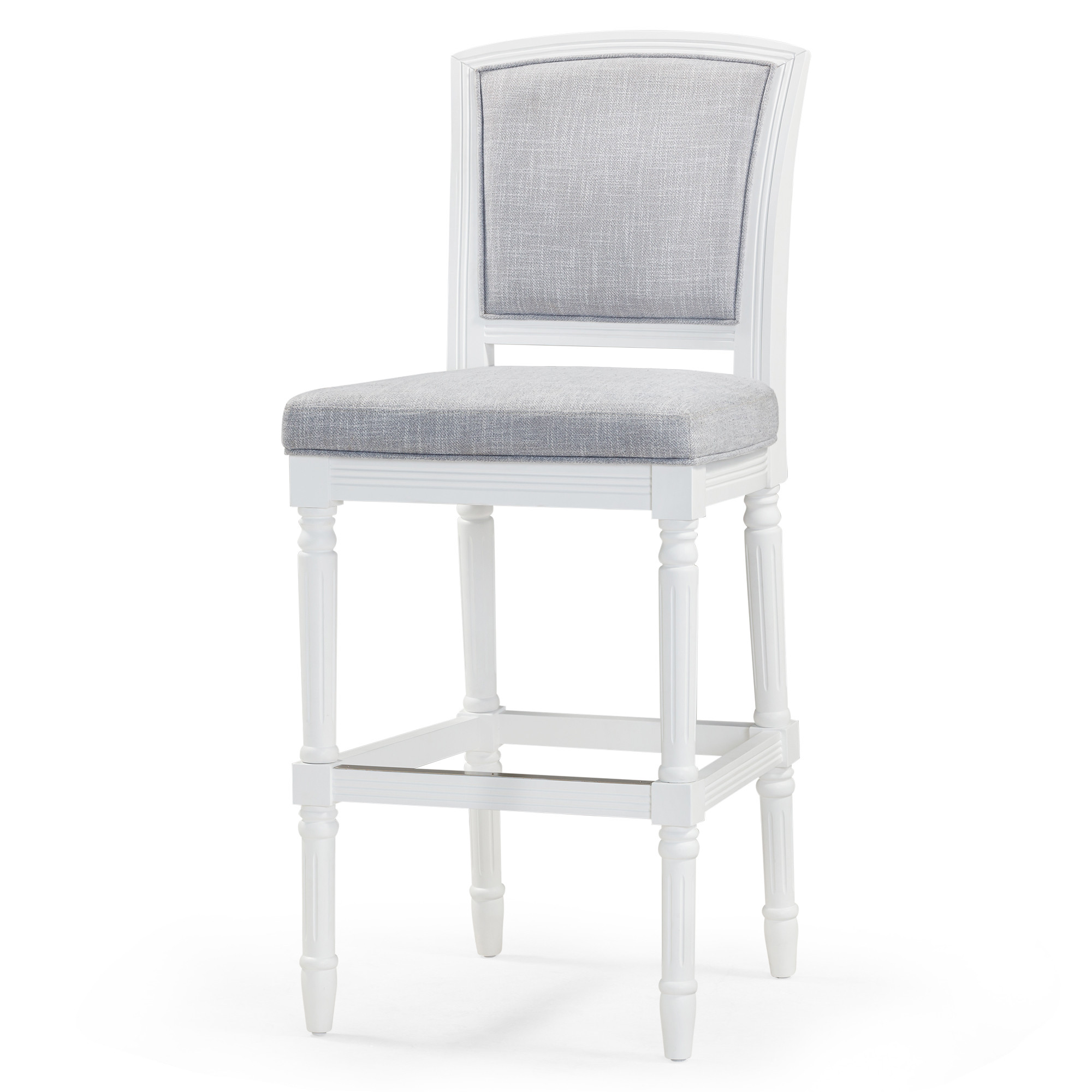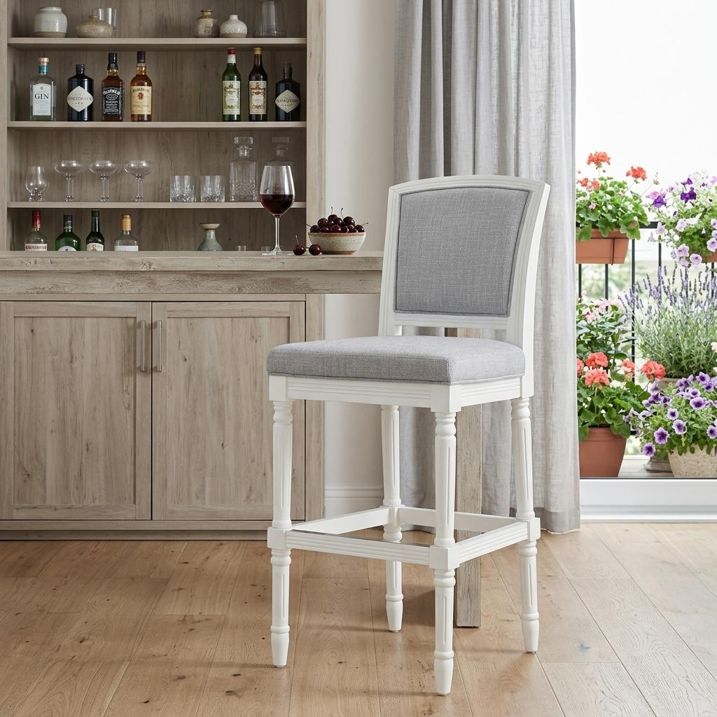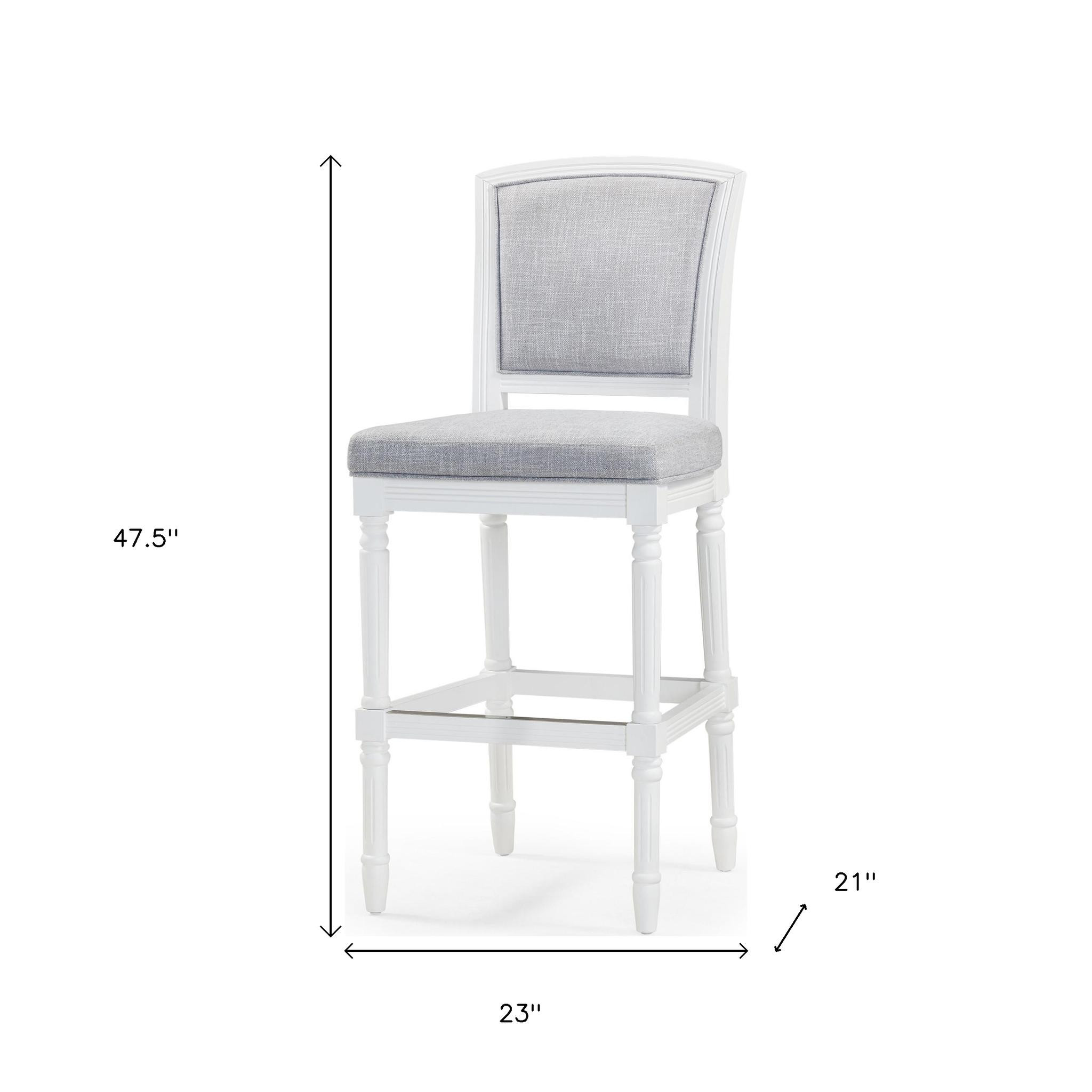 Comfortable enough to sit in for awhile, this gray and white fabric and solid wood bar height bar chair will transcend the look of your room. The white coloration of the high quality solid wood base marries nicely with the gray fabric seat. Designed with a footrest for comfort and convenience. The rectangle shape of the seat combines with a full back to give this chair a comfortable and fashionable look. 47.50-inch h x 21.00-inch w x 23.00-inch d.