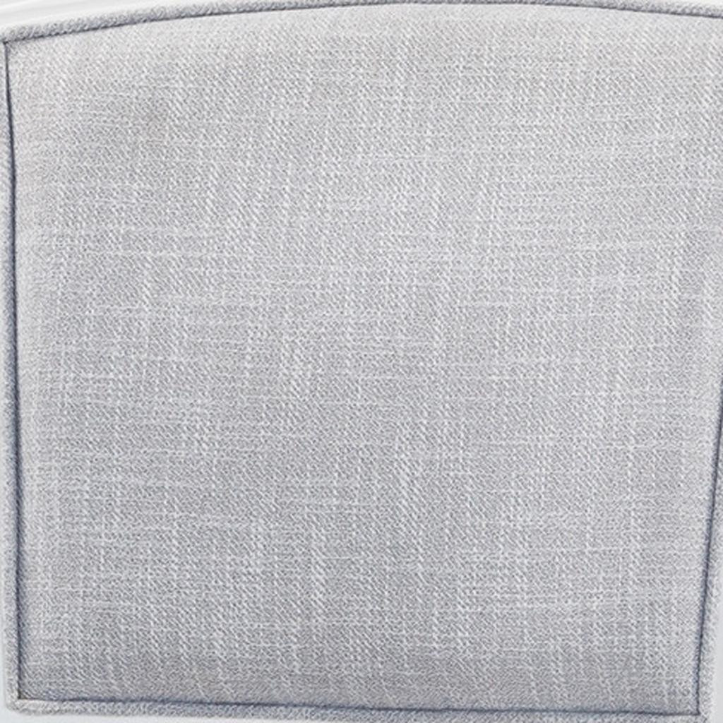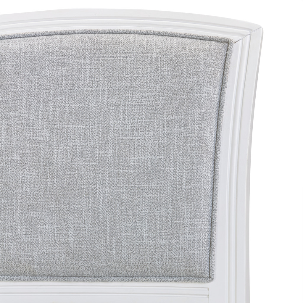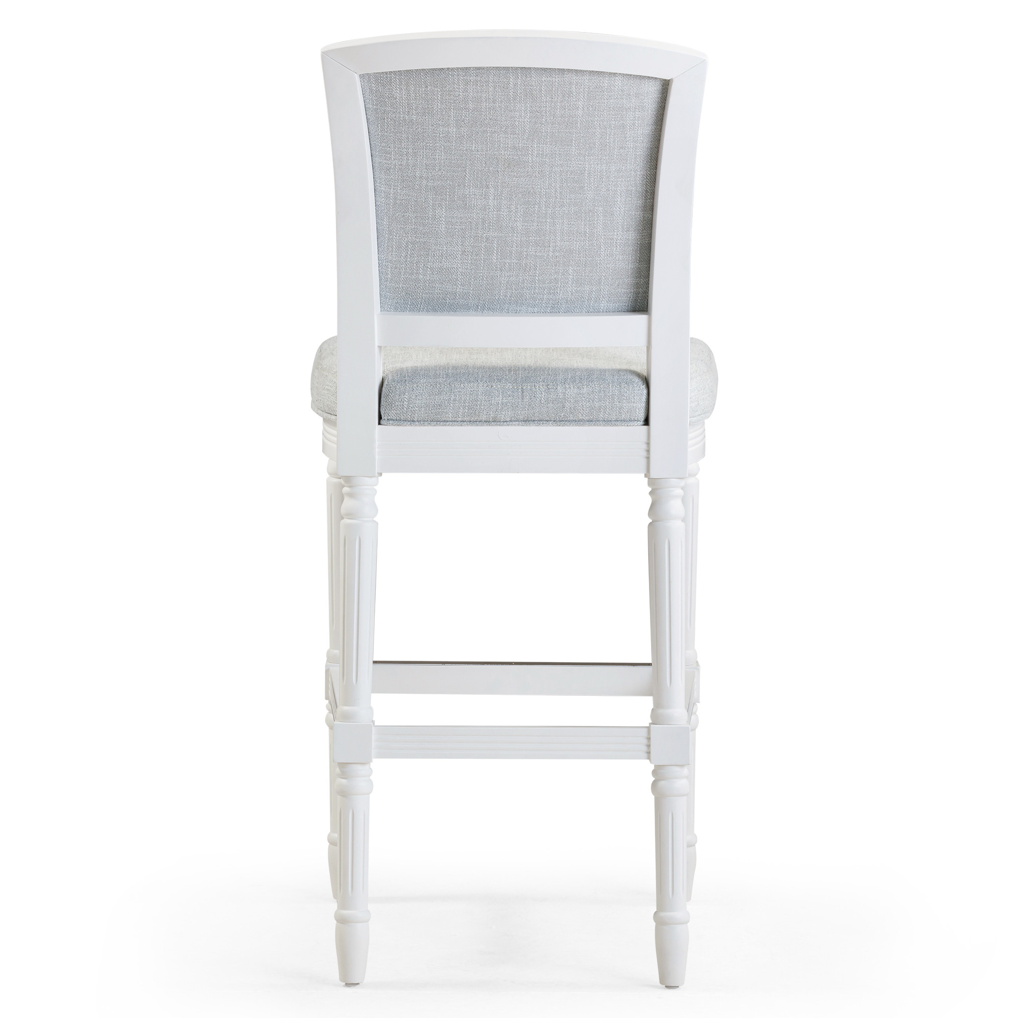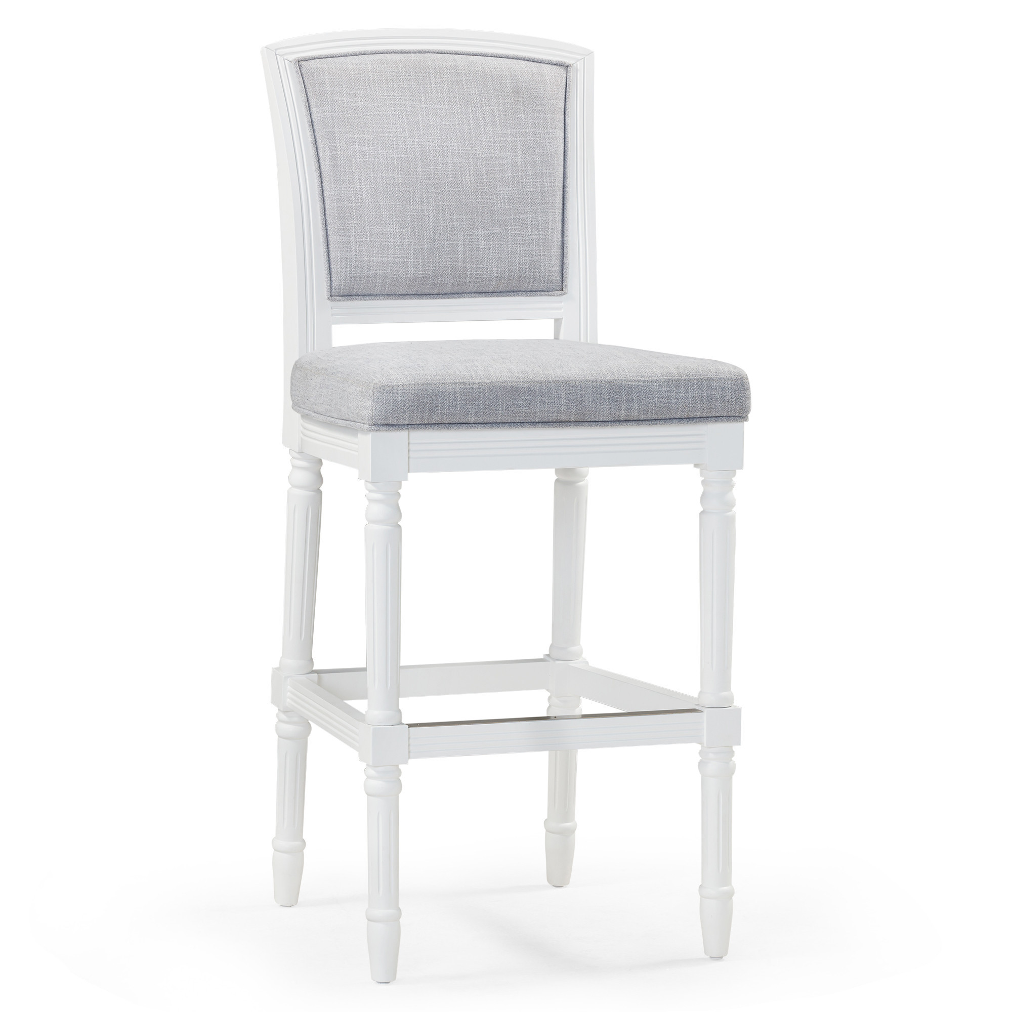 Comfortable enough to sit in for awhile, this gray and white fabric and solid wood bar height bar chair will transcend the look of your room. The white coloration of the high quality solid wood base marries nicely with the gray fabric seat. Designed with a footrest for comfort and convenience. The rectangle shape of the seat combines with a full back to give this chair a comfortable and fashionable look. 47.50-inch h x 21.00-inch w x 23.00-inch d.