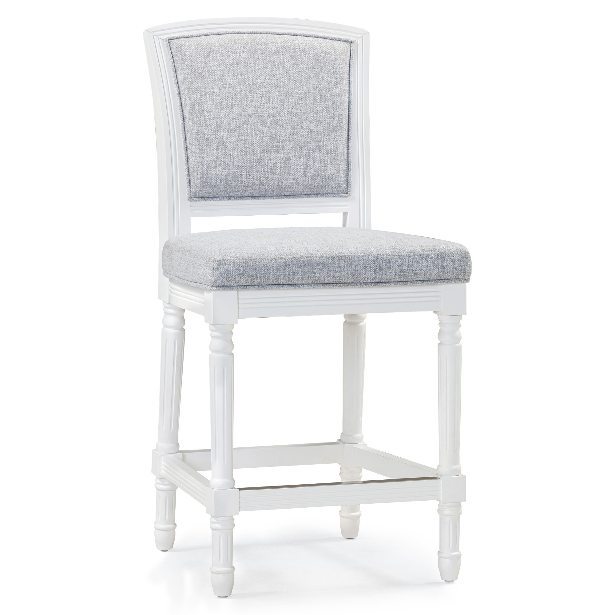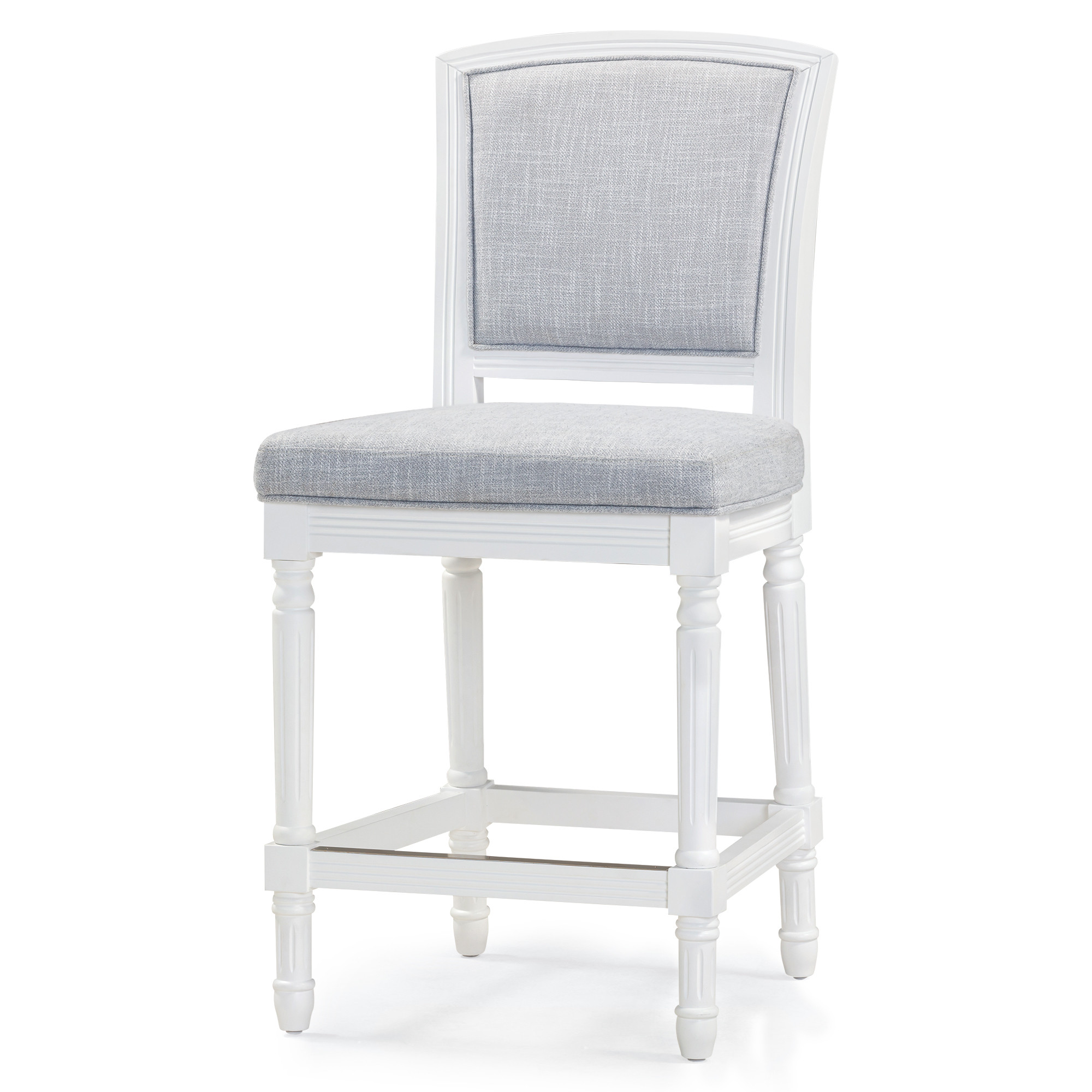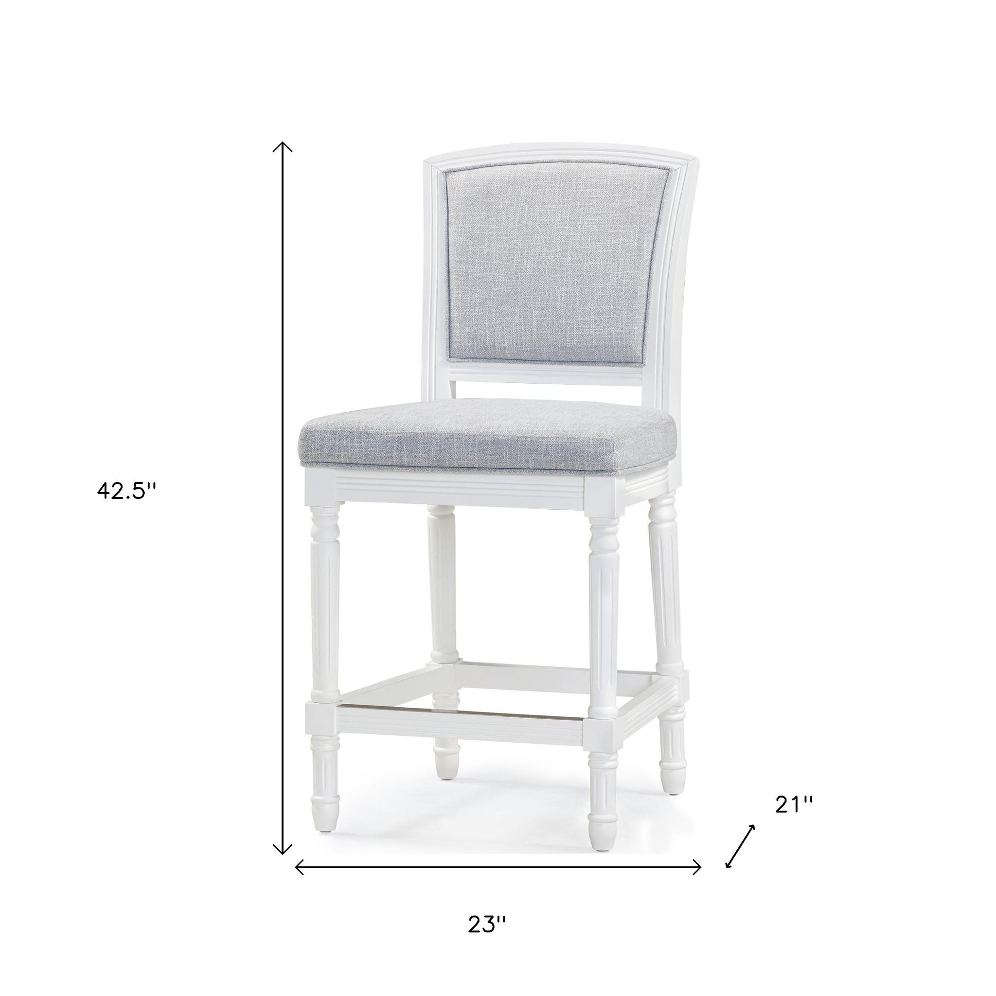 Comfort and design come together nicely in this gray and white fabric and solid wood counter height bar chair. The gray fabric seat of this stool is a nice contrast to the high quality, white solid wood of the base. Designed with a footrest for comfort and convenience. The rectangle shape of the seat combines with a full back to give this chair a comfortable and fashionable look. 42.50-inch h x 21.00-inch w x 23.00-inch d.