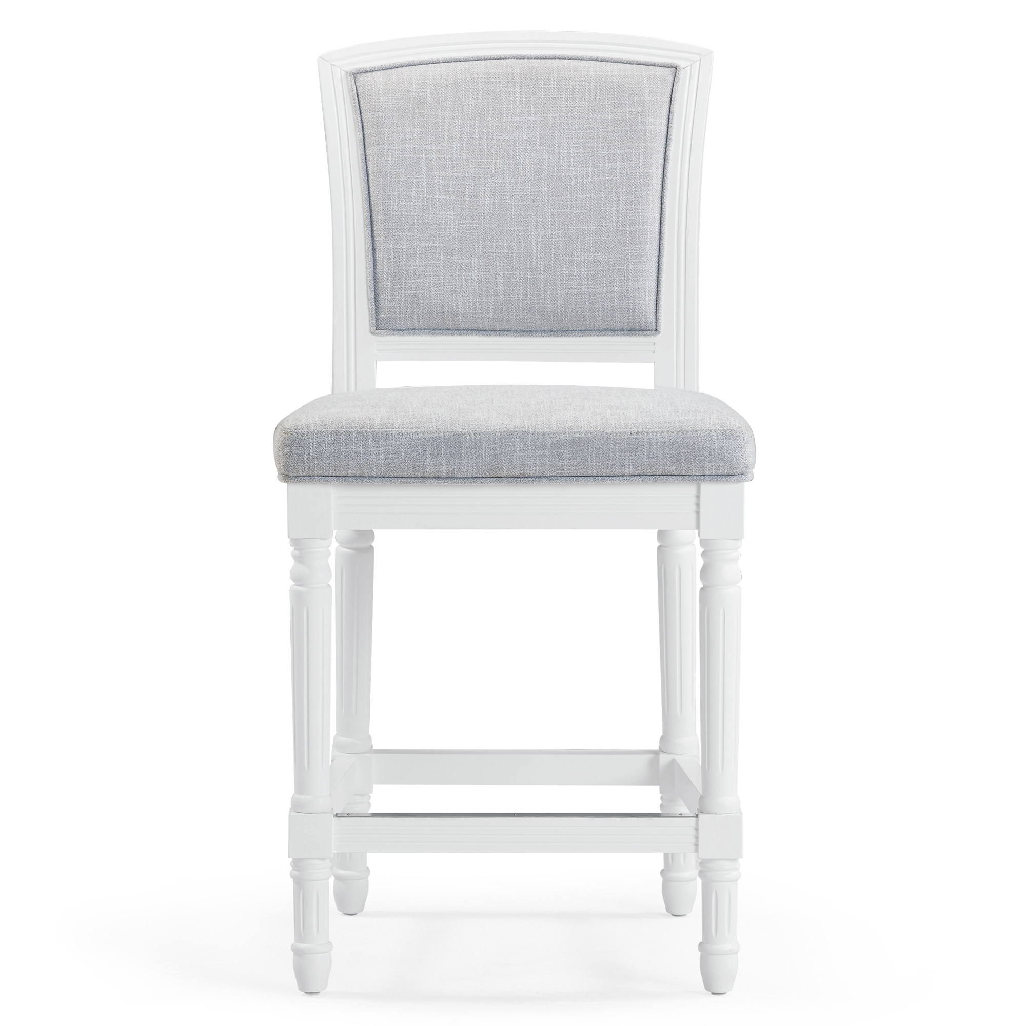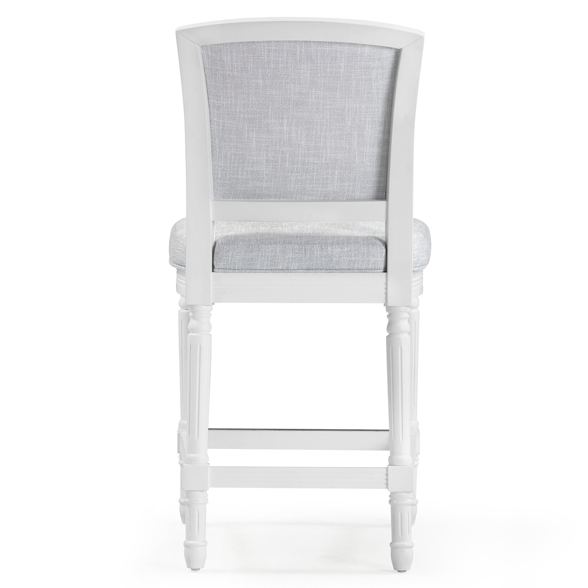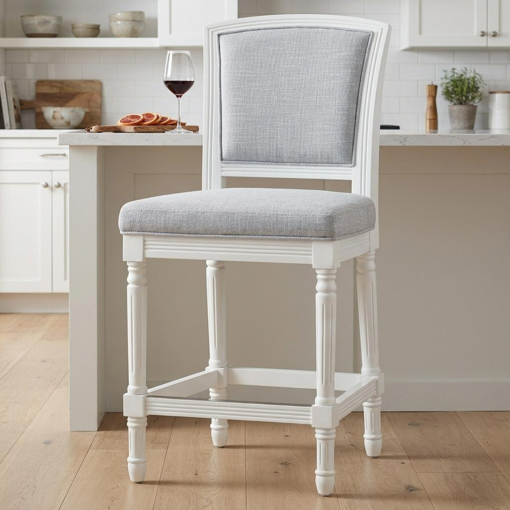 Comfort and design come together nicely in this gray and white fabric and solid wood counter height bar chair. The gray fabric seat of this stool is a nice contrast to the high quality, white solid wood of the base. Designed with a footrest for comfort and convenience. The rectangle shape of the seat combines with a full back to give this chair a comfortable and fashionable look. 42.50-inch h x 21.00-inch w x 23.00-inch d.