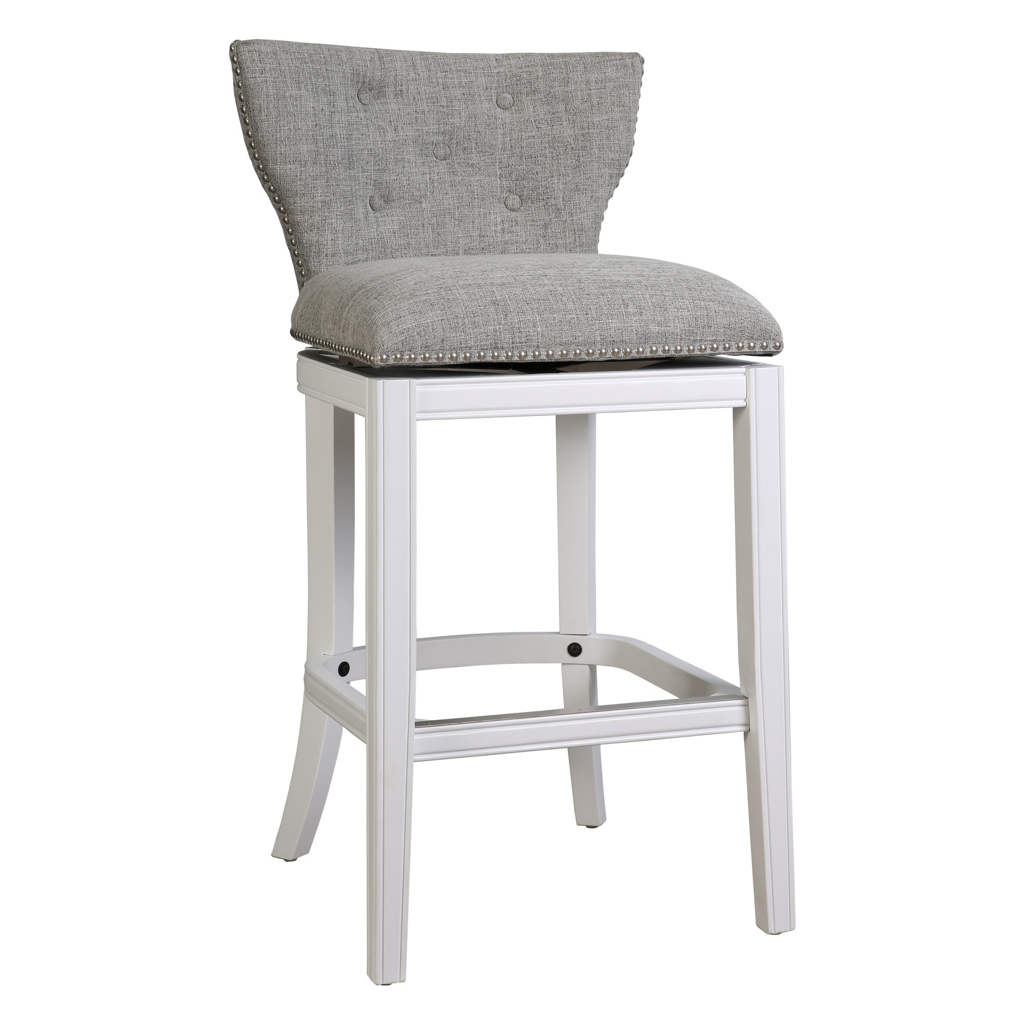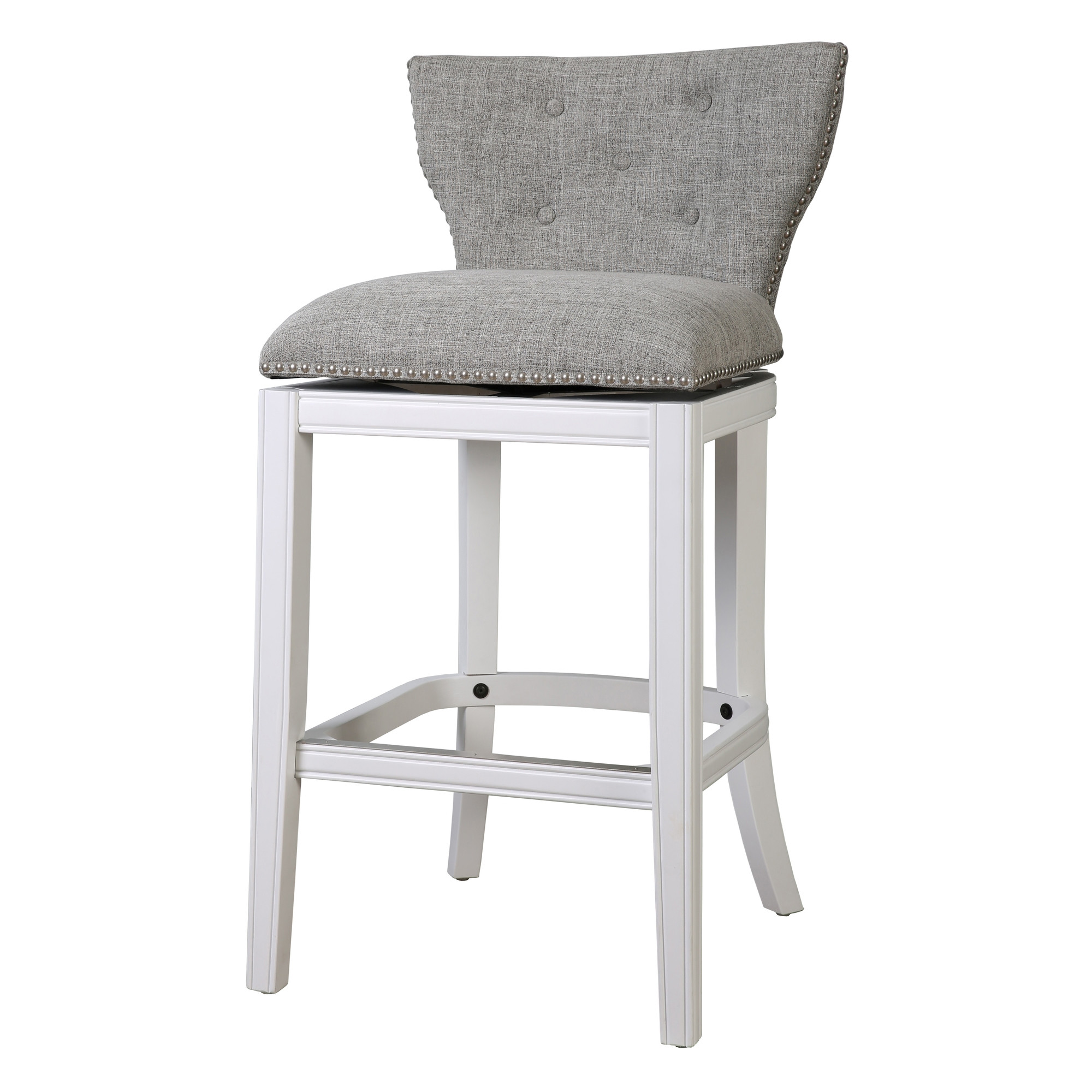 Comfortable enough to sit in for awhile, this gray and white fabric and solid wood low back bar height swivel bar chair will transcend the look of your room. The base of this stool is made from solid wood in a white color that is a nice contrast to the gray fabric seat. Designed with a footrest for comfort and convenience. The rectangle shape of the seat combines with a low back to give this chair a comfortable and fashionable look. 41.00-inch h x 22.00-inch w x 22.50-inch d.