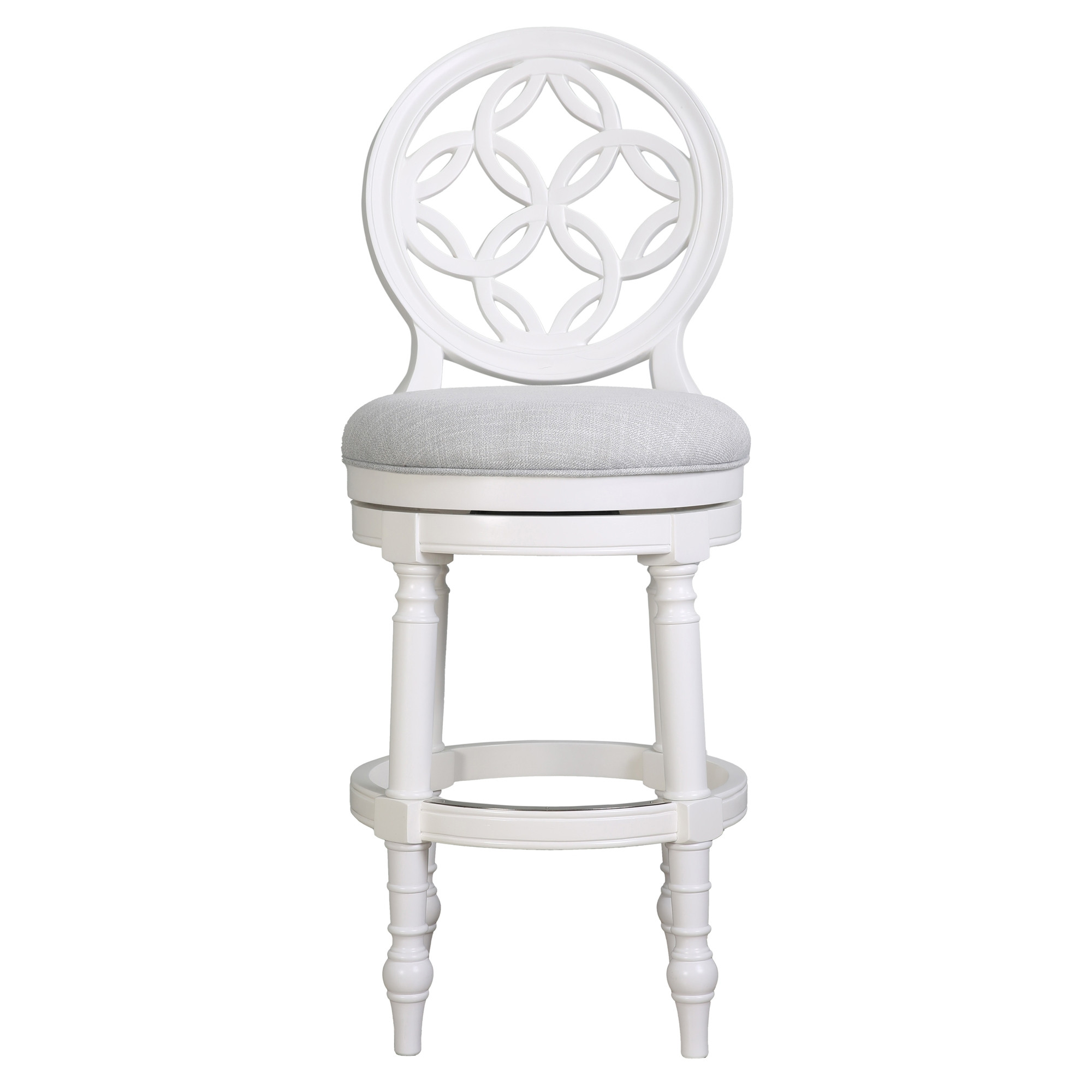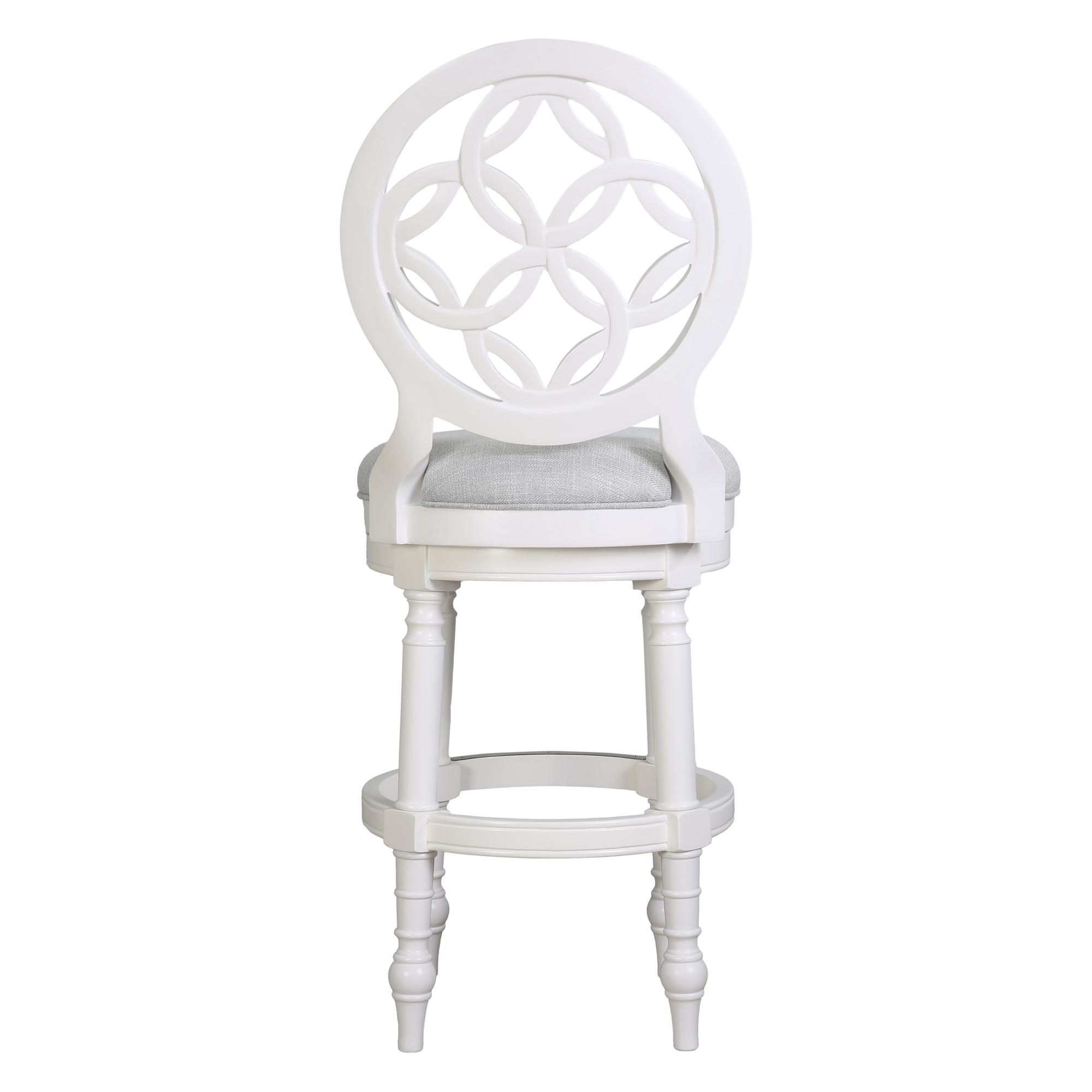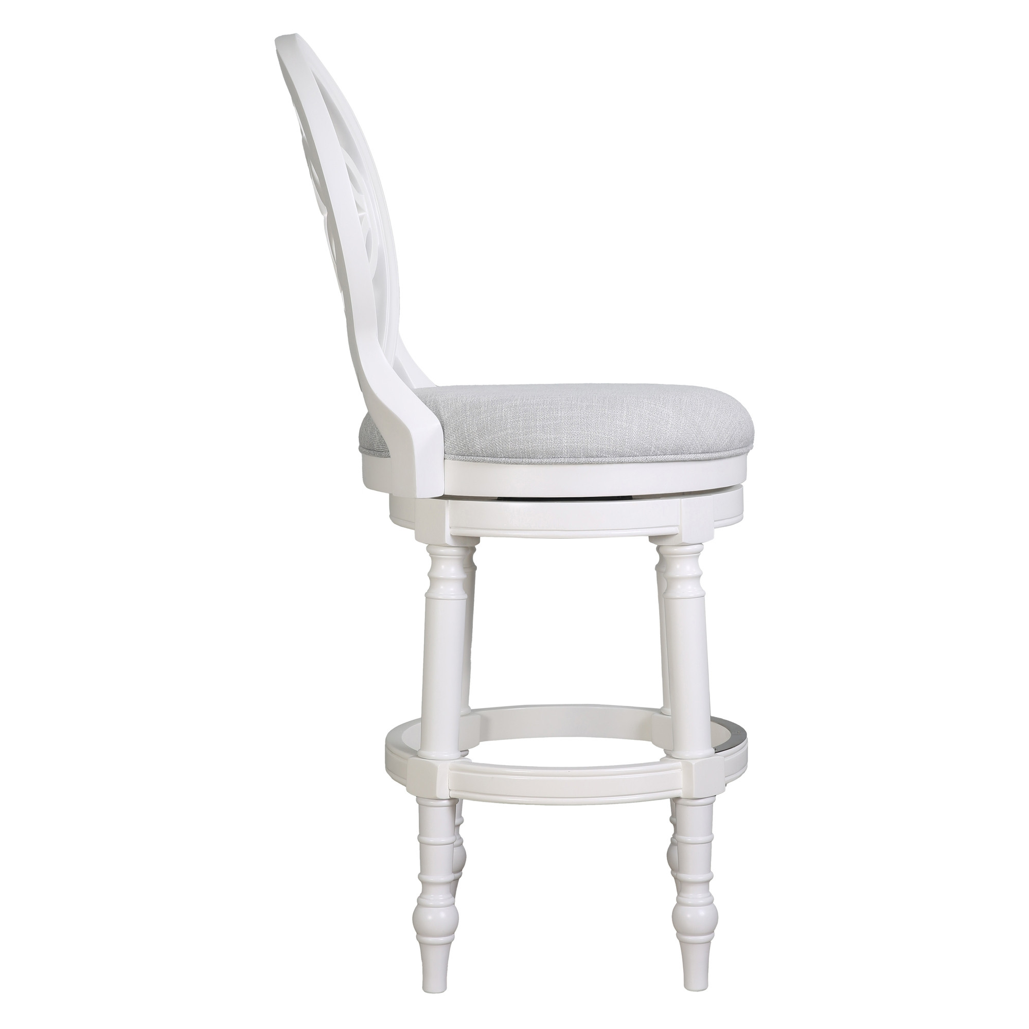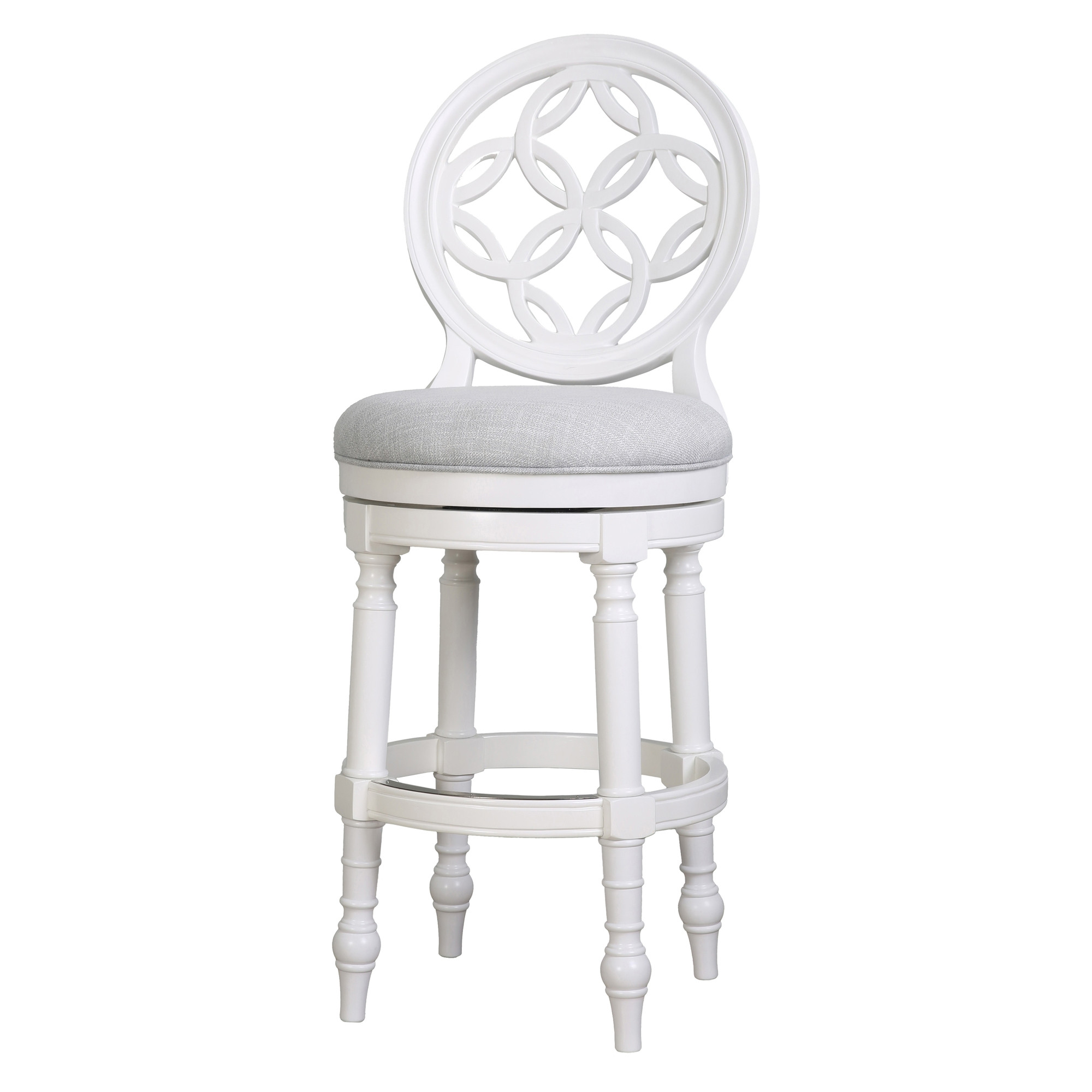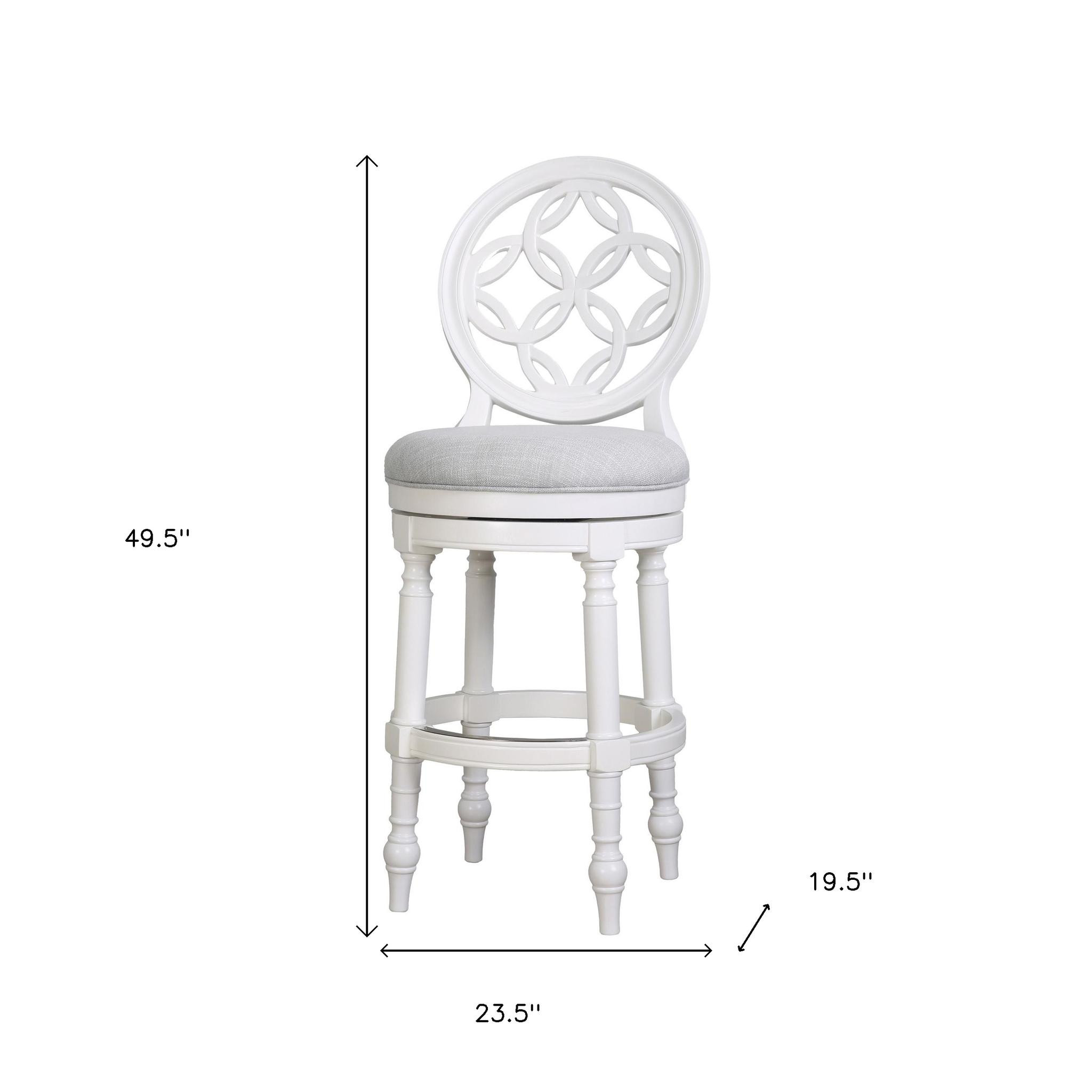 Comfort and design come together nicely in this gray and white fabric and solid wood bar height swivel bar chair. Quality construction from white solid wood combines with gray fabric to give this stool a fresh and updated look. Designed with a footrest for comfort and convenience. Not only good looking and stylish, this chair features a round shaped seat and a full back for the ultimate in comfort and enjoyment. 49.50-inch h x 23.50-inch w x 19.50-inch d.