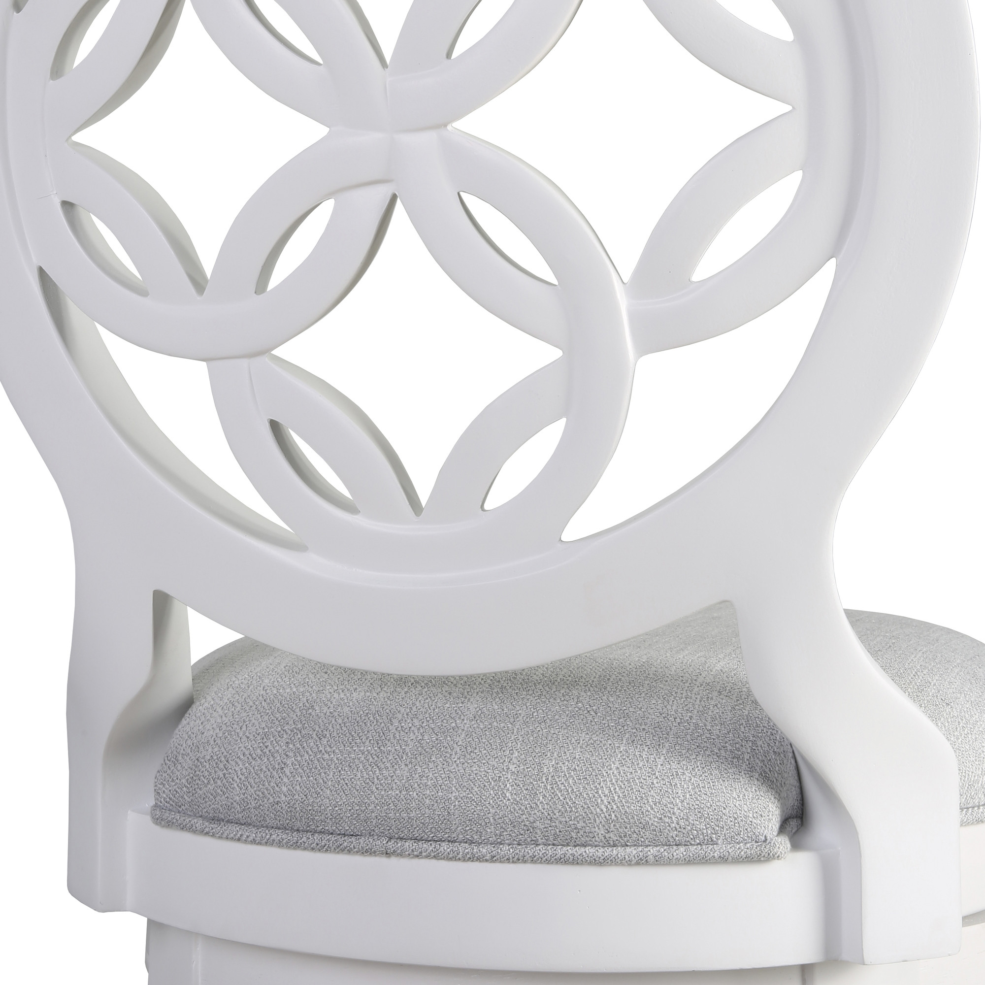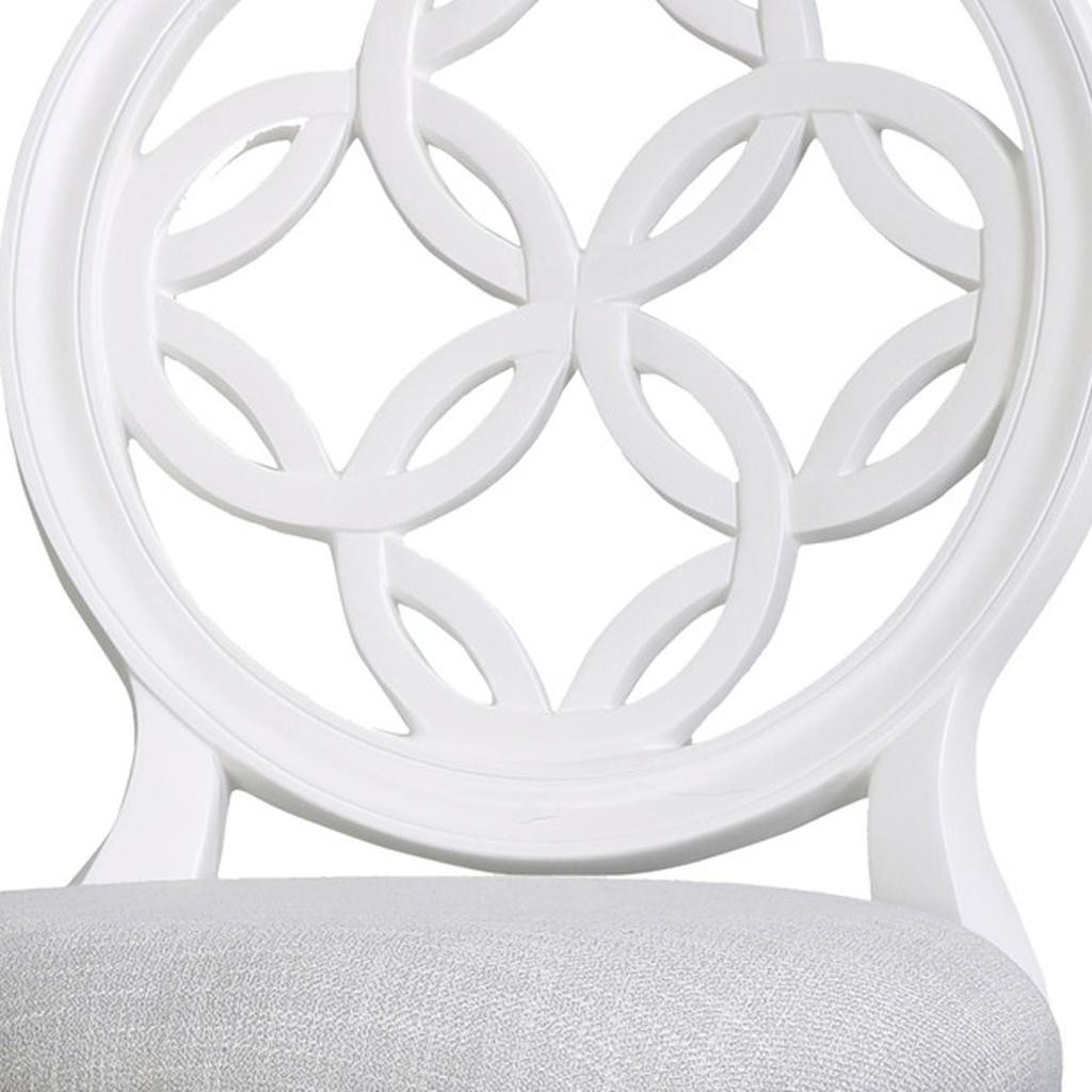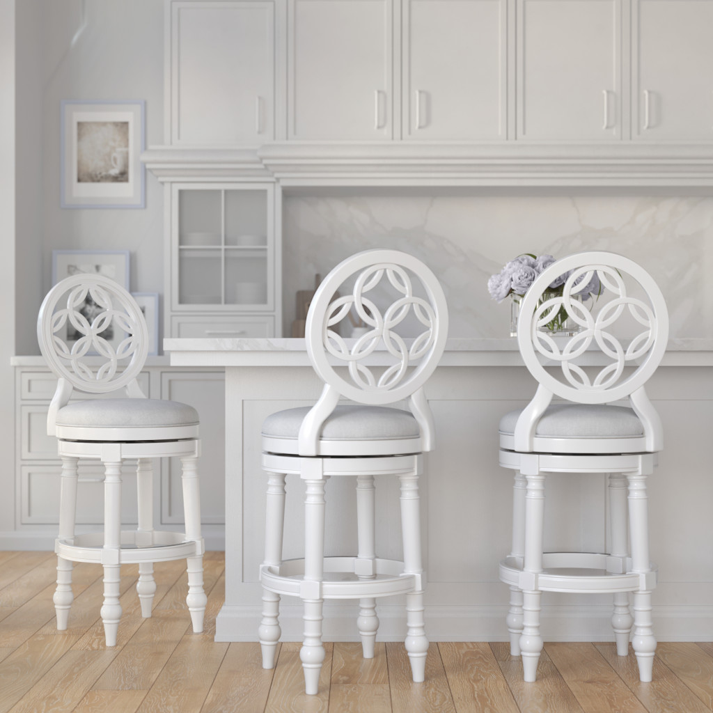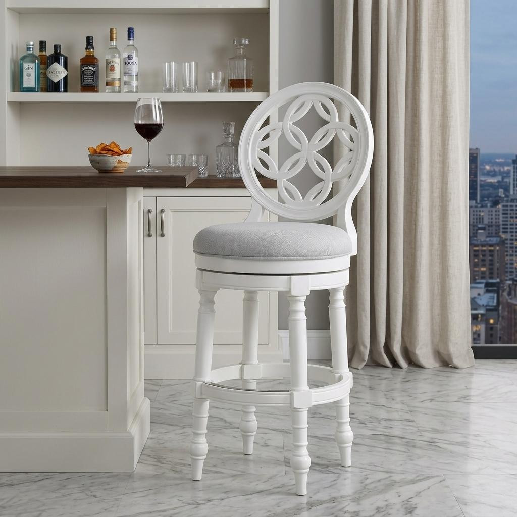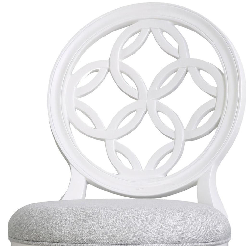 Comfort and design come together nicely in this gray and white fabric and solid wood bar height swivel bar chair. Quality construction from white solid wood combines with gray fabric to give this stool a fresh and updated look. Designed with a footrest for comfort and convenience. Not only good looking and stylish, this chair features a round shaped seat and a full back for the ultimate in comfort and enjoyment. 49.50-inch h x 23.50-inch w x 19.50-inch d.