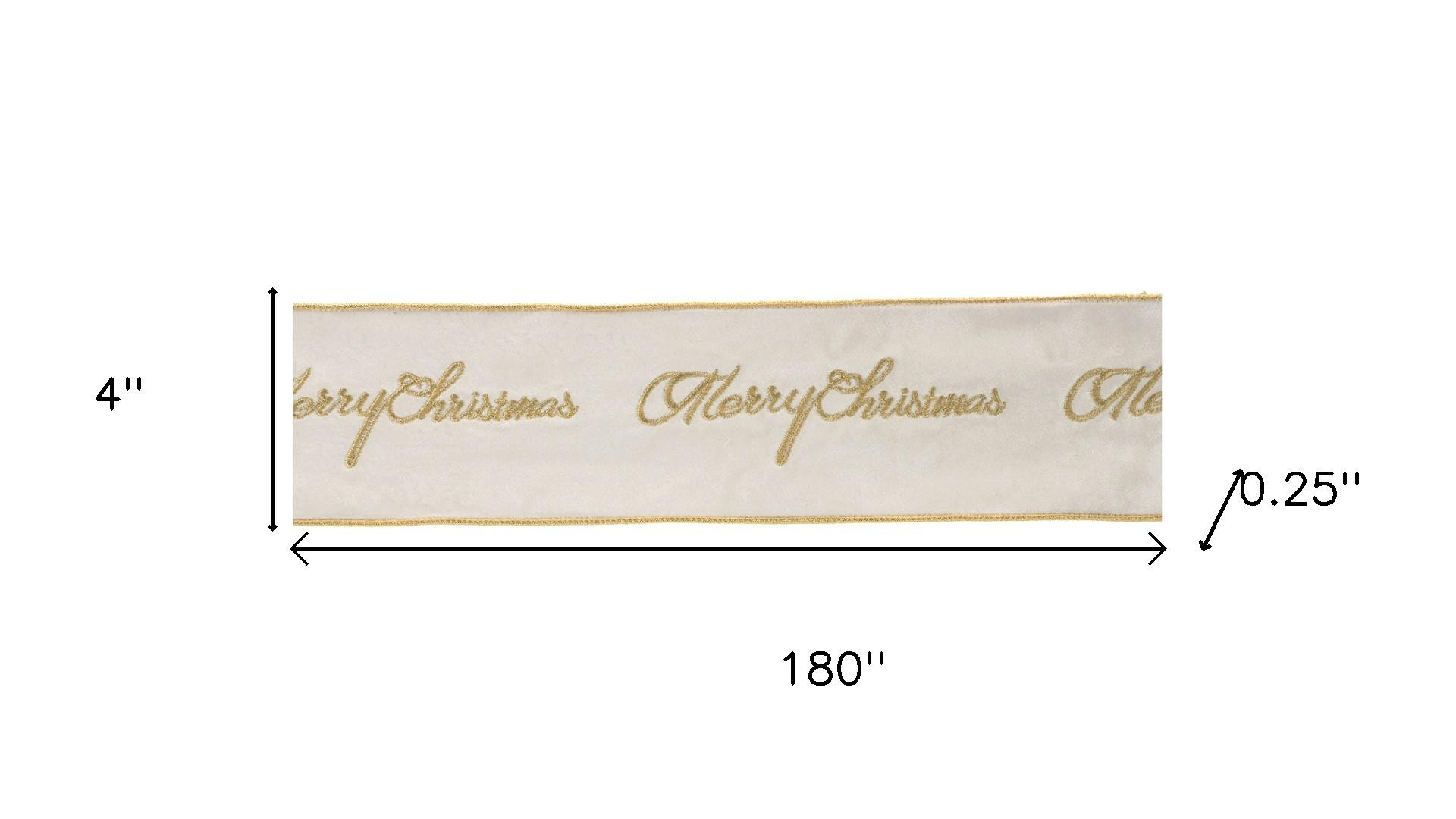 4-inch white and gold glittered Merry Christmas wired ribbon is the perfect decorative touch for your holiday celebrations. This beautiful ribbon enhances your décor with its festive gold edges and embroidered text. Crafted from high-quality polyester with wired edges that make it easily bendable and pliable. Ideal for decorating your tree, wreaths, garland, wrapping packages, or forming delightful bows. This 5-yards of ribbon with its gold accents and text that reads "Merry Christmas" allows you to celebrate the season with elegance, glamour, and flair. 4.00-inch h x 180.00-inch w x 0.25-inch d.