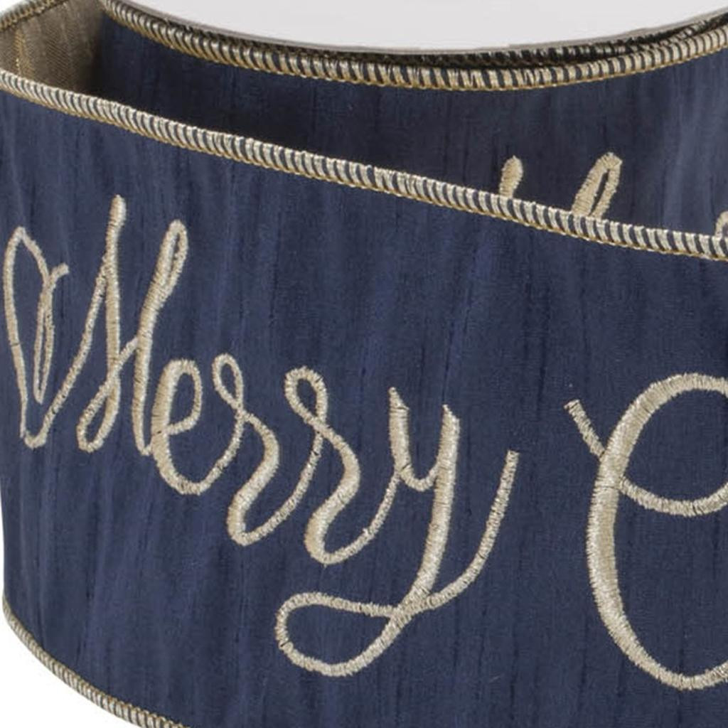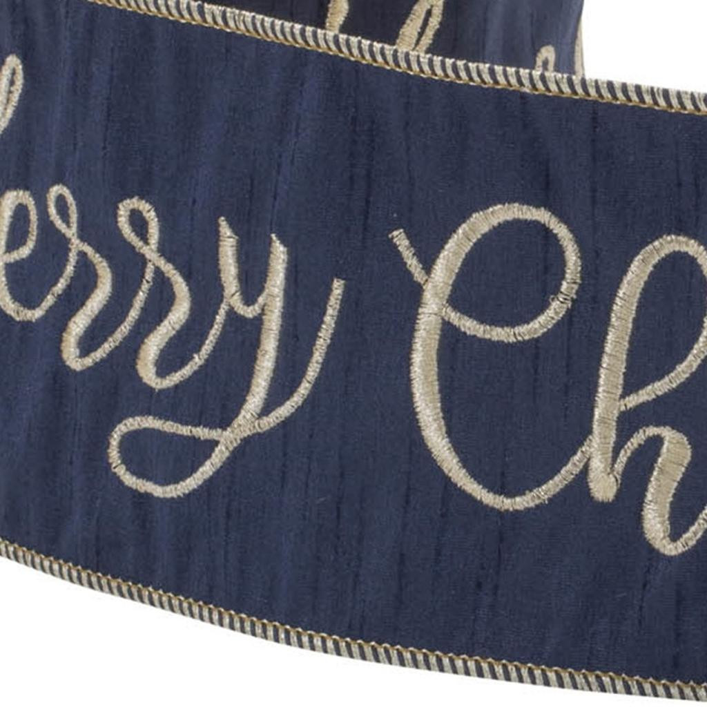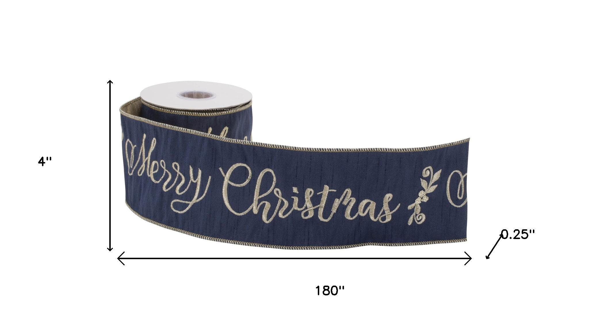 4-inch midnight and gold polyester embroidered merry Christmas wired ribbon adds a touch of elegance to your holiday decor. This beautiful ribbon enhances your décor with its festive midnight blue and shimmering gold hues. Crafted from high-quality polyester with wired edges that make it easily bendable and pliable. Ideal for decorating your tree, wreaths, garland, wrapping packages, or forming delightful bows. This 5-yards of ribbon with its glitter accents and text that reads "Merry Christmas" allows you to celebrate the season with elegance, glamour, and flair. 4.00-inch h x 180.00-inch w x 0.25-inch d.