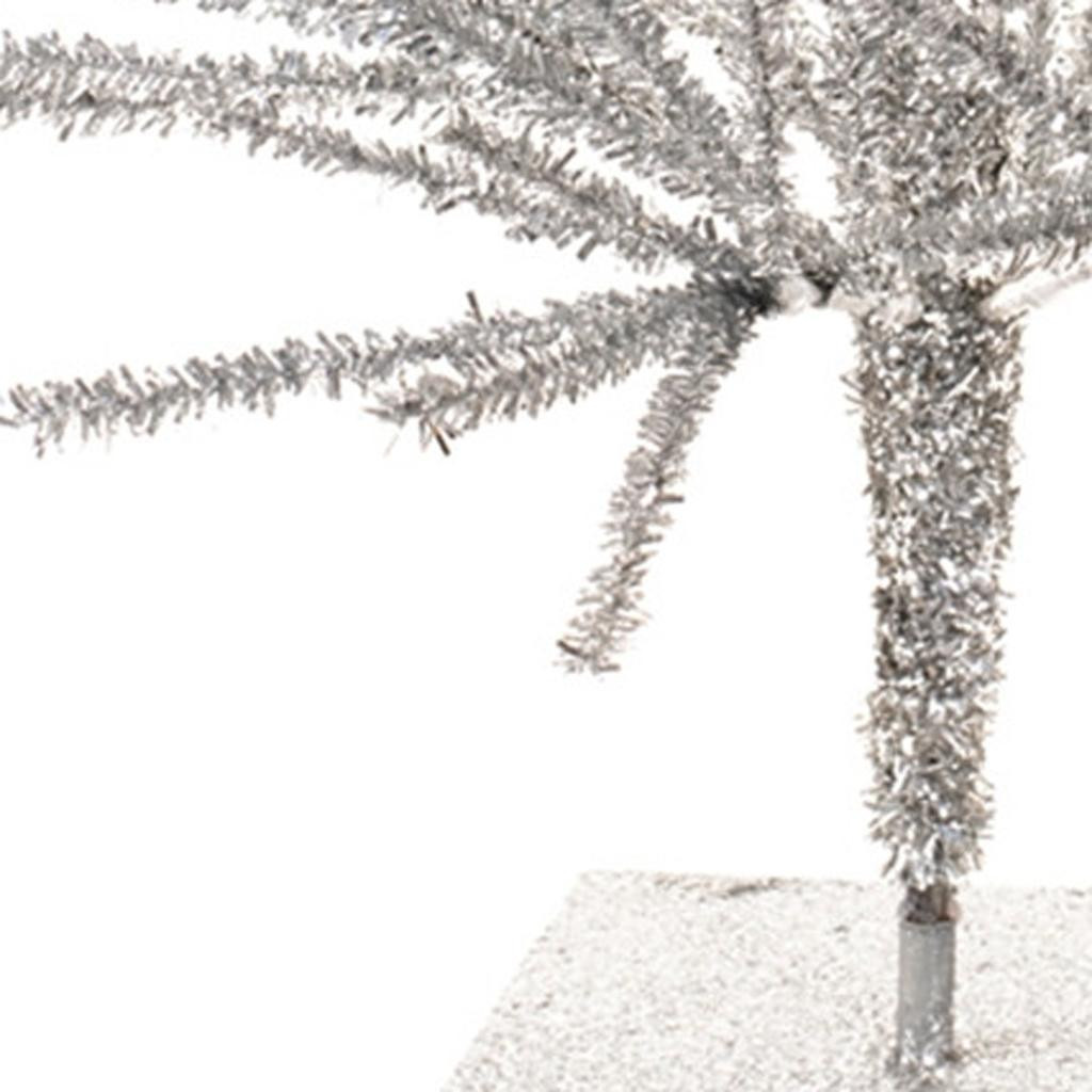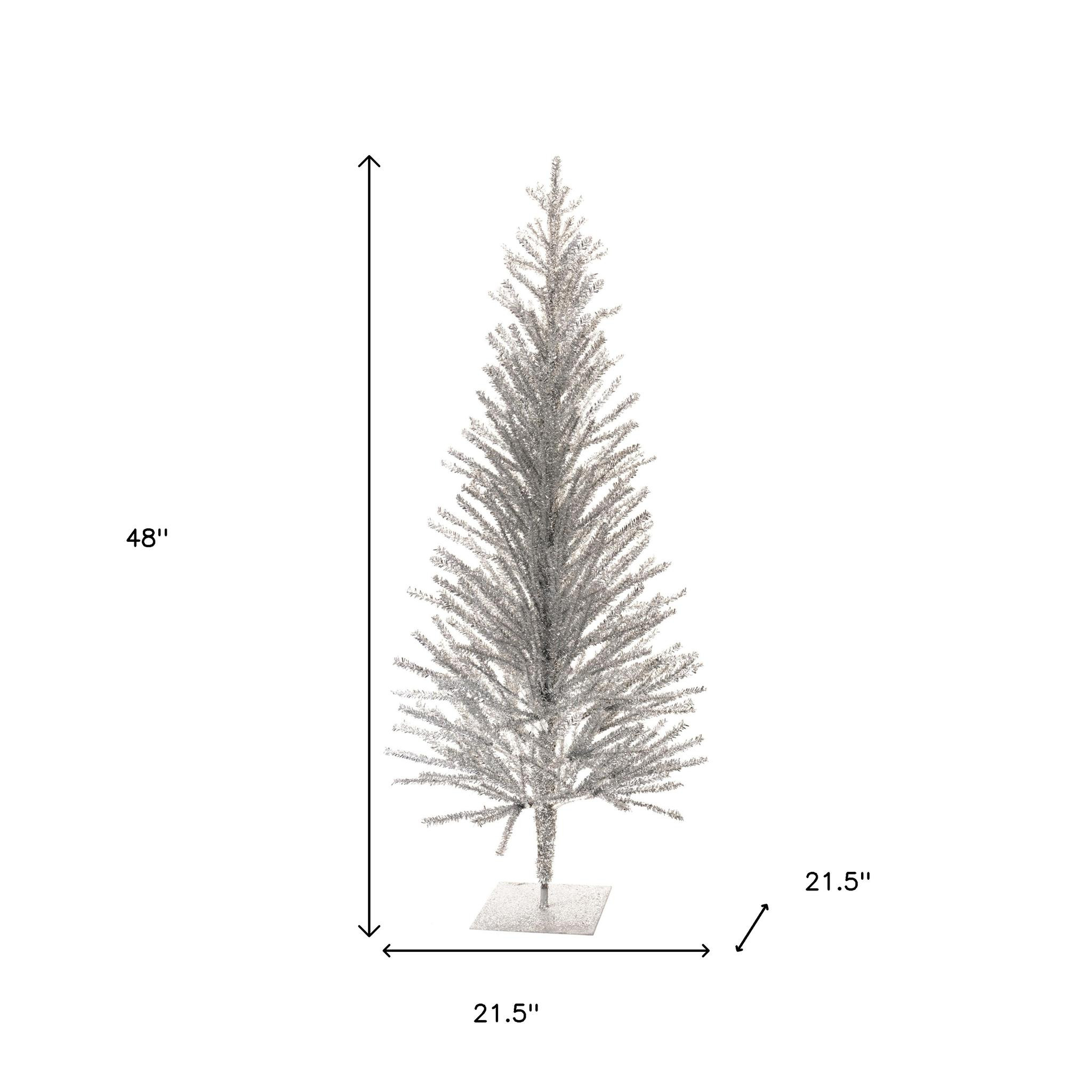 Celebrate the season in style with this 4-foot silver tinsel sparse pine christmas tree. This stunning artificial tree features a unique sparse shape that adds an elegant touch to your holiday decor. Crafted from durable metal and polyethylene plastic, it promises lasting beauty throughout the years. The shimmering silver needle color creates a frosted look that sparkles under twinkling lights. Designed for indoor use only, it perfectly enhances any room's festive atmosphere. A sturdy tree stand is included for easy setup and stability, ensuring your seasonal centerpiece remains secure. Embrace the joy of the holidays with this chic and modern addition to your celebrations. 48.00-inch h x 21.50-inch w x 21.50-inch d.