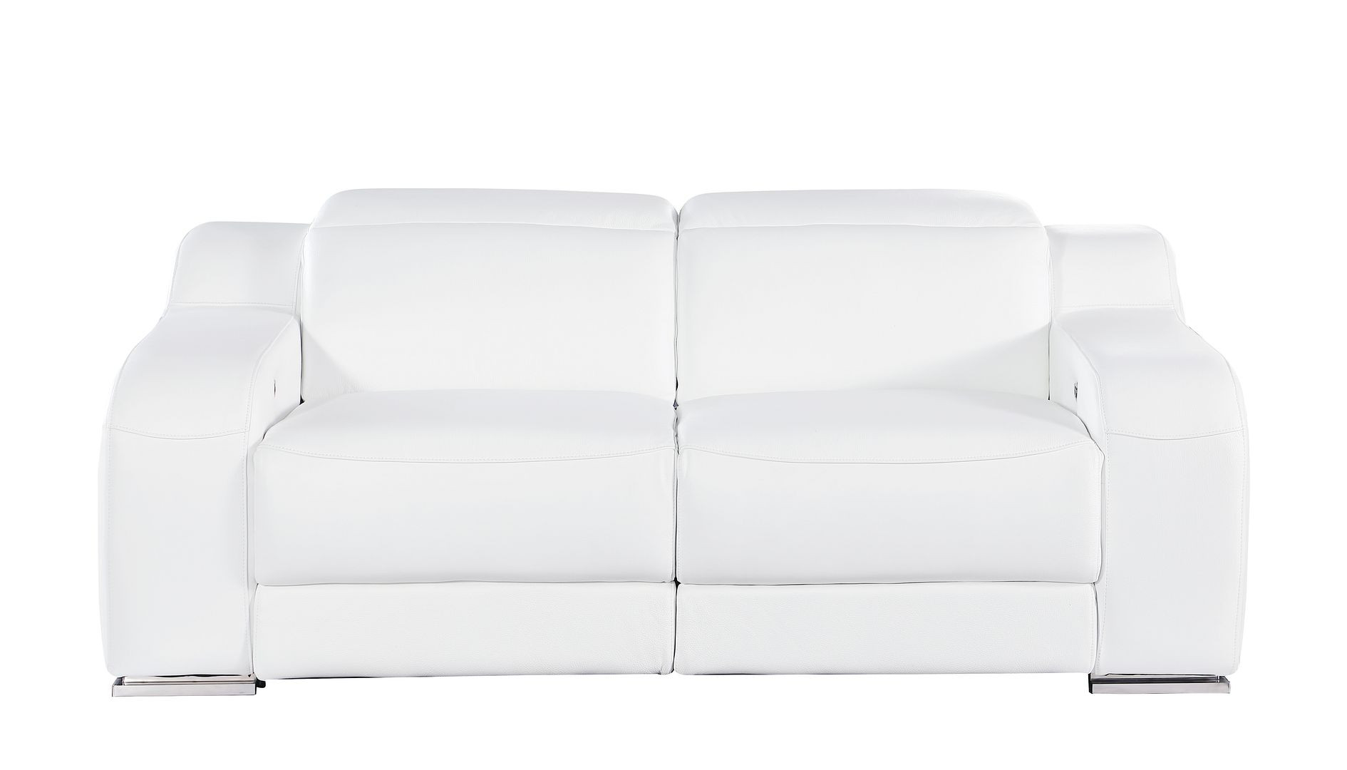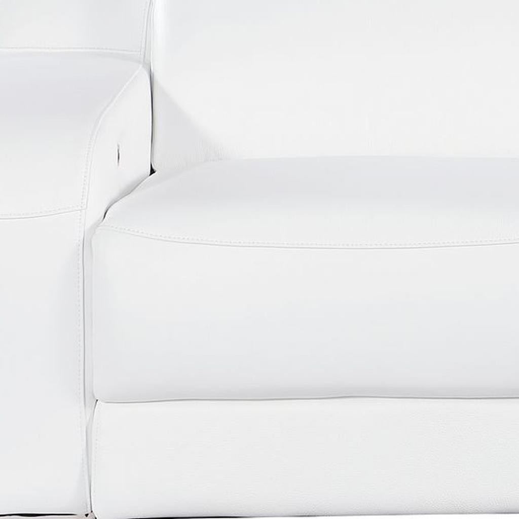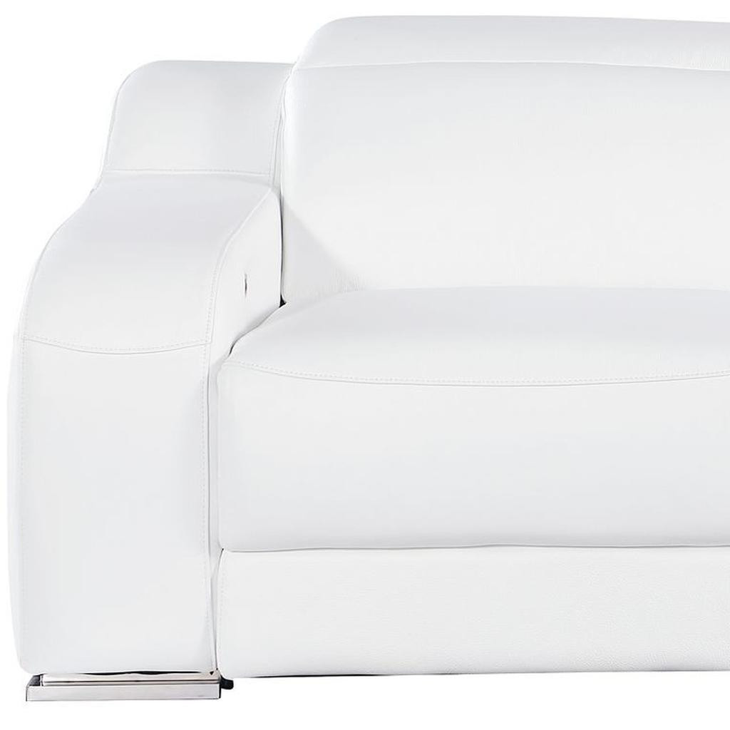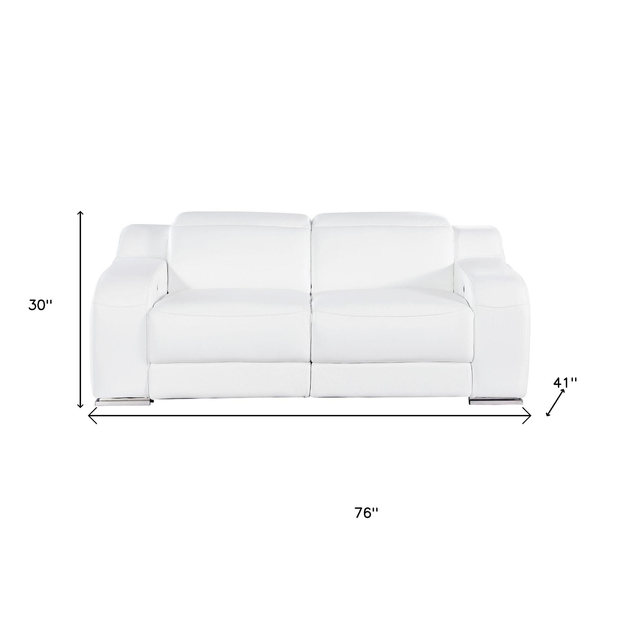 An interior designer's dream, this buttery soft high grade leather 76-inch white and silver italian leather power reclining loveseat will bring just the right touch to your space. The high grade premium leather used makes your lounging luxuriously comfortable and adds an elegant appeal to your space. Square arms offer a comfy place to rest and give this piece some interest and shape. Silver steel legs effortlessly elevate the room and add a touch of contemporary design. A great showpiece for your room, this sofa is a must have. 30.00-inch h x 76.00-inch w x 41.00-inch d.