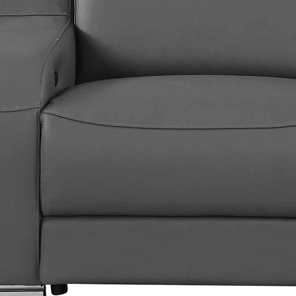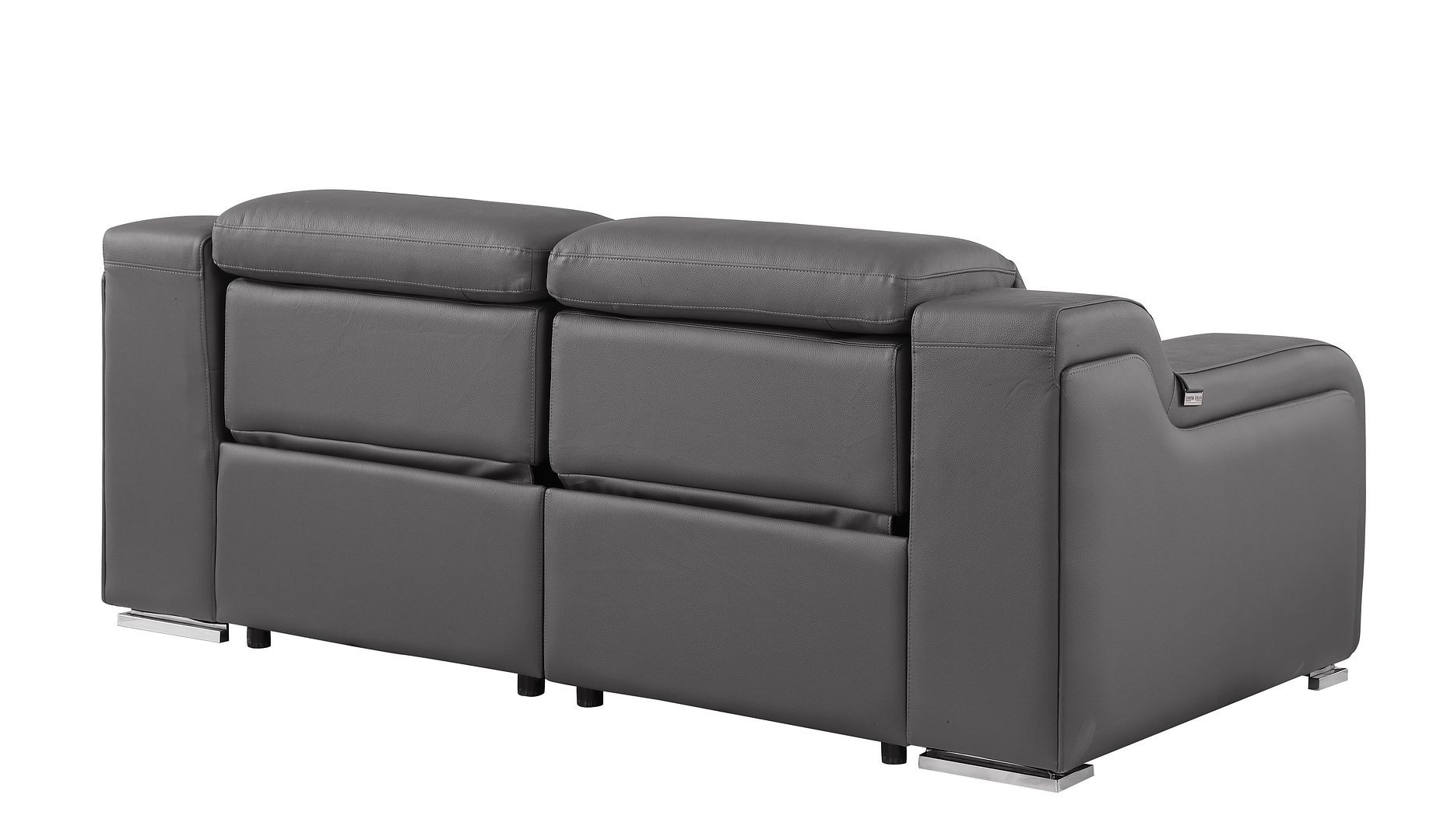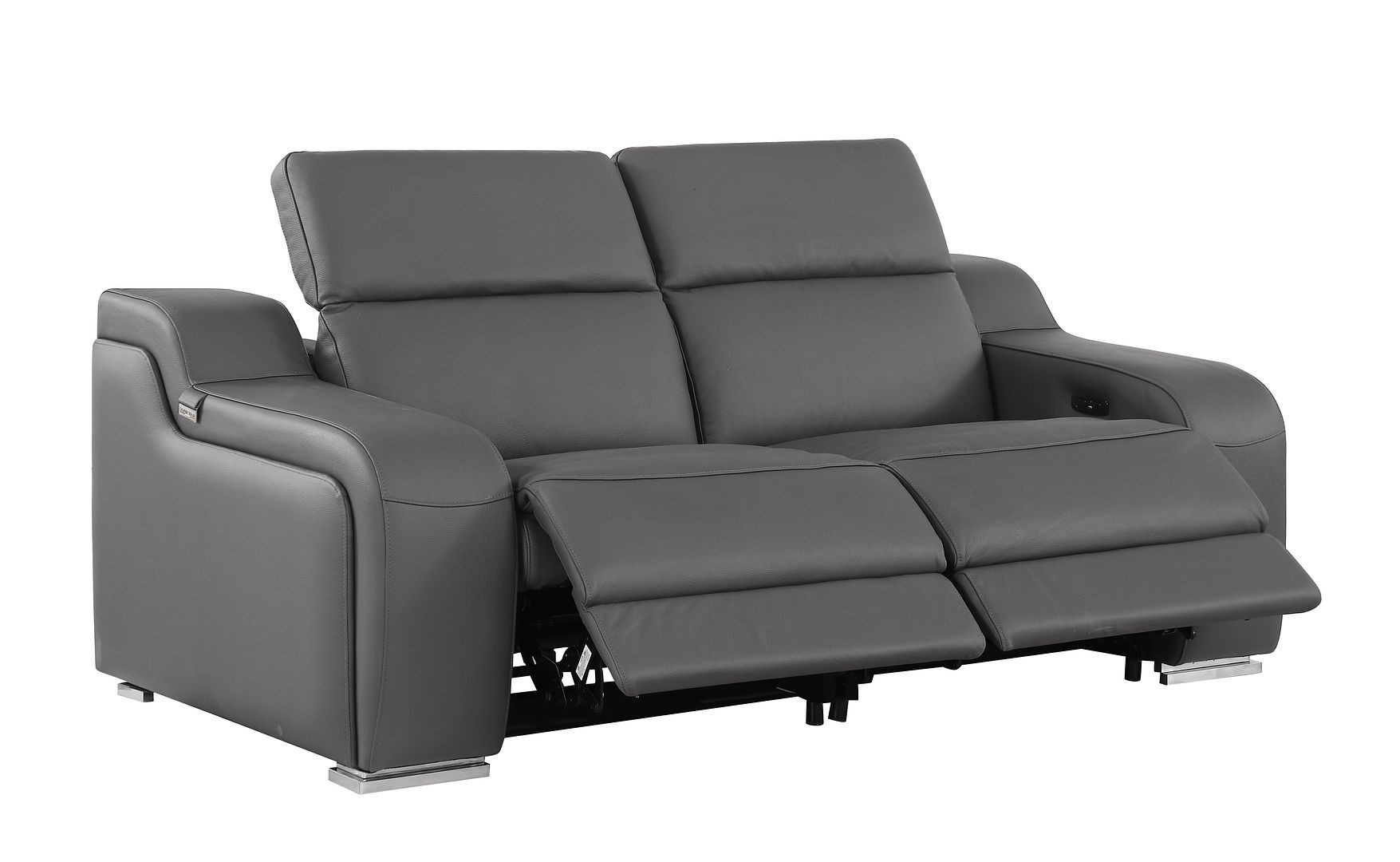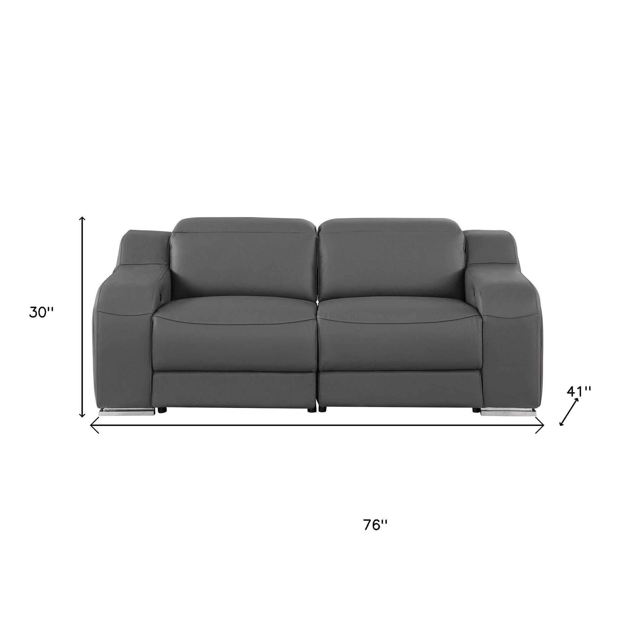 Superior construction from fabulously soft and high grade leather gives this 76-inch dark gray and silver italian leather power reclining loveseat a leg up on the competition. The high grade premium leather used makes your lounging luxuriously comfortable and adds an elegant appeal to your space. Square arms offer a comfy place to rest and give this piece some interest and shape. Silver steel legs effortlessly elevate the room and add a touch of contemporary design. A great showpiece for your room, this sofa is a must have. 30.00-inch h x 76.00-inch w x 41.00-inch d.