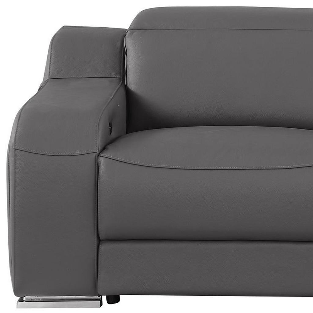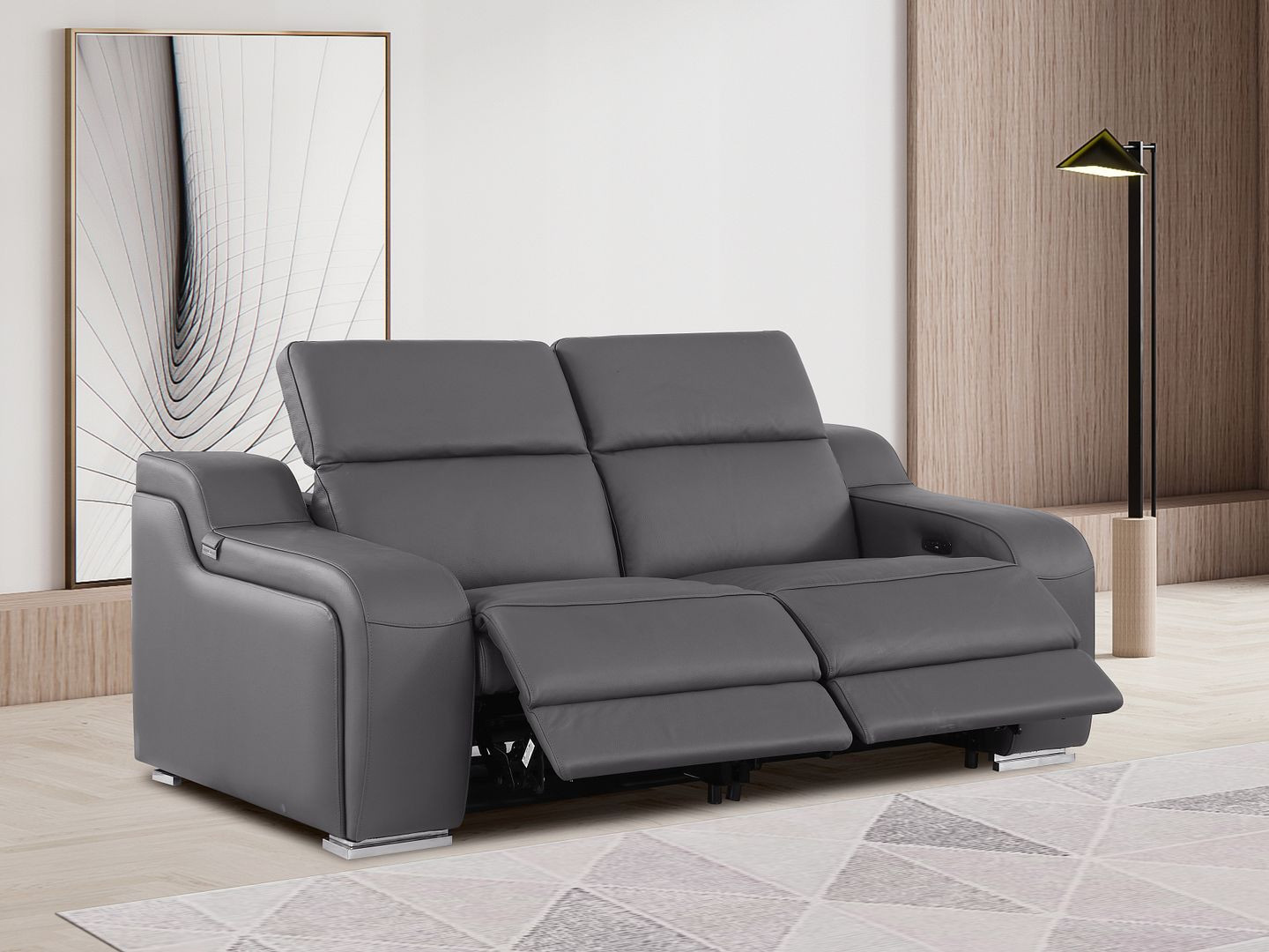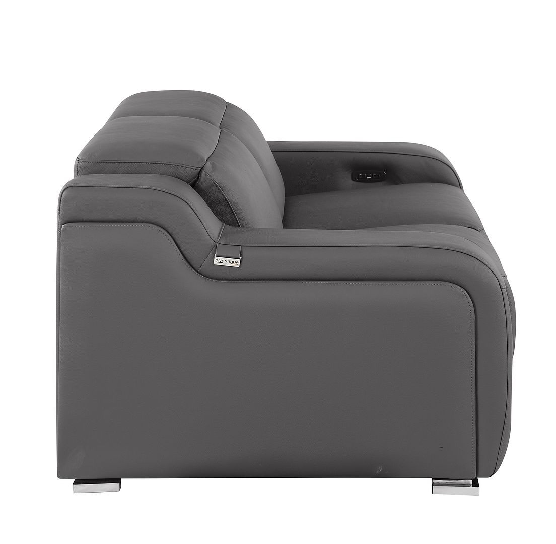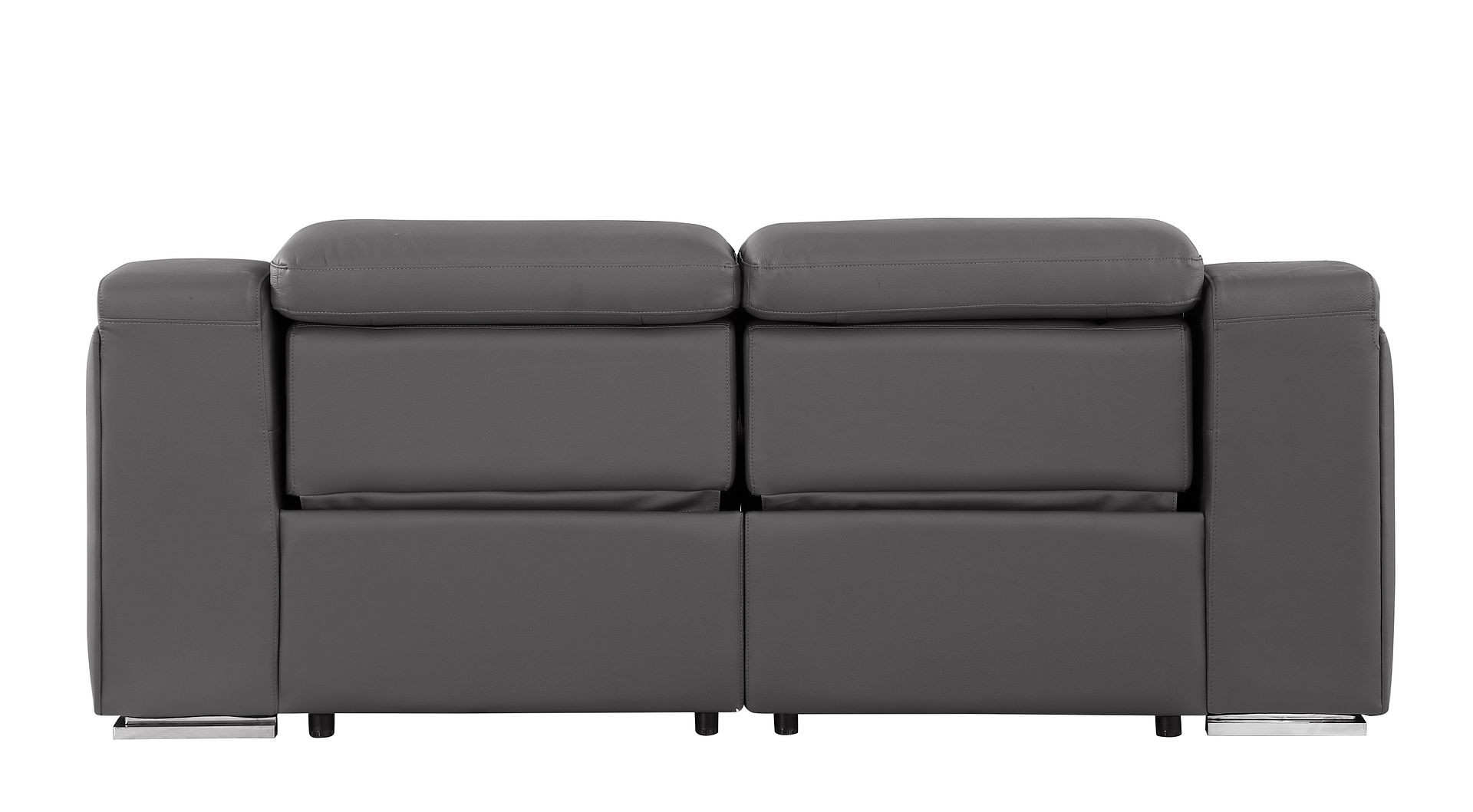 Superior construction from fabulously soft and high grade leather gives this 76-inch dark gray and silver italian leather power reclining loveseat a leg up on the competition. The high grade premium leather used makes your lounging luxuriously comfortable and adds an elegant appeal to your space. Square arms offer a comfy place to rest and give this piece some interest and shape. Silver steel legs effortlessly elevate the room and add a touch of contemporary design. A great showpiece for your room, this sofa is a must have. 30.00-inch h x 76.00-inch w x 41.00-inch d.