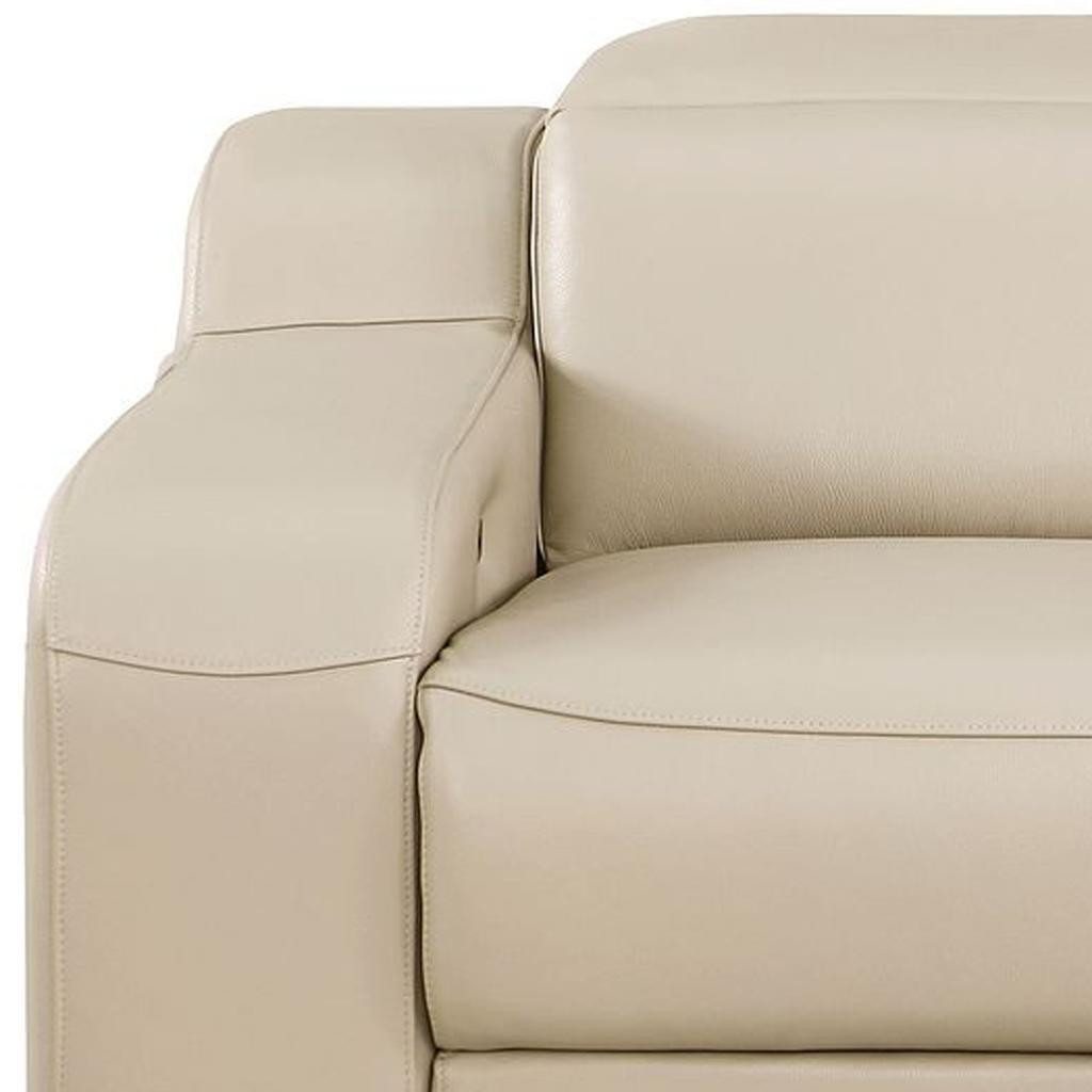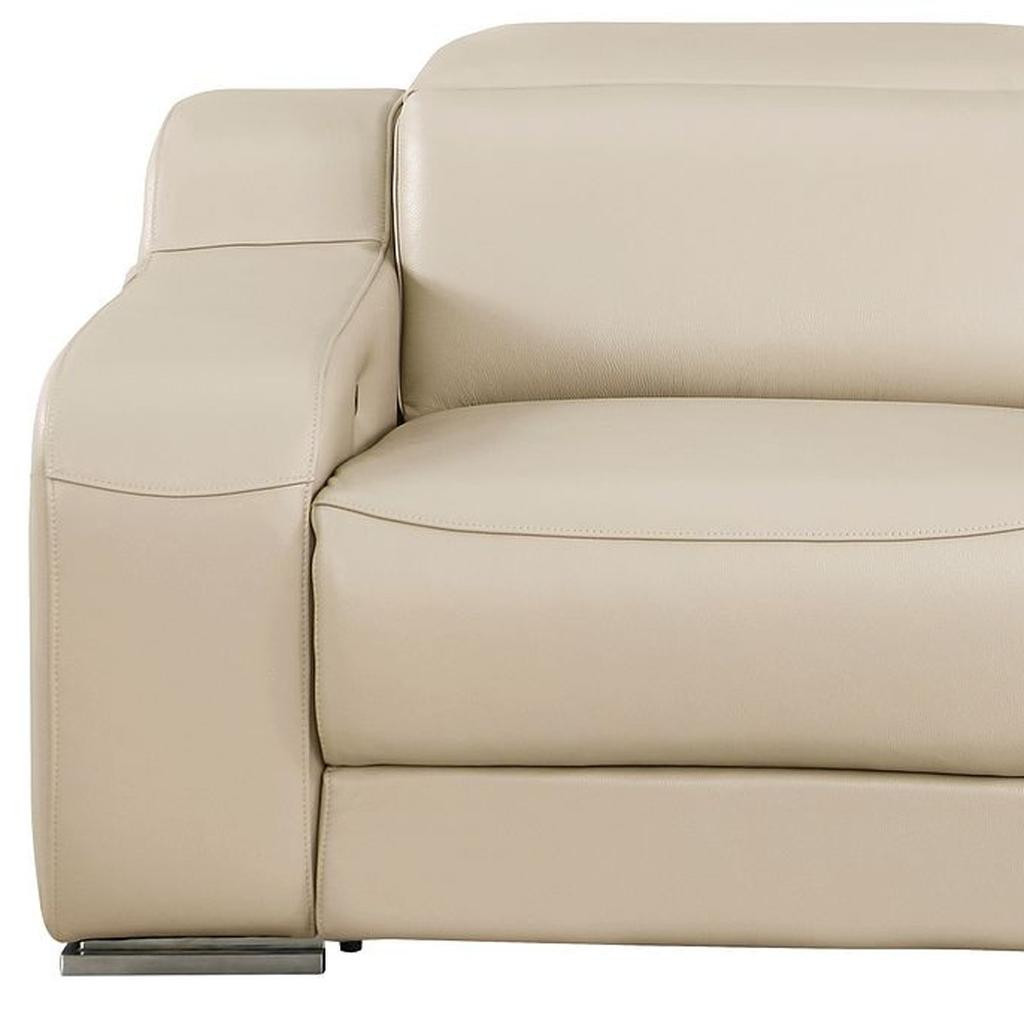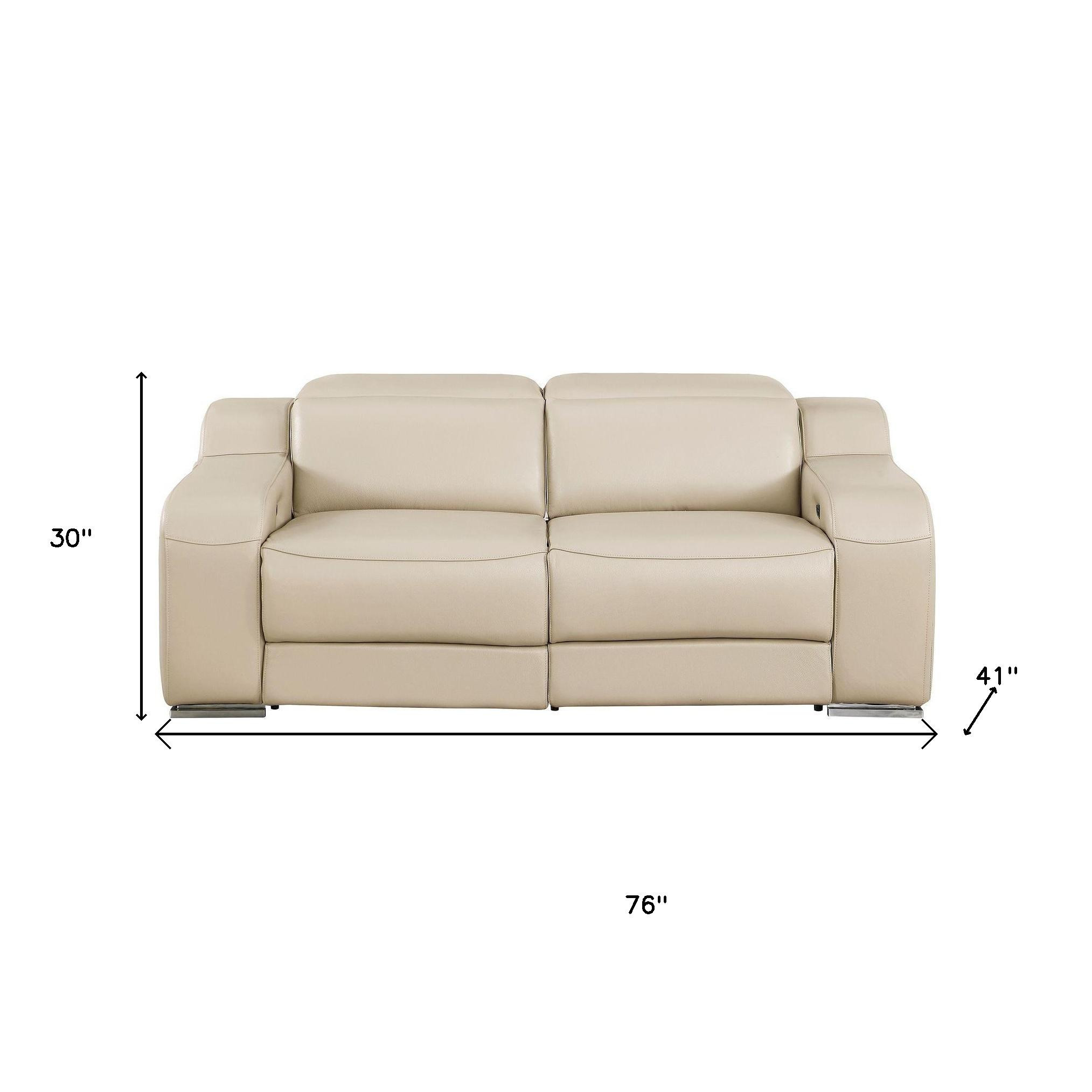 Made of top quality, supple leather, this 76-inch beige and silver italian leather power reclining loveseat will be the star of your space. The high grade premium leather used makes your lounging luxuriously comfortable and adds an elegant appeal to your space. Square arms offer a comfy place to rest and give this piece some interest and shape. Silver steel legs effortlessly elevate the room and add a touch of contemporary design. A great showpiece for your room, this sofa is a must have. 30.00-inch h x 76.00-inch w x 41.00-inch d.