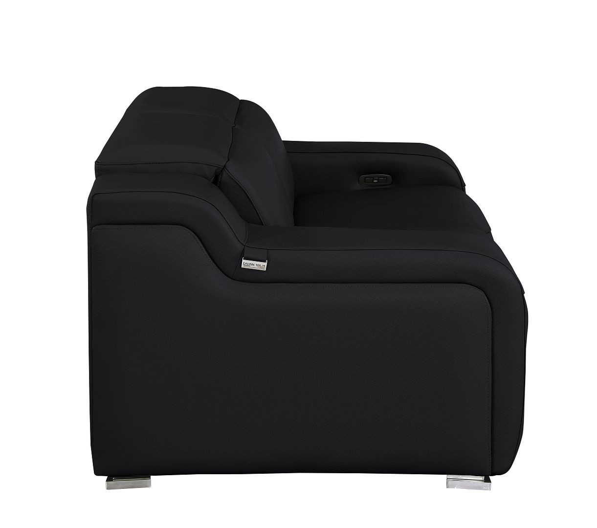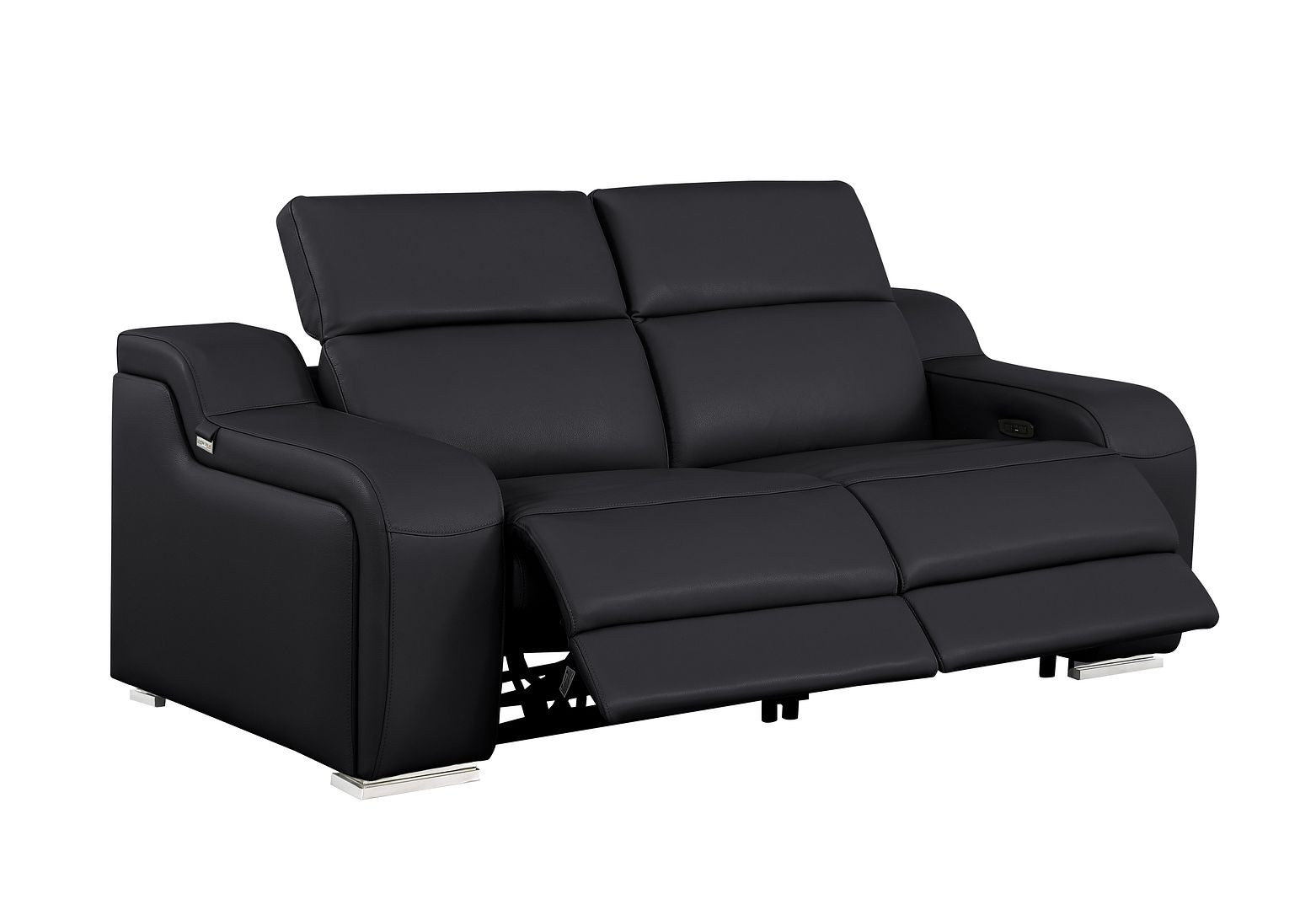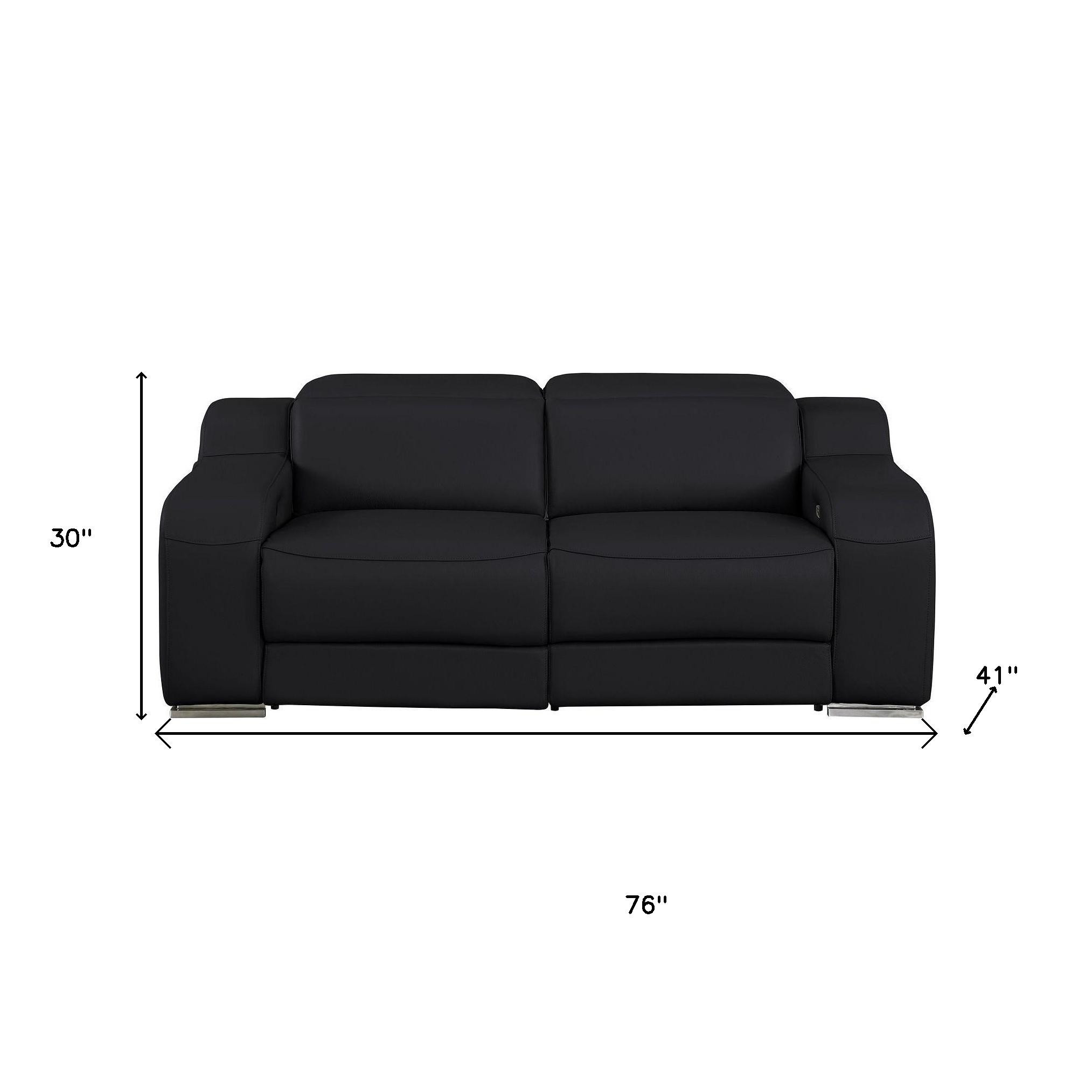 Superior construction from fabulously soft and high grade leather gives this 76-inch black and silver italian leather power reclining loveseat a leg up on the competition. The high grade premium leather used makes your lounging luxuriously comfortable and adds an elegant appeal to your space. Square arms offer a comfy place to rest and give this piece some interest and shape. Silver steel legs effortlessly elevate the room and add a touch of contemporary design. A great showpiece for your room, this sofa is a must have. 30.00-inch h x 76.00-inch w x 41.00-inch d.