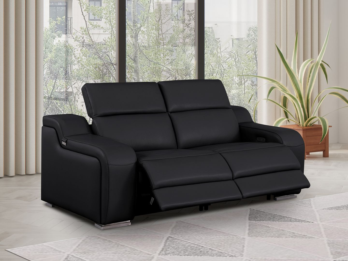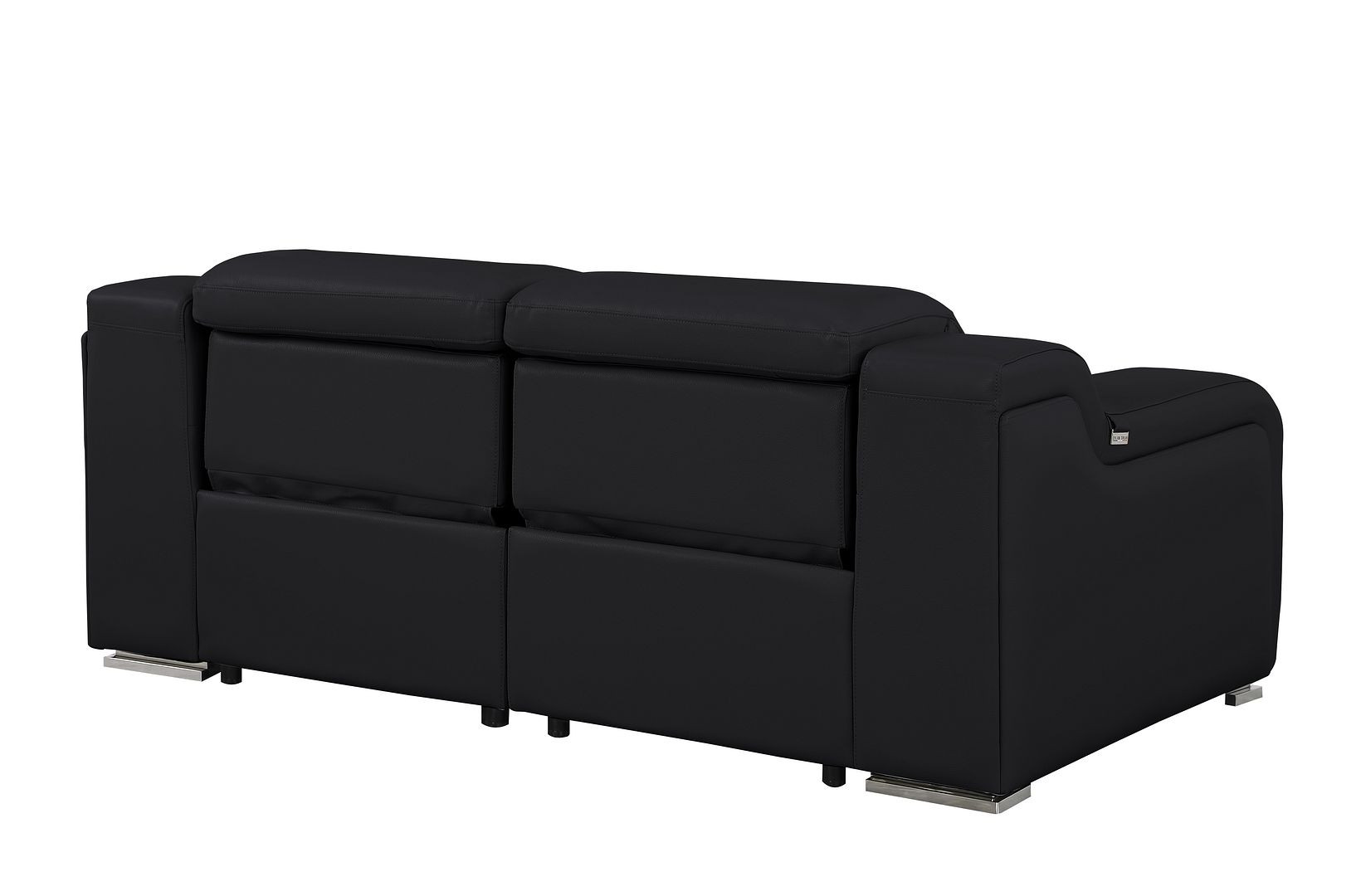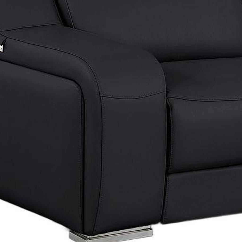 Superior construction from fabulously soft and high grade leather gives this 76-inch black and silver italian leather power reclining loveseat a leg up on the competition. The high grade premium leather used makes your lounging luxuriously comfortable and adds an elegant appeal to your space. Square arms offer a comfy place to rest and give this piece some interest and shape. Silver steel legs effortlessly elevate the room and add a touch of contemporary design. A great showpiece for your room, this sofa is a must have. 30.00-inch h x 76.00-inch w x 41.00-inch d.