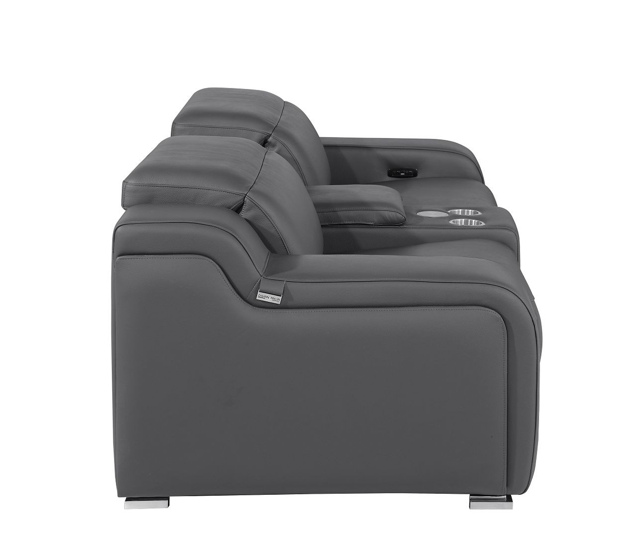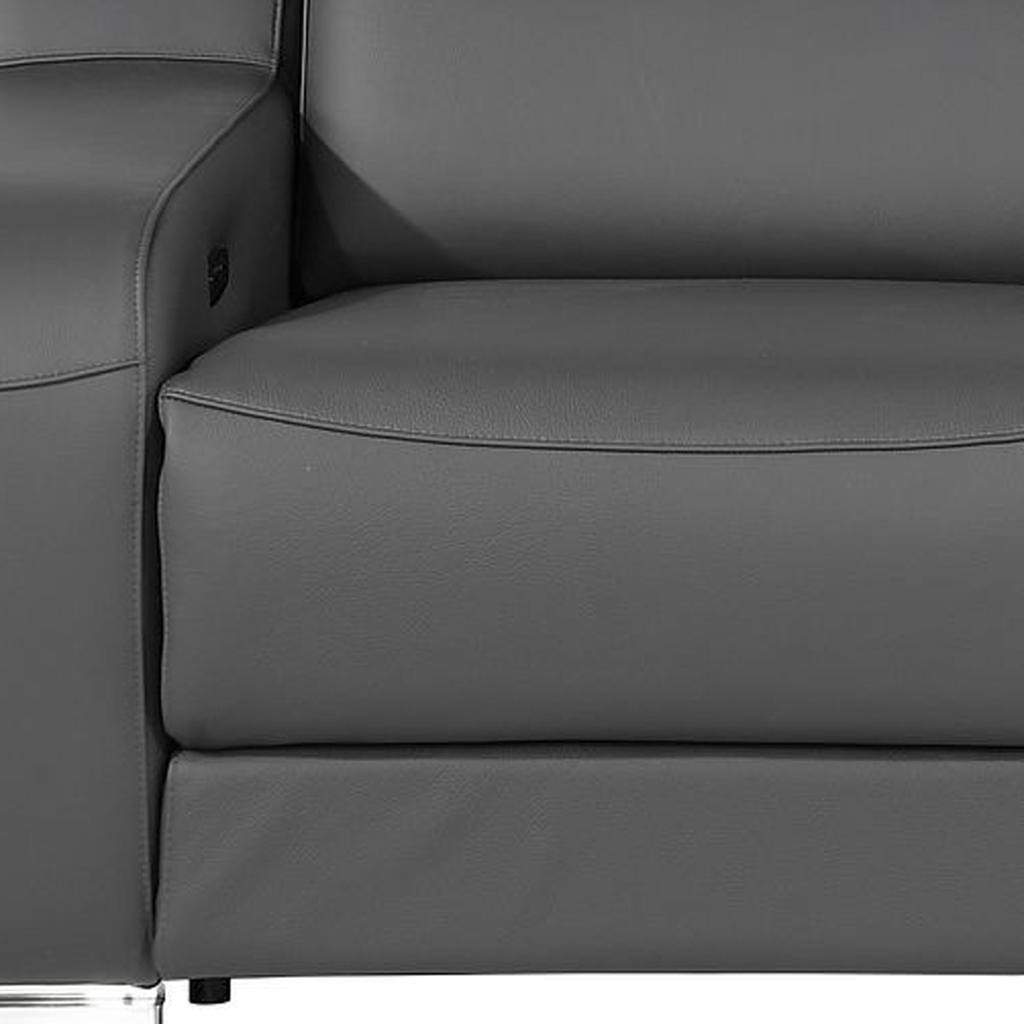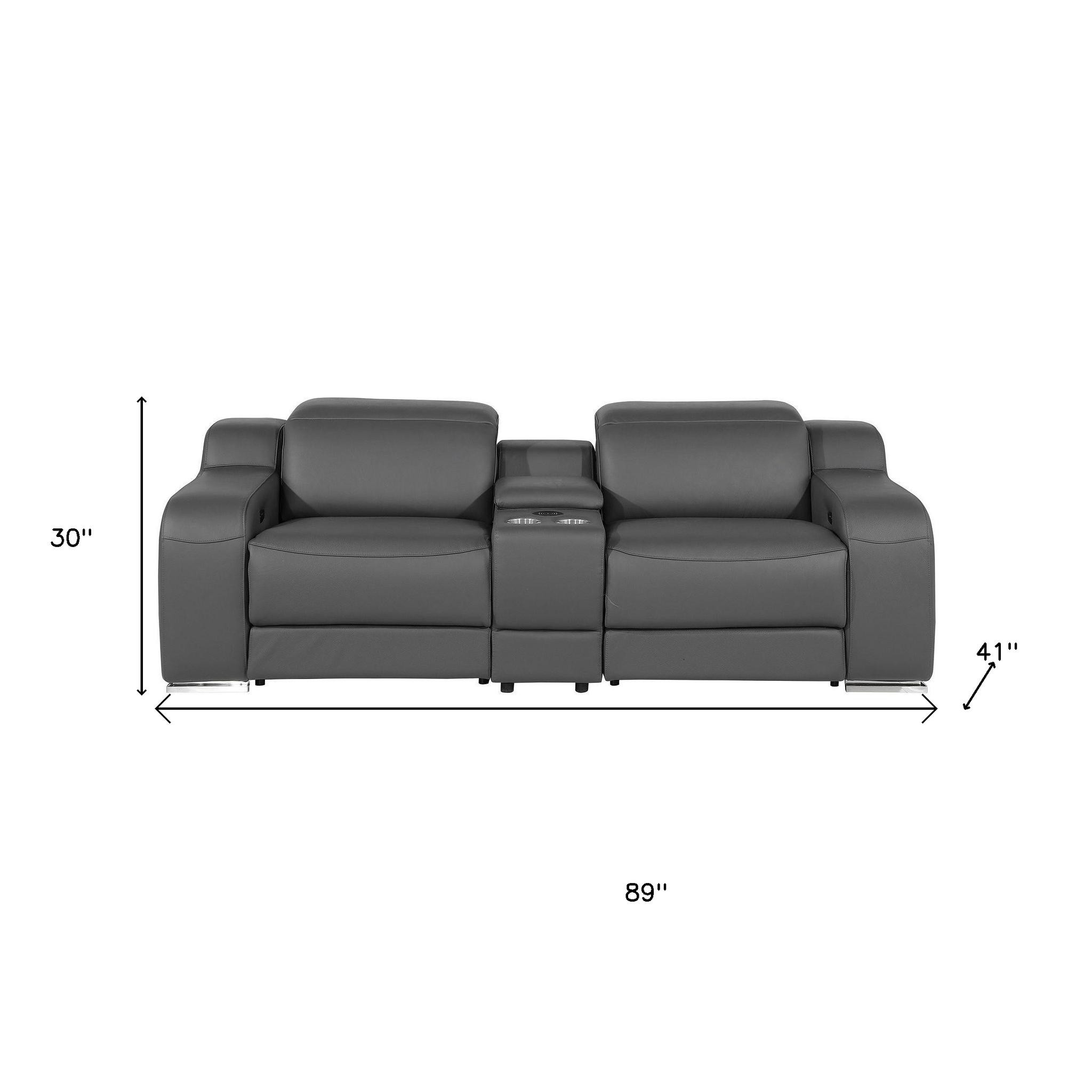 An interior designer's dream, this buttery soft high grade leather 89-inch dark gray and silver italian leather power reclining loveseat with storage will bring just the right touch to your space. The high grade premium leather used makes your lounging luxuriously comfortable and adds an elegant appeal to your space. Square arms offer a comfy place to rest and give this piece some interest and shape. Silver steel legs effortlessly elevate the room and add a touch of contemporary design. A great showpiece for your room, this sofa is a must have. 30.00-inch h x 89.00-inch w x 41.00-inch d.