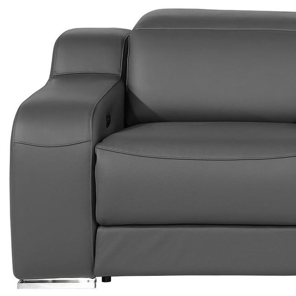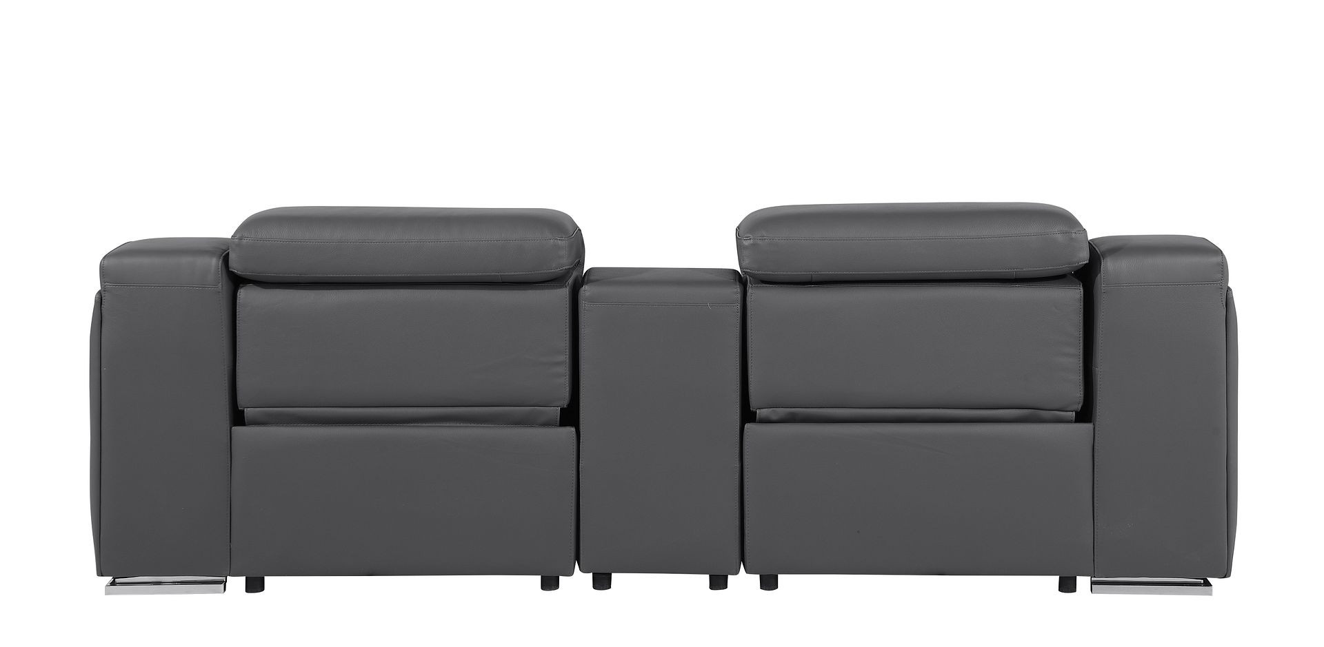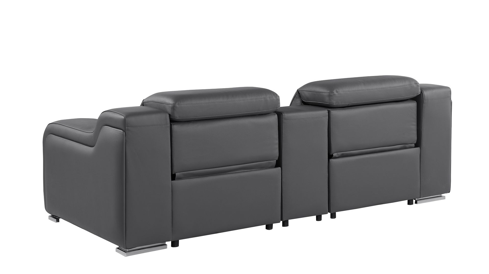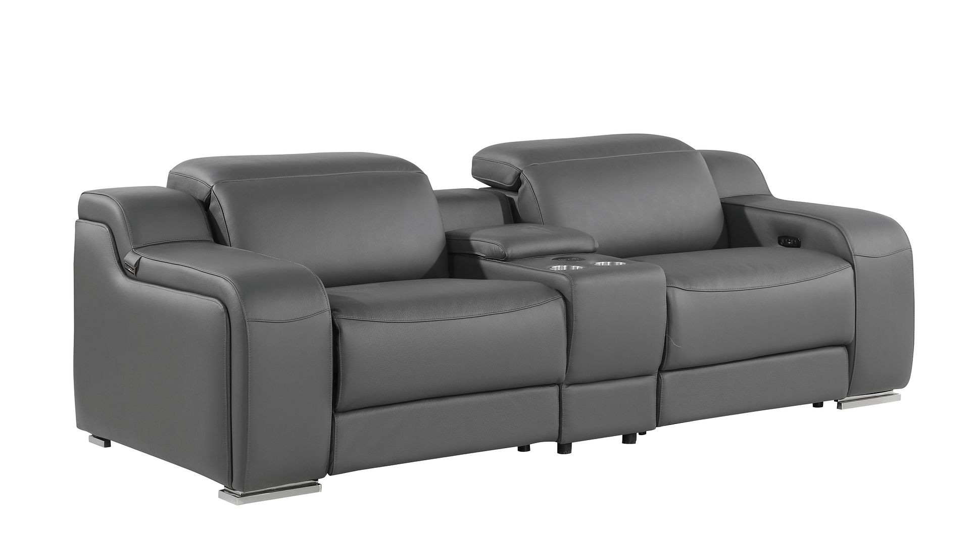 An interior designer's dream, this buttery soft high grade leather 89-inch dark gray and silver italian leather power reclining loveseat with storage will bring just the right touch to your space. The high grade premium leather used makes your lounging luxuriously comfortable and adds an elegant appeal to your space. Square arms offer a comfy place to rest and give this piece some interest and shape. Silver steel legs effortlessly elevate the room and add a touch of contemporary design. A great showpiece for your room, this sofa is a must have. 30.00-inch h x 89.00-inch w x 41.00-inch d.