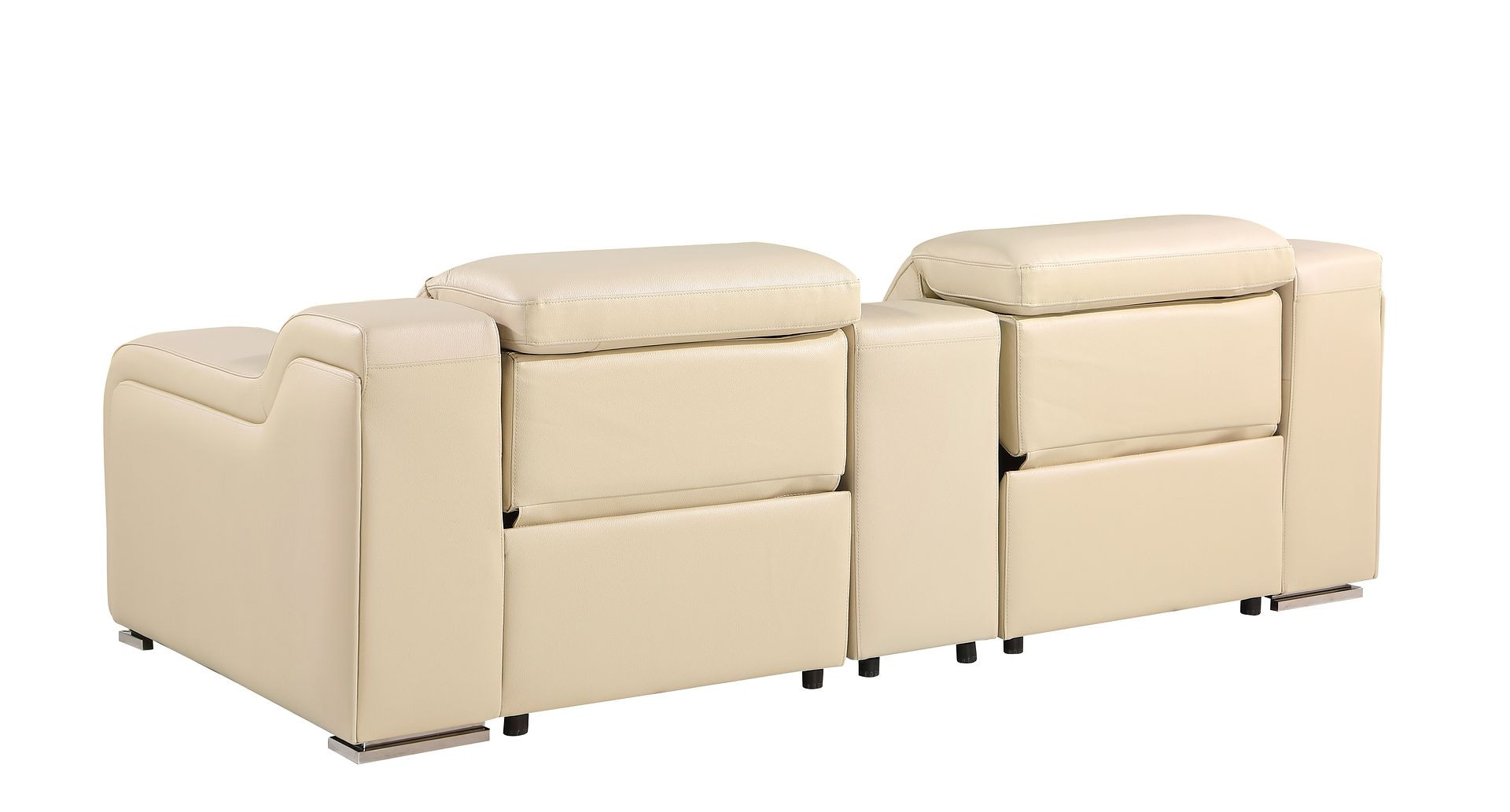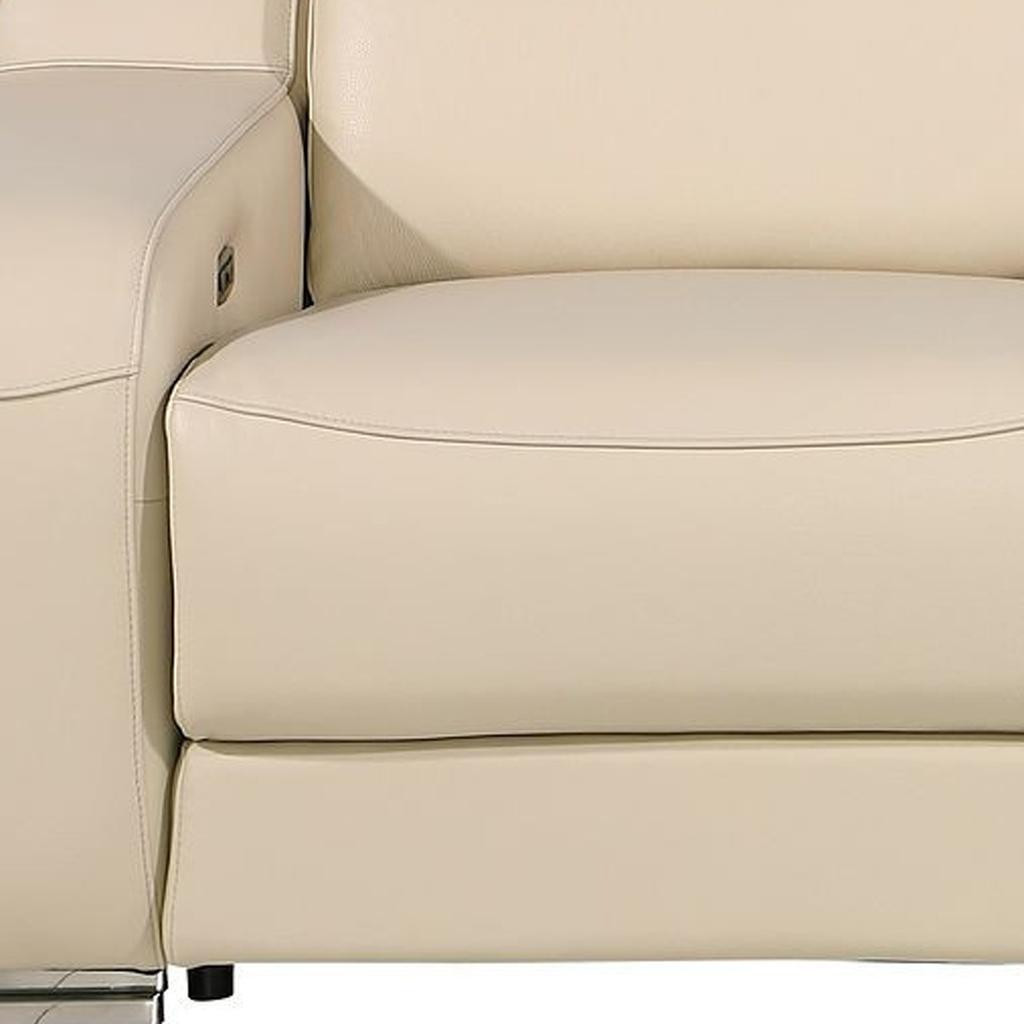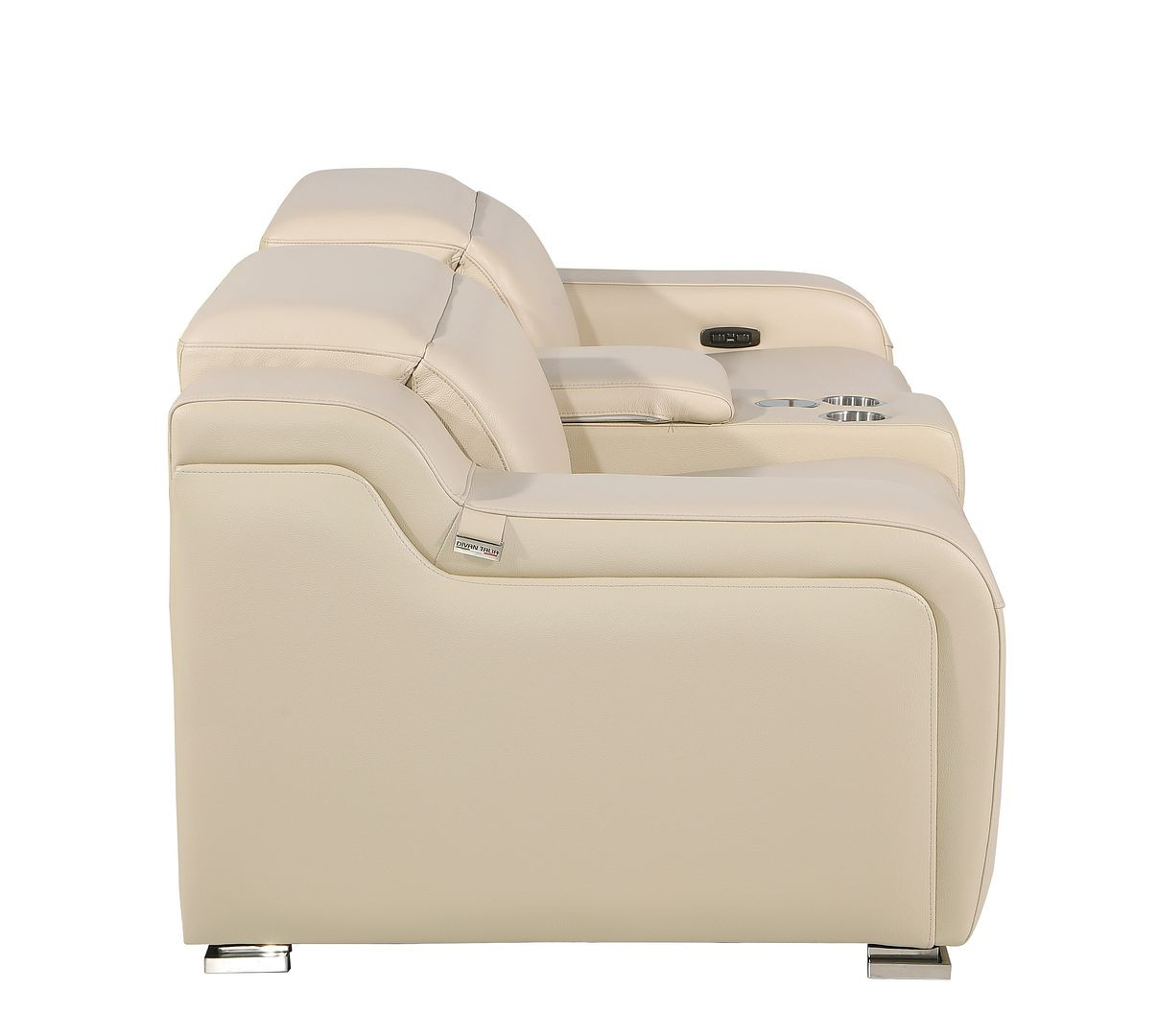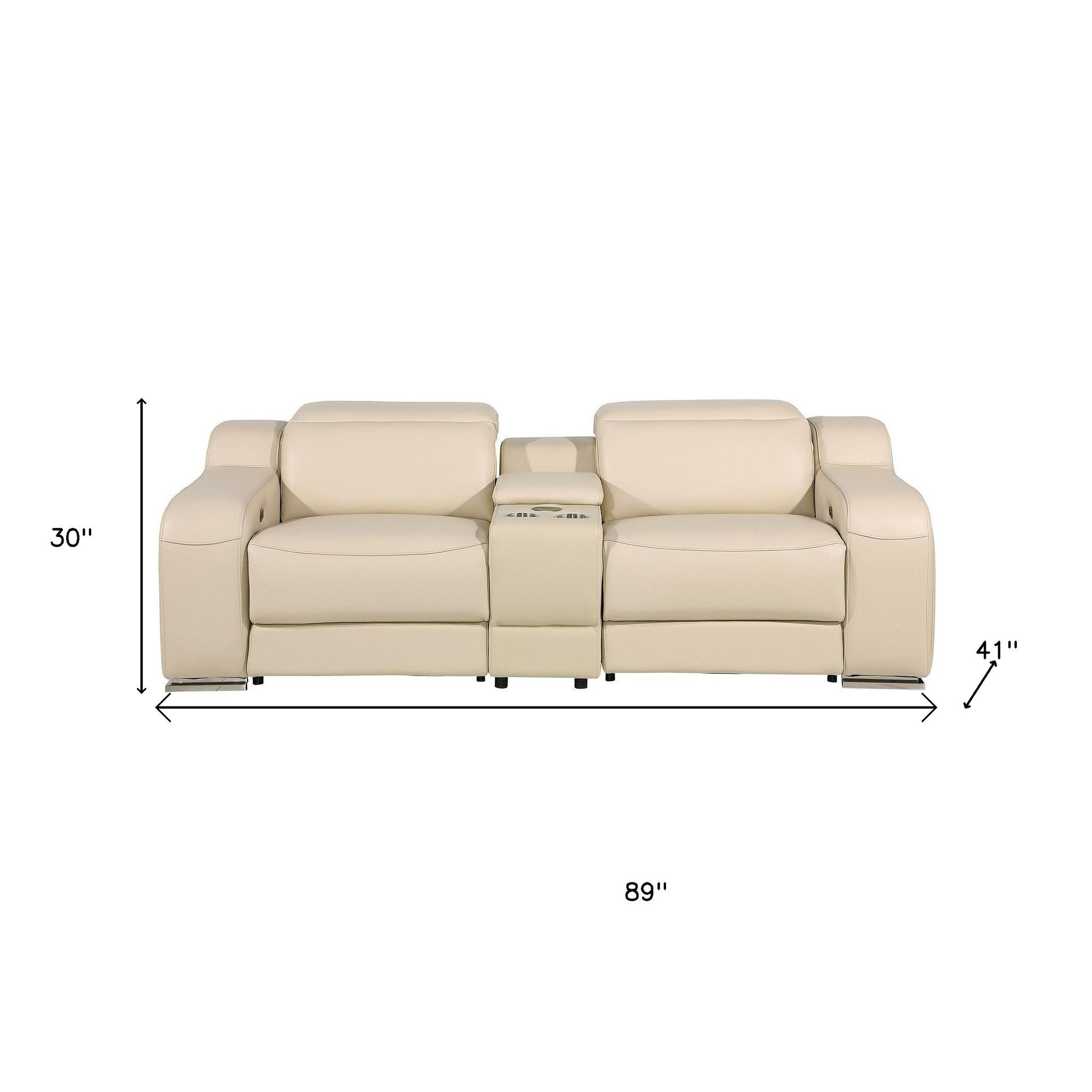 Made of top quality, supple leather, this 89-inch beige and silver italian leather power reclining loveseat with storage will be the star of your space. The high grade premium leather used makes your lounging luxuriously comfortable and adds an elegant appeal to your space. Square arms offer a comfy place to rest and give this piece some interest and shape. Silver steel legs effortlessly elevate the room and add a touch of contemporary design. A great showpiece for your room, this sofa is a must have. 30.00-inch h x 89.00-inch w x 41.00-inch d.