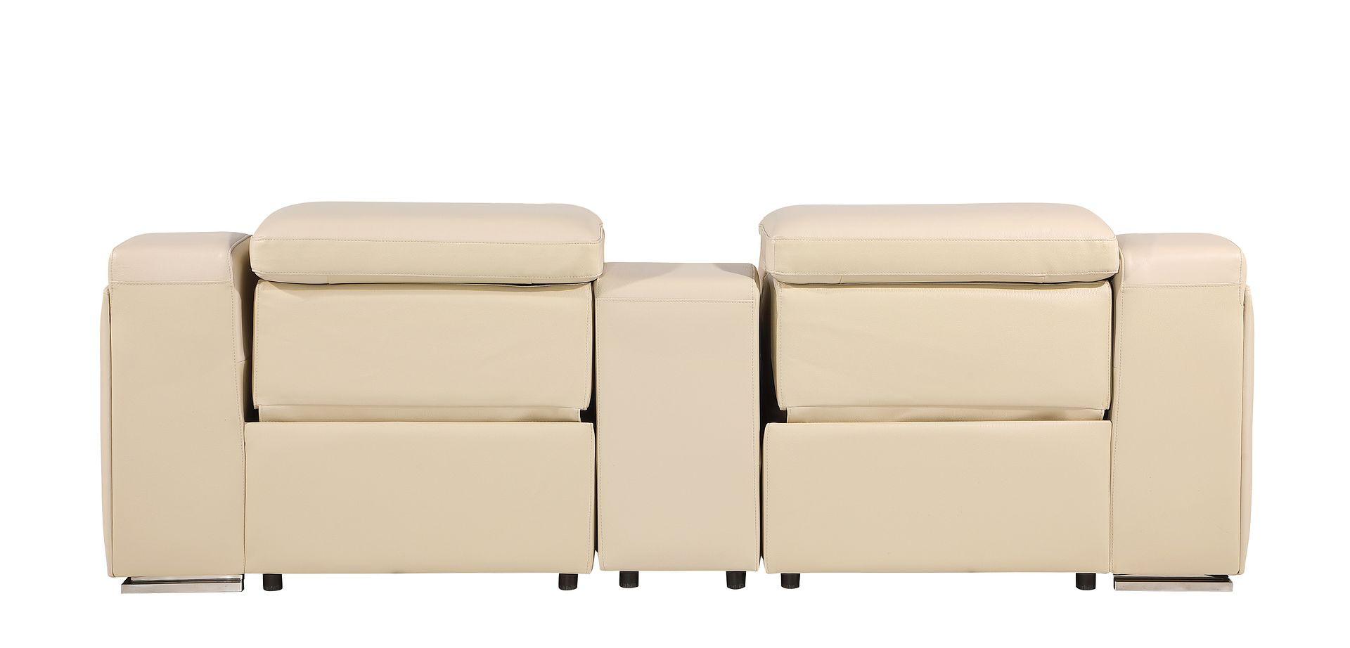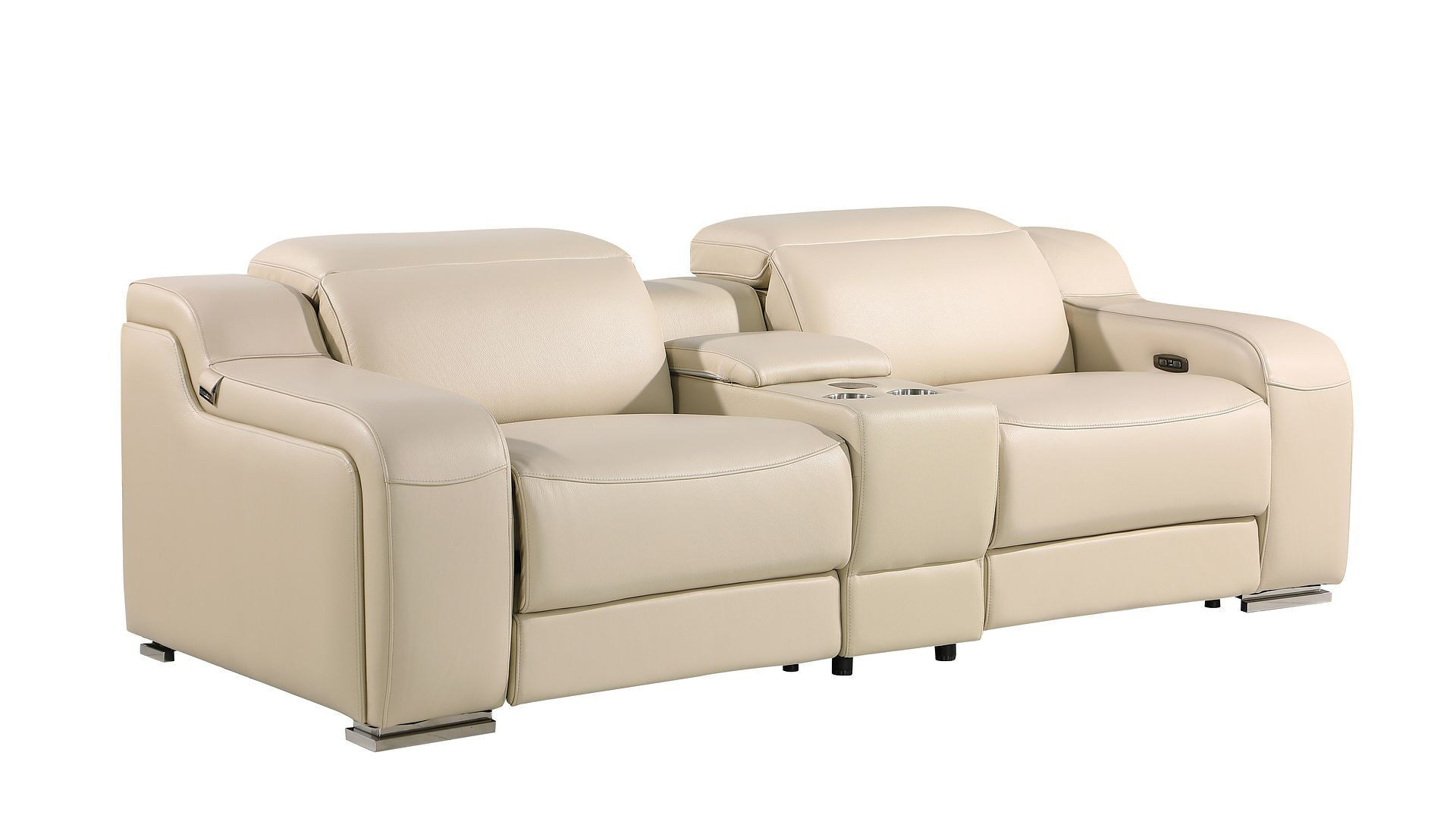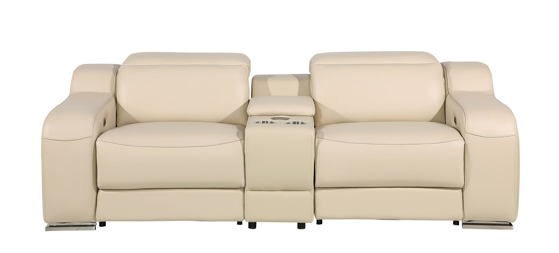 Made of top quality, supple leather, this 89-inch beige and silver italian leather power reclining loveseat with storage will be the star of your space. The high grade premium leather used makes your lounging luxuriously comfortable and adds an elegant appeal to your space. Square arms offer a comfy place to rest and give this piece some interest and shape. Silver steel legs effortlessly elevate the room and add a touch of contemporary design. A great showpiece for your room, this sofa is a must have. 30.00-inch h x 89.00-inch w x 41.00-inch d.