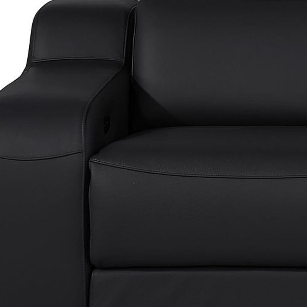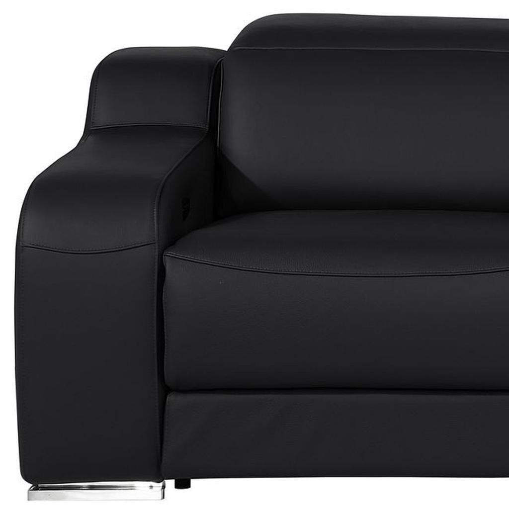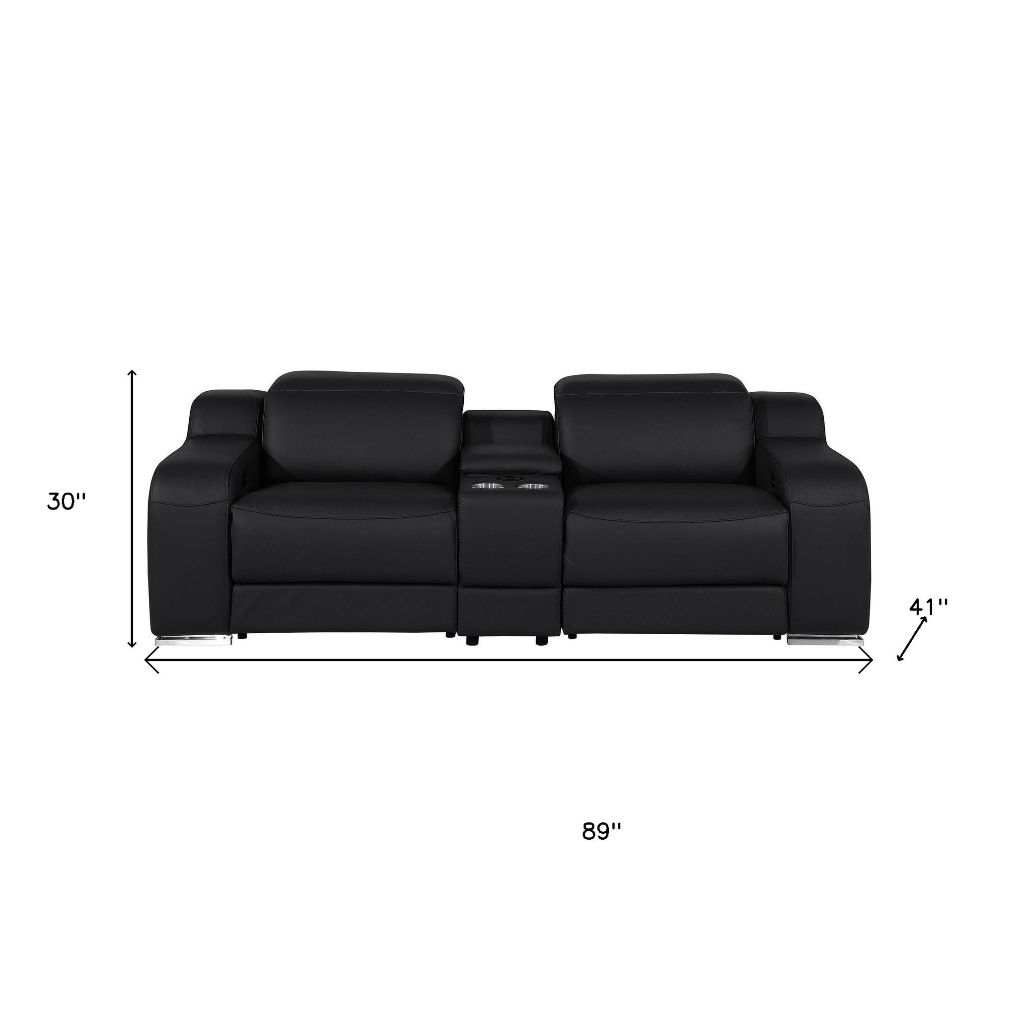 Made of top quality, supple leather, this 89-inch black and silver italian leather power reclining loveseat with storage will be the star of your space. The high grade premium leather used makes your lounging luxuriously comfortable and adds an elegant appeal to your space. Square arms offer a comfy place to rest and give this piece some interest and shape. Silver steel legs effortlessly elevate the room and add a touch of contemporary design. A great showpiece for your room, this sofa is a must have. 30.00-inch h x 89.00-inch w x 41.00-inch d.