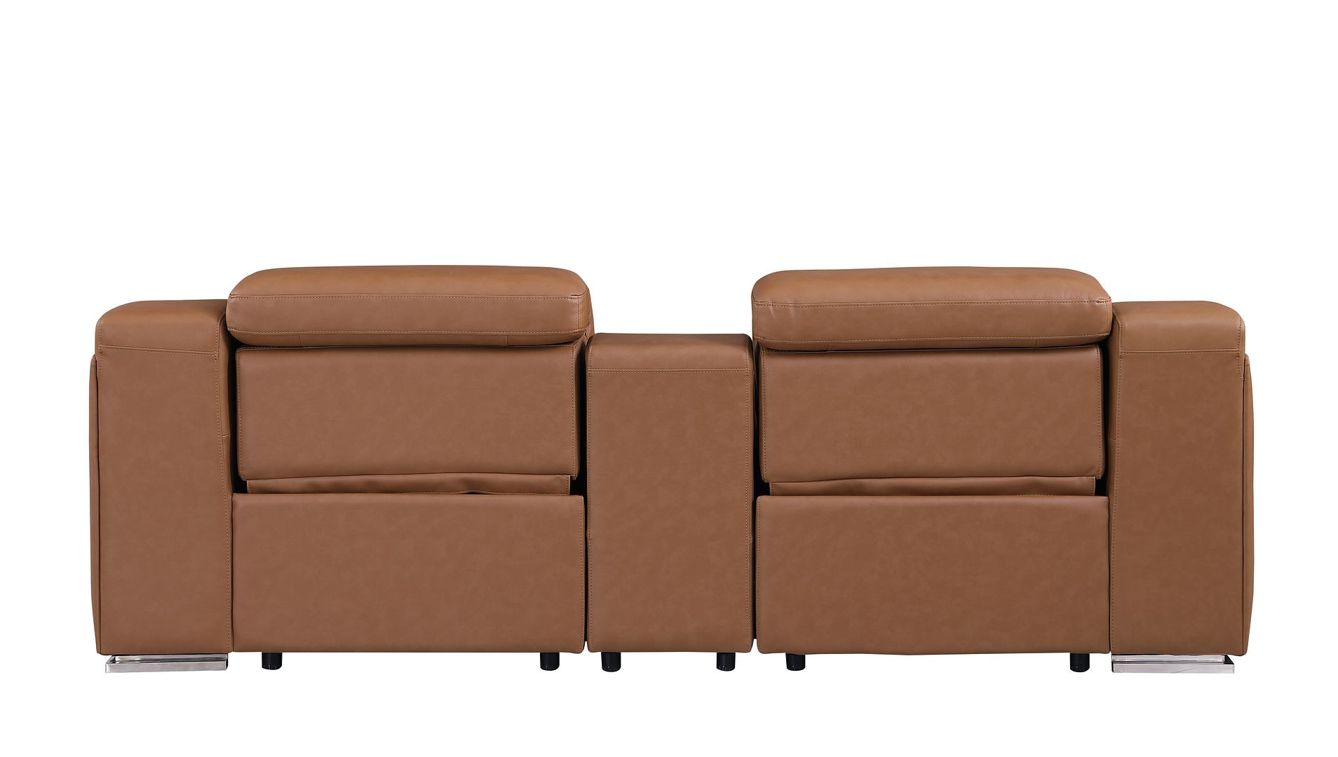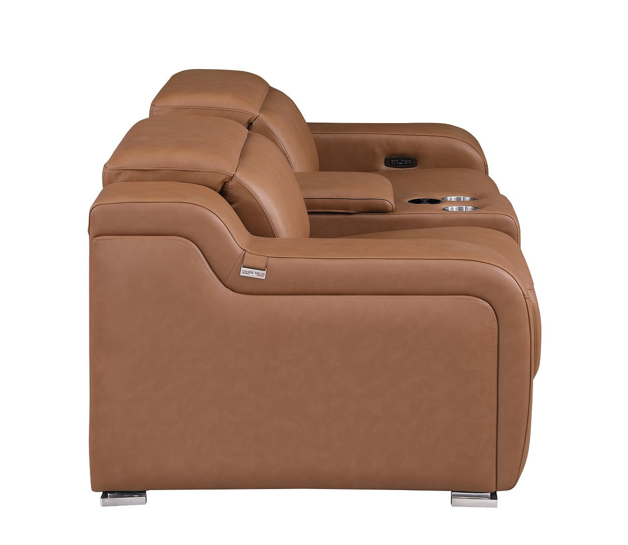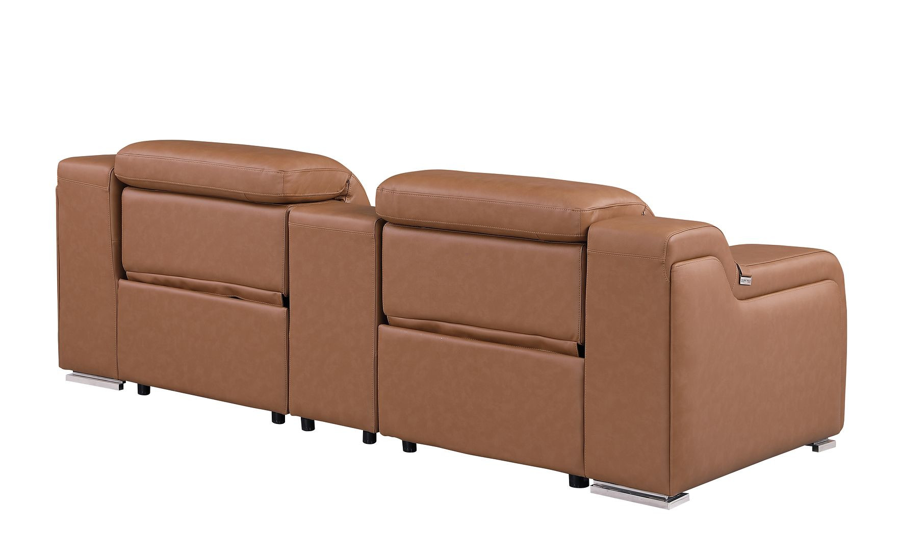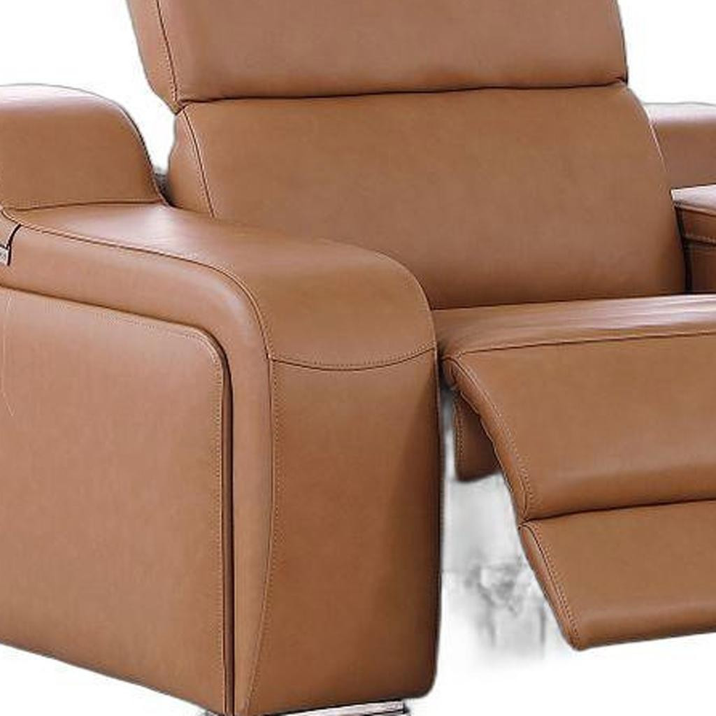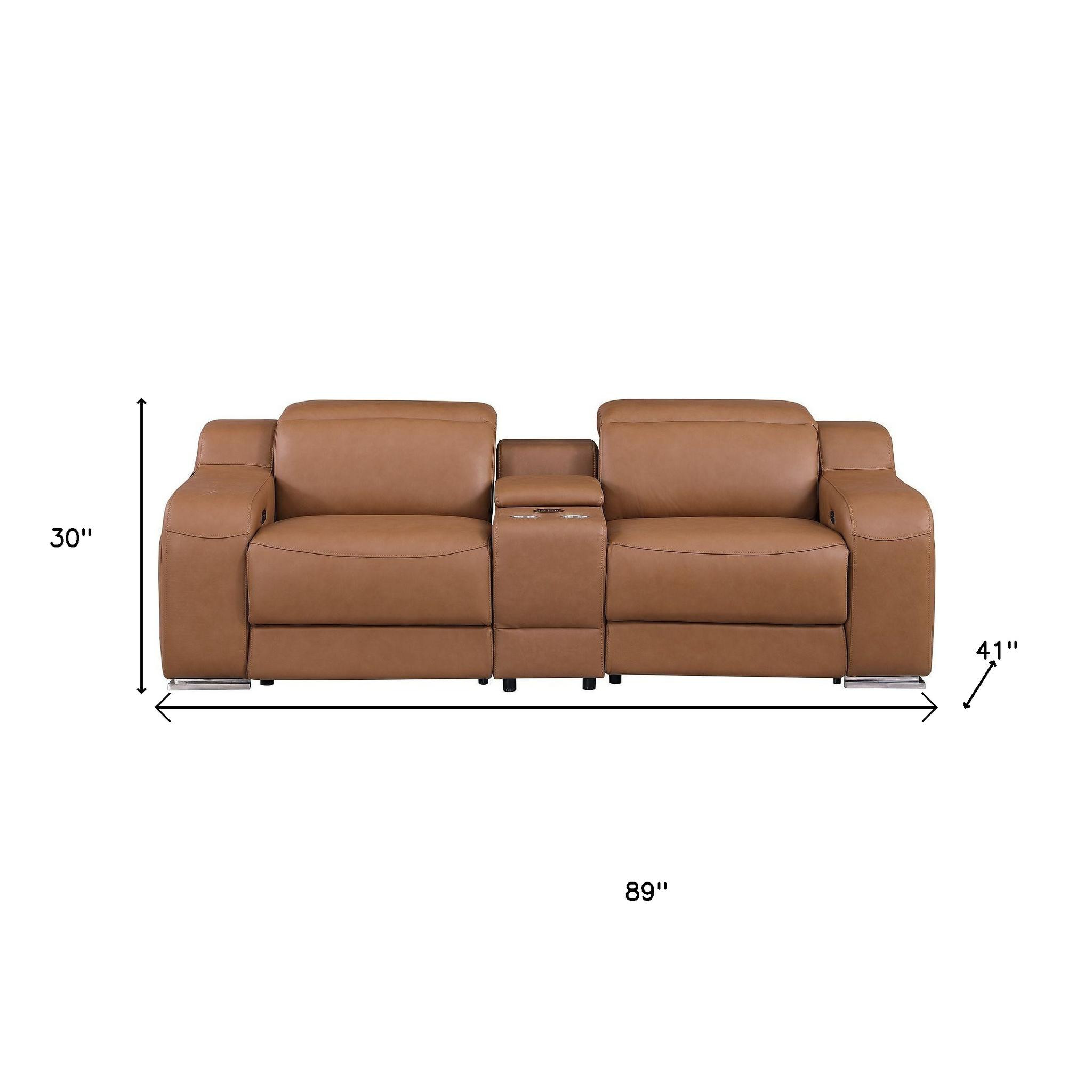Made of top quality, supple leather, this 89-inch cognac and silver italian leather power reclining loveseat with storage will be the star of your space. The high grade premium leather used makes your lounging luxuriously comfortable and adds an elegant appeal to your space. Square arms offer a comfy place to rest and give this piece some interest and shape. Silver steel legs effortlessly elevate the room and add a touch of contemporary design. A great showpiece for your room, this sofa is a must have. 30.00-inch h x 89.00-inch w x 41.00-inch d.