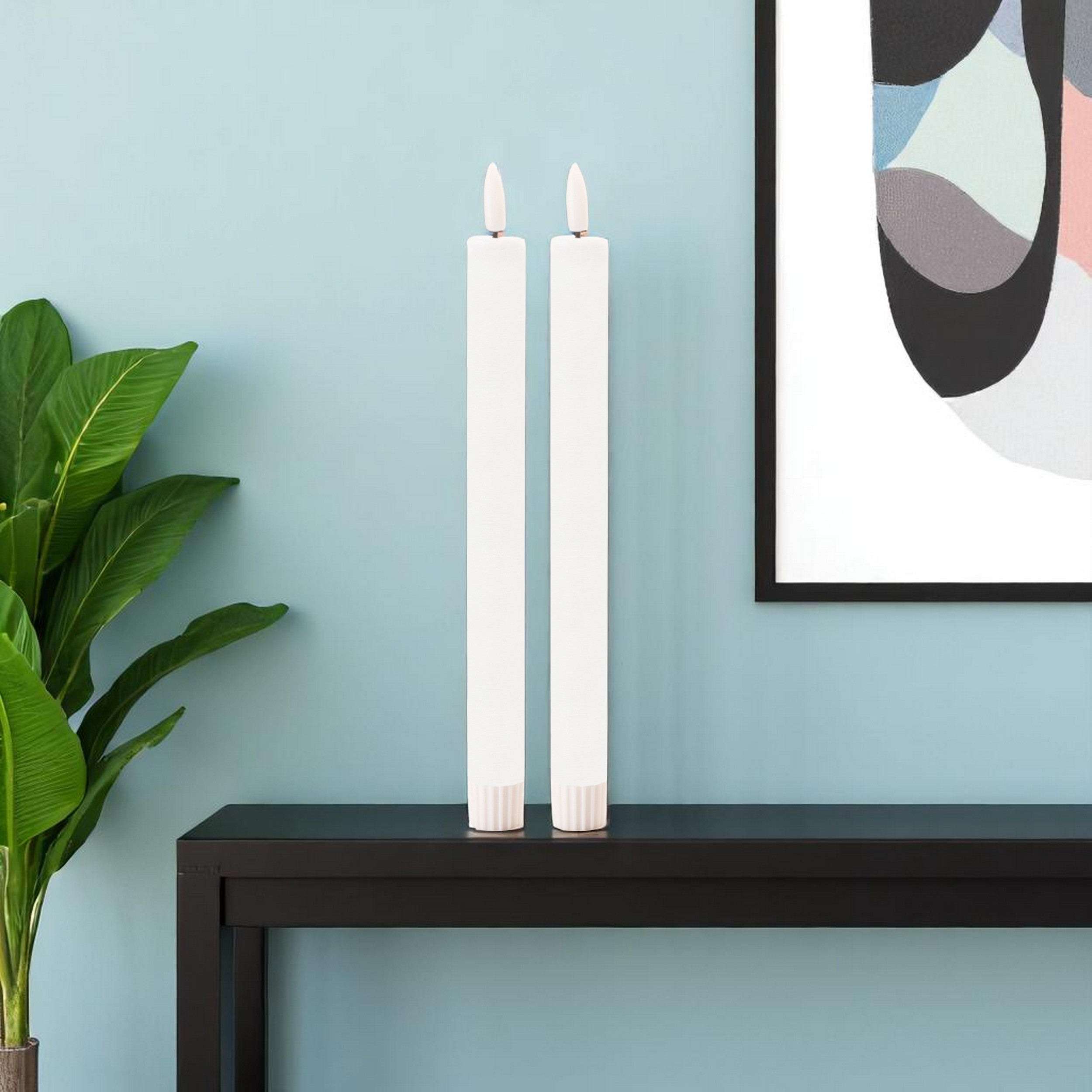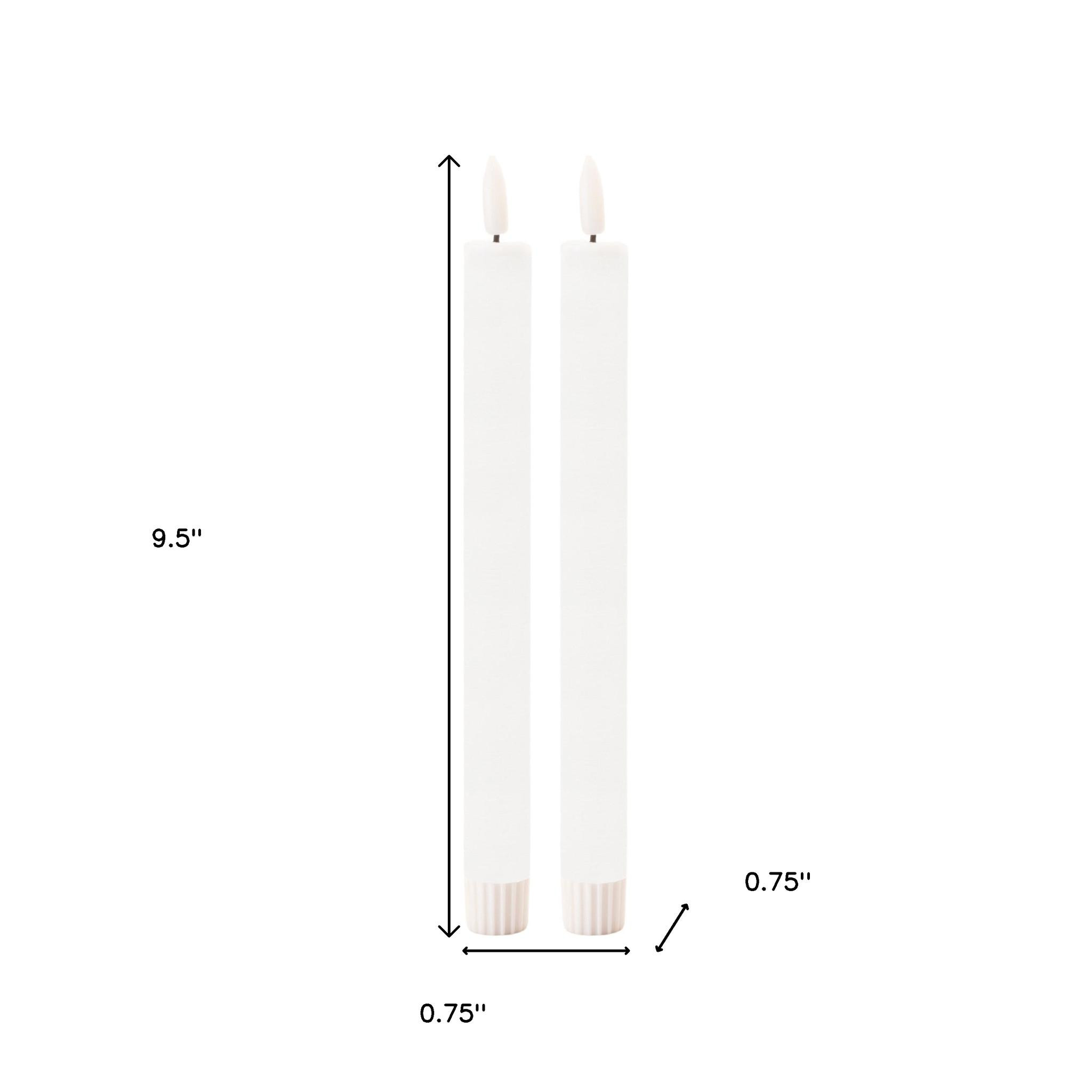Whether it's a romantic dinner, a relaxing bath, or a special celebration, this set of two white unscented candle flameless taper candles is the perfect complement to any occasion. Whether you're hosting a formal dinner party or creating a romantic atmosphere, our taper candle sets the stage for unforgettable moments. Using modern technology, this flameless candle gives mesmerizing ambiance of a flickering candle. Let the warm glow of candlelight create an intimate and welcoming ambiance for your guests or a soothing atmosphere for yourself. 9.50-inch h x 0.75-inch w x 0.75-inch d.