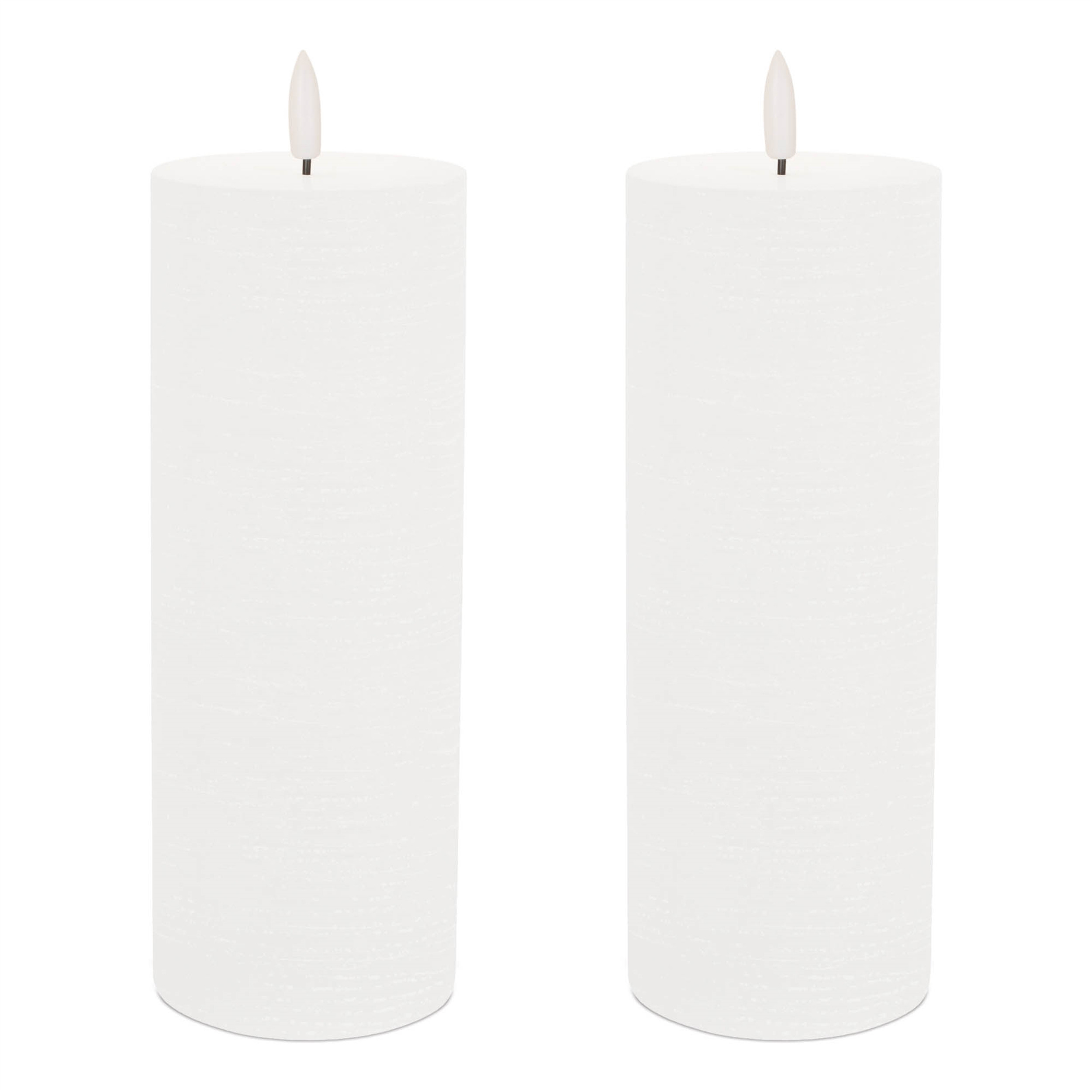 Don't miss out on the enchantment of candlelight. Embrace the convenience and beauty of this set of two white unscented candle flameless pillar candles today. The classic shape makes this pillar candle a versatile addition to any decor style, whether it's traditional, contemporary, or modern. Using modern technology, this flameless candle gives mesmerizing ambiance of a flickering candle. Let the warm glow of candlelight create an intimate and welcoming ambiance for your guests or a soothing atmosphere for yourself. 8.00-inch h x 3.00-inch w x 3.00-inch d.