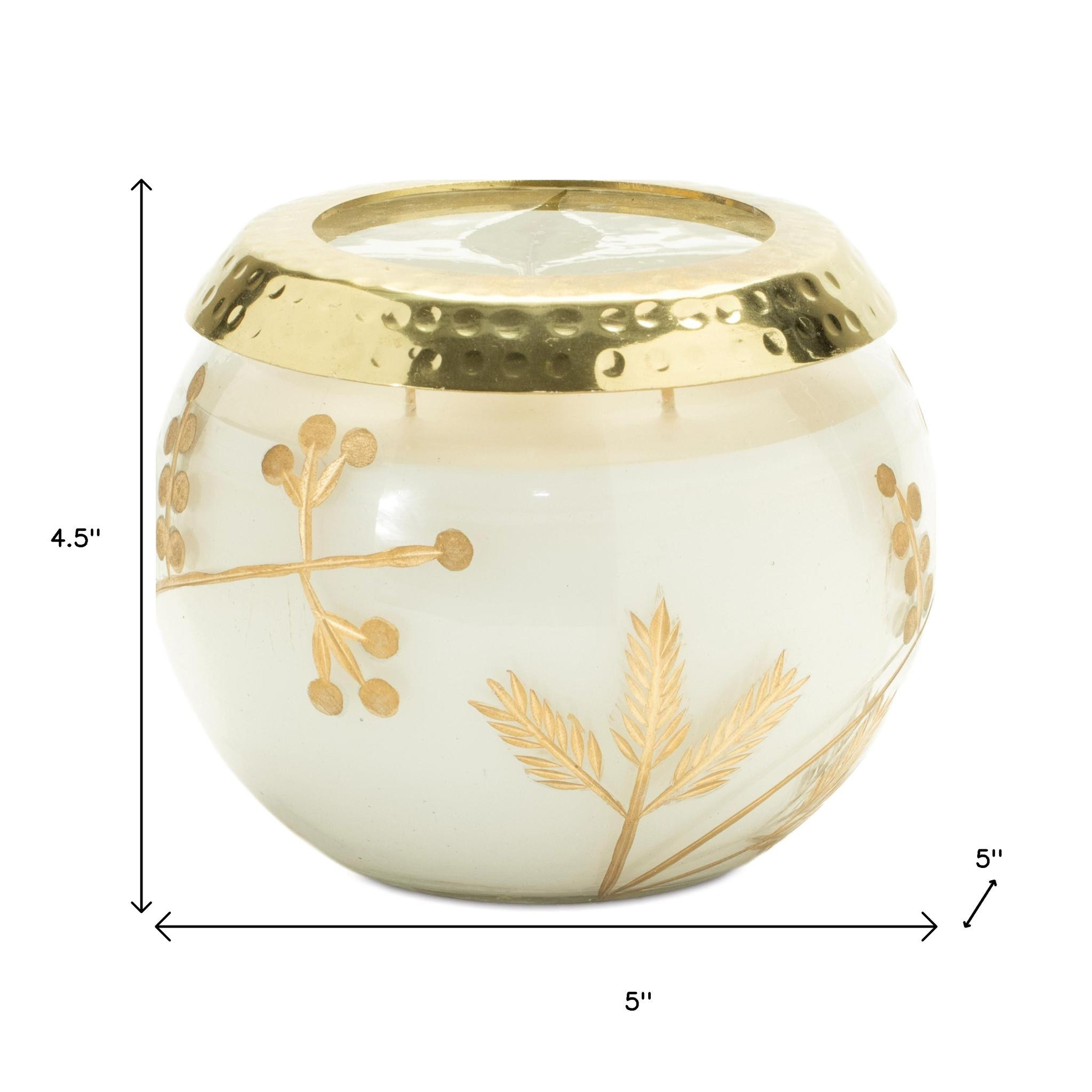 Whether it's a romantic dinner, a relaxing bath, or a special celebration, this 5-inch white juniper scented two wick candle in clear and gold glass leaf holder is the perfect complement to any occasion. This designer candle is a stunning blend of form and function that adds a touch of elegance and sophistication to any space. Filled with high quality paraffin for a nice long burn, this juniper scented candle is versatile and can be appreciated by many people. Includes a glass holder to complete the look that features gold etched botanical leaf design and a coordinating lid. Let the warm glow of candlelight create an intimate and welcoming ambiance for your guests or a soothing atmosphere for yourself. 4.50-inch h x 5.00-inch w x 5.00-inch d.